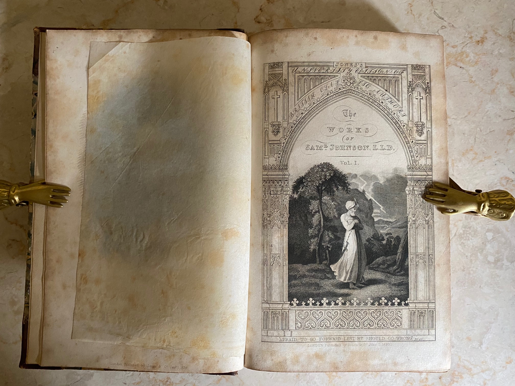 The Works of Samuel Johnson, LL.D. with an Essay On His Life and Genius | The Lives of the English Poets | Volumes I; II and III [Three Volumes Complete] Murphy, Arthur [Samuel Johnson 1709-1784] (Book #ID 119809) Published by Jones & Company 3 Acton Place, Kingsland Road, London 1825. 1825. Uniform matching hard back binding in contemporary quarter calf, marble paper sides, spines divided into six panels, gilt lettered in the second, and fourth, small tools to the others. 8vo. 8½'' x 5½''. Contents: Volume I: tissue-guarded frontispiece, additional illustrated title, (xl), viii, 351, vii, 111 pp and full-page plates; Volume II: illustrated title, v, 687 pp; Volume III: (ii), 363 pp. Edward Bovill coat of arms bookplate to each front paste down. Heavy volume set weighing 3 kg, extra postage will be requested over and above our default setting for destinations outside the UK. Member of the P.B.F.A. Click here to select books from the ENGLISH LITERATURE Category |