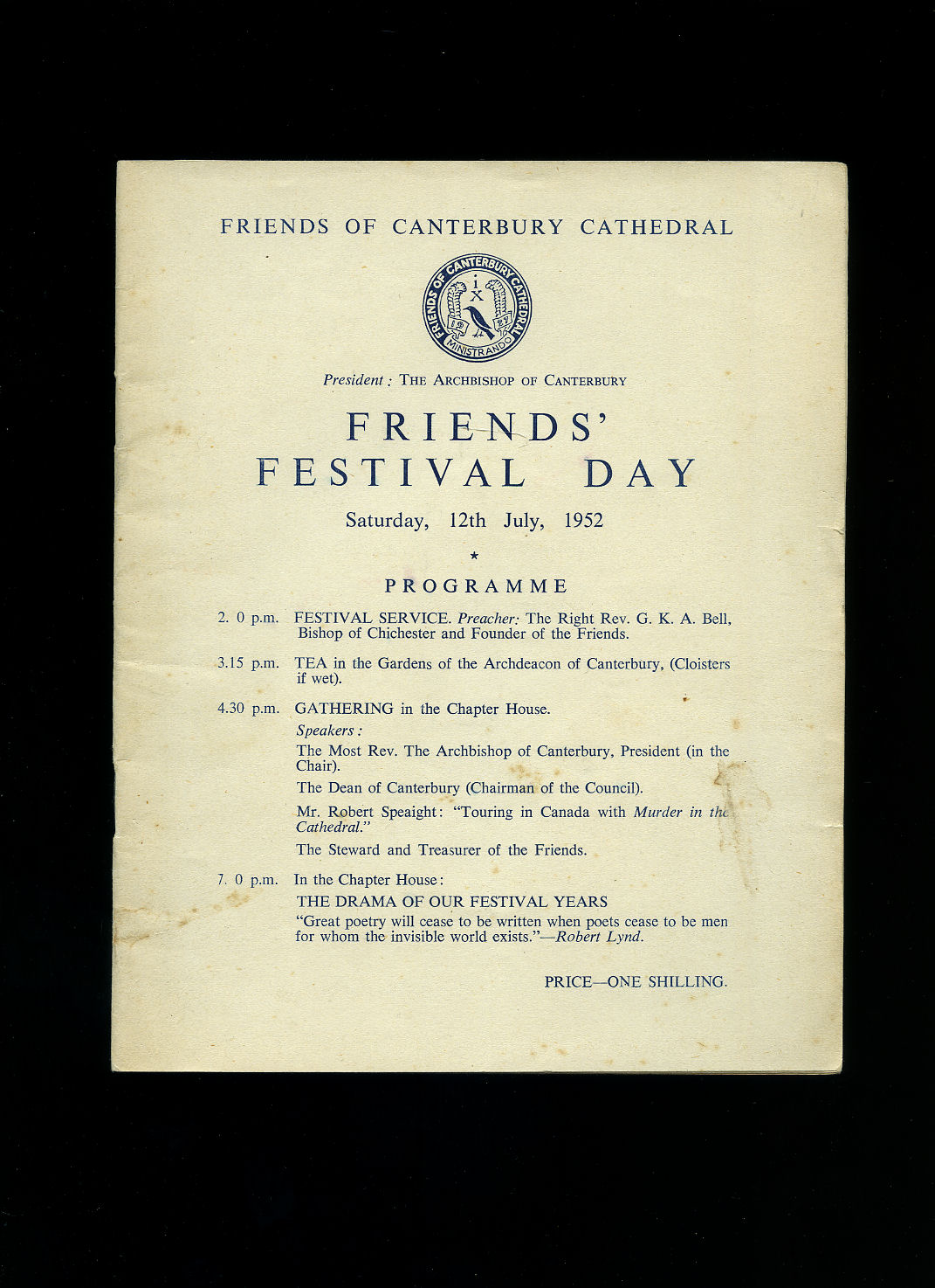 Lines by the Poet Laureate Spoken by The Bishop of Chichester | Friends of Canterbury Cathedral Festival of Music and Drama Souvenir Programme | Saturday 12th July 1952. (Book #ID 119246) J. A. Jennings Ltd., Hall Place, Harbledown, Canterbury | Saturday 12th July 1952. 1952. Publisher's original wire stitched card wrap covers (soft back). 8vo. 8½'' x 6½''. Contains 24 pp. In Very Good condition. Member of the P.B.F.A. Click here to select books from the KENT [Canterbury] Category |