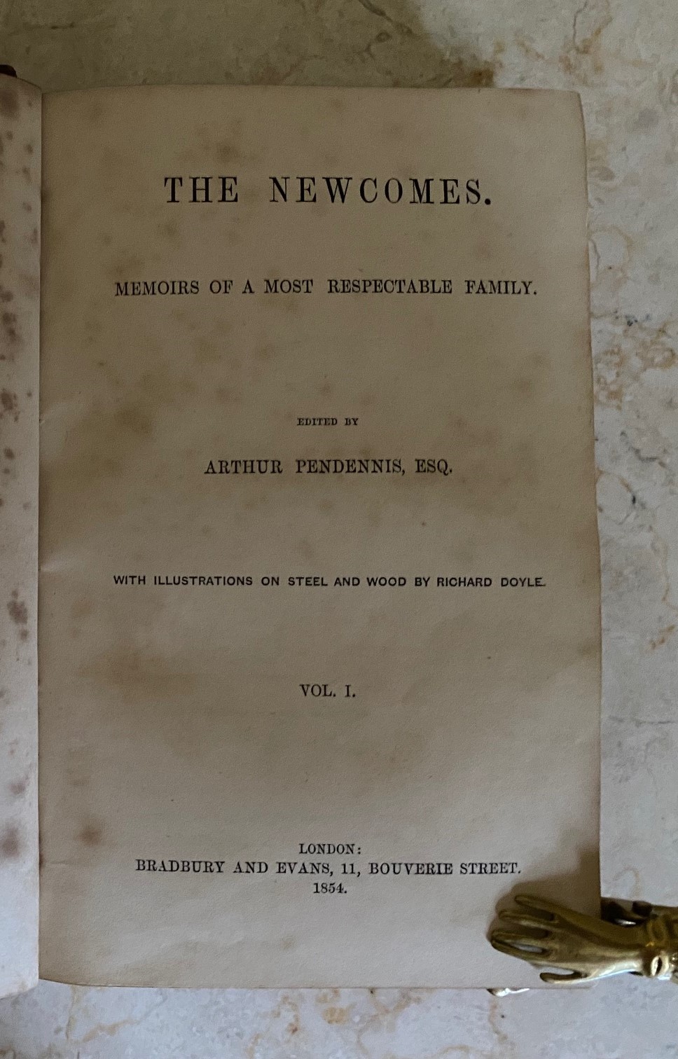 The Newcomes | Memoirs of a Most Respectable Family | Volumes I and II [Two Volumes Complete] Thackeray, W. M. [1811-1863] Edited by Arthur Pendennis [Illustrated by Richard Doyle] (Book #ID 117868) Published by Bradbury and Evans, 11 Bouverie Street, London First Editions 1854 | 1855. 1854 | 1855. A first edition of this novel by William Makepeace Thackeray, volume one being published in 1854 and volume two in 1855. Uniform matching hard back binding in publisher's original quarter red calf, red cloth covered sides, spines divided into five panels, gilt lettered in the second, and fourth, tools to the others, lemon lining papers. 8vo. 8½'' x 6''. Contains [vii], 380 pp and [viii], 375 pp with monochrome illustrations throughout. Heavy foxing to the plates, one page gathering to volume II loose and in Good condition. Member of the P.B.F.A. Click here to select books from the NINETEENTH CENTURY Category |
