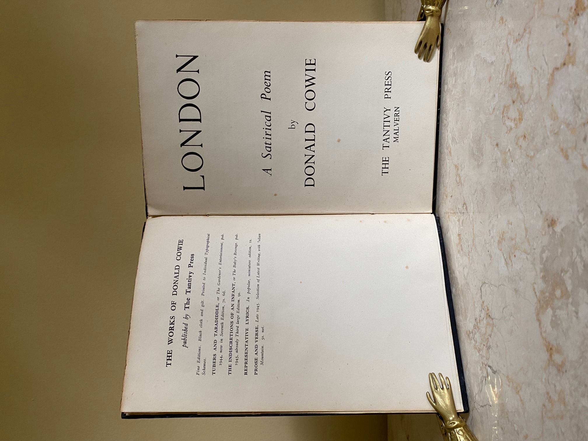 London | A Satirical Poem Cowie, Donald (Book #ID 119386) Published by The Tantivy Press, Malvern, Worcestershire First Edition 1945. 1945. First edition hard back binding in publisher's original black cloth covered boards, dulled blocked and lettered gilt back. 8vo. 9'' x 6''. Contains 55 pp. Fanshawe Prize Plate to the front paste down and in Good condition, no dust wrapper. Member of the P.B.F.A. Click here to select books from the POETRY, VERSE & RHYMES Category |