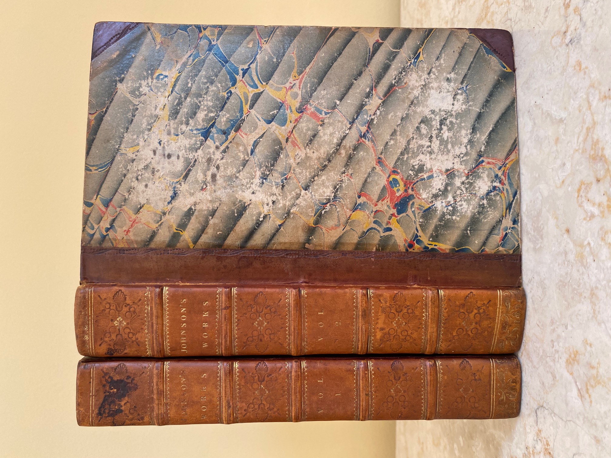 The Works of Samuel Johnson, LL.D. with an Essay On His Life and Genius | Volumes I and II [Two Volumes Complete] Murphy, Arthur [Samuel Johnson 1709-1784] (Book #ID 117870) Published by Jones & Company 3 Acton Place, Kingsland Road, London 1825. 1825. Uniform matching hard back binding in contemporary quarter calf, marble paper sides, spines divided into six panels, gilt lettered in the second, and fourth, small tools to the others. 8vo. 8½'' x 5½''. Contains Volume I: tissue-guarded frontispiece, additional illustrated title, (xl), viii, 351, vii, 111 pp and full-page plates; Volume II: illustrated title, v, 687 pp. Edward Bovill coat of arms bookplate to each front paste down. Member of the P.B.F.A. Click here to select books from the BIO (Résumé, Memoir) Category |