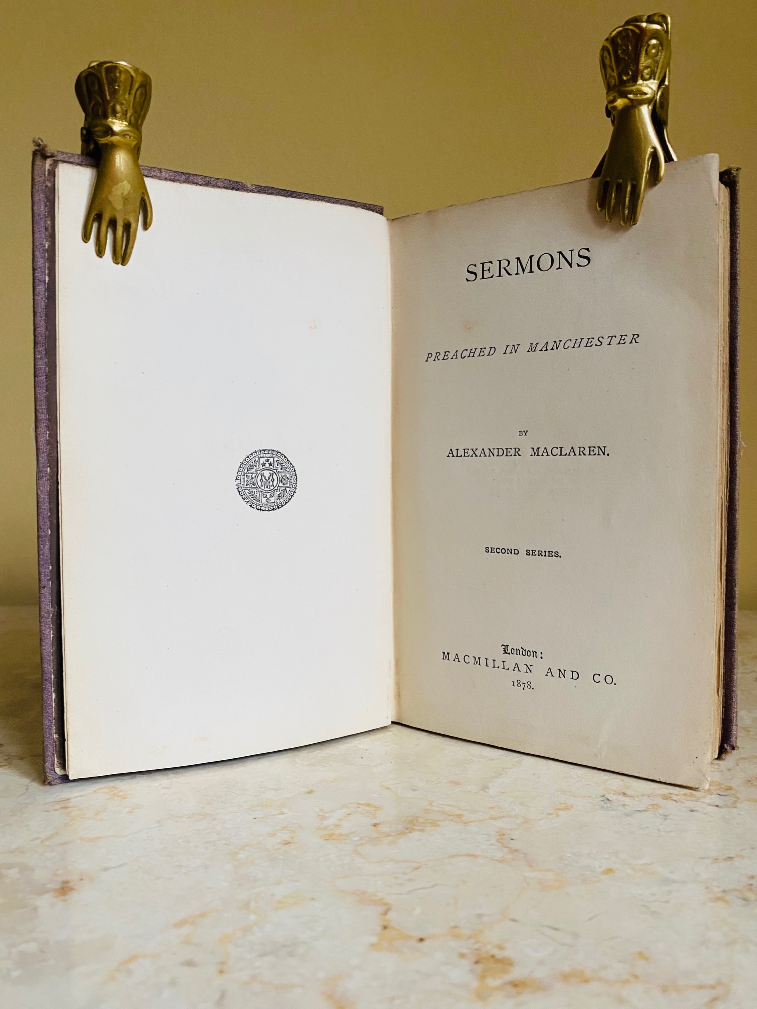 Sermons Preached in Manchester | Second Series (1878) Maclaren, Alexander (1826-1910) Scottish Baptist Minister (Book #ID 119893) Published by Macmillan and Co., London First Edition 1878. 1878. First edition hard back binding in publisher's original violet cloth covered boards, blocked and lettered gilt back conker brown lining papers. 18mo. 6½'' x 4½''. Contains (vi), 336 pp. Old dry damp surface marks to the boards, spine sun faded, related notes in pencil to the margins of the Contents pages and in Good condition, no dust wrapper. Member of the P.B.F.A. Click here to select books from the THEOLOGY & RELIGION Category |