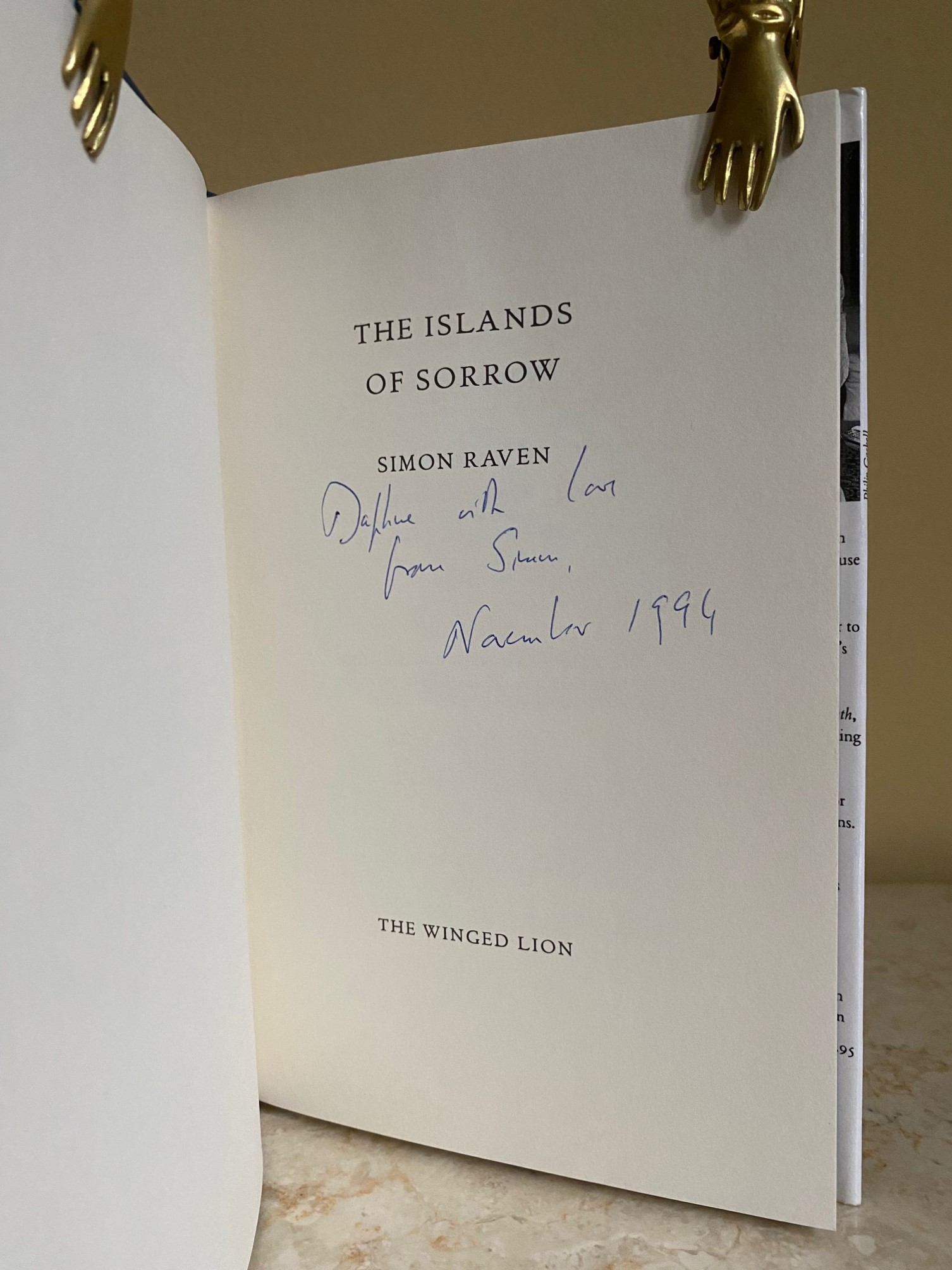 The Islands of Sorrow (Author Twice Signed) Raven, Simon [Simon Arthur Noël Raven (28 December 1927 - 12 May 2001) was an English author, playwright, essayist, television writer, and screenwriter]. (Book #ID 119815) Published by The Winged Lion 22 Shaa Road, Acton, London First Edition 1994. 1994. First edition hard back binding in publisher's original blue cloth covered boards, blocked and lettered gilt back, pale lavender lining sheets. 8vo. 8½'' x 5¾''. Raven's collection of Venetian tales. Contains 80 pp. SIGNED by the author o the title page 'Daphne with love from Simon, November 1994' also flat SIGNED by him to the half-title 'Simon Raven'. Fine condition book in Fine condition dust wrapper, not price clipped, £12.95. Member of the P.B.F.A. Click here to select books from the MODERN FIRST EDITIONS Category |