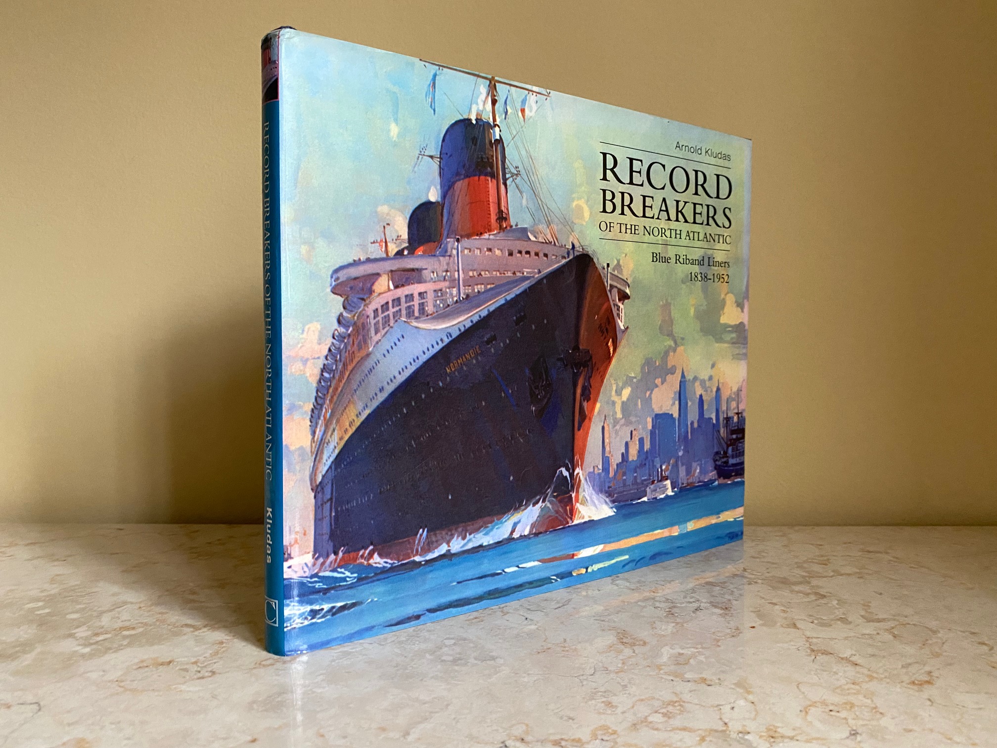 First edition hard back binding in publisher's original navy cloth covered boards, blocked and lettered gilt back, detailed colour illustrated cross section lining papers. Landscape. 10'' x 12¼''. Contains 159 pp with thirty-five drawings of all the Blue Riband ships by Dietmar Borchert and many black and white photographs throughout. Fine condition book in Fine condition dust wrapper, not price clipped, £25.00. Member of the P.B.F.A.