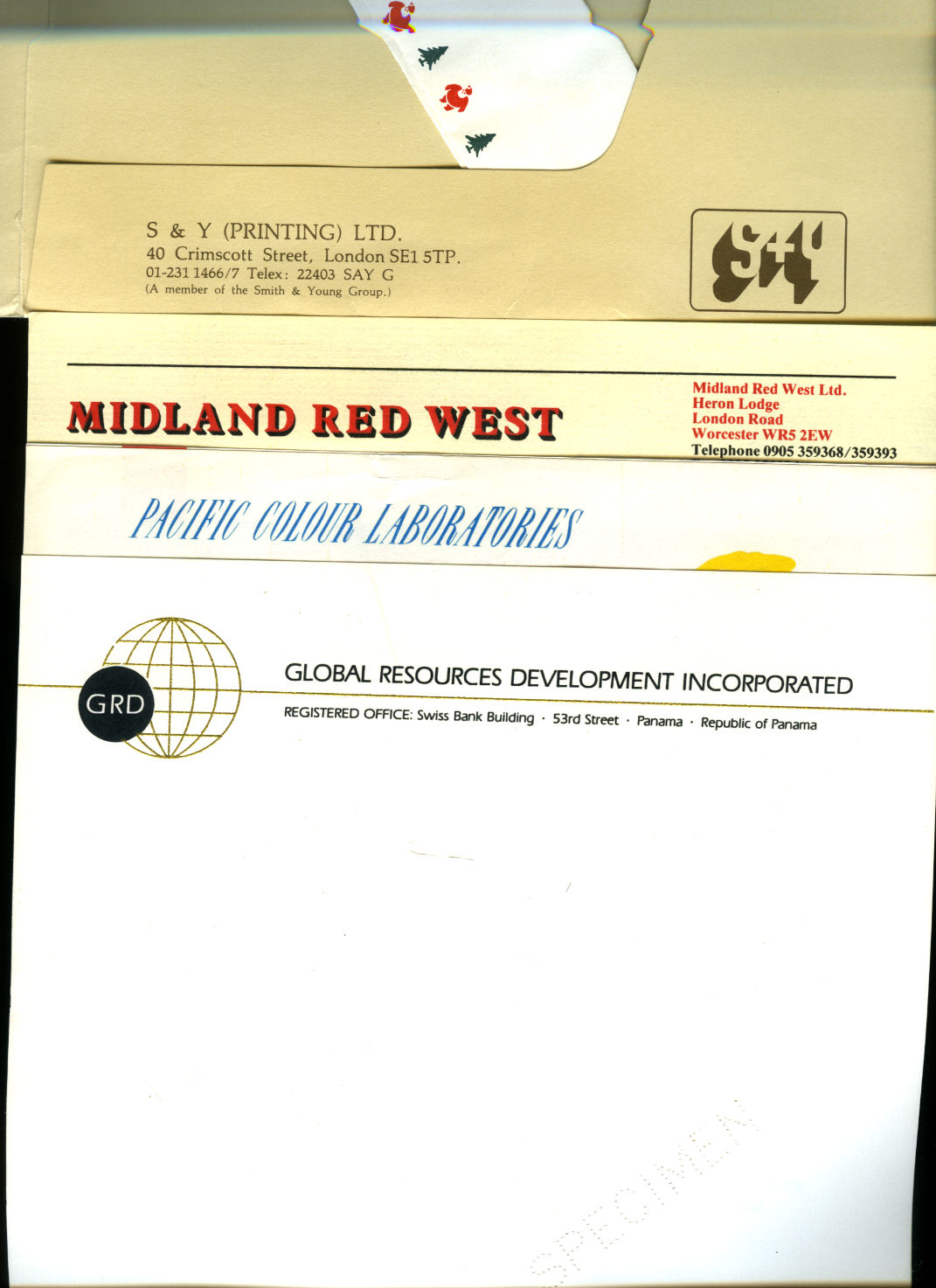 S. & Y. [Smith & Young] Thermographic Printing Specimens Brochure | Fine diestamping at its best | Smith and Young Engraved Stationery S. & Y. [Smith & Young] Printing Ltd., (Book #ID 100430) Printed by S. & Y. [Smith & Young] Printing Ltd., 40 Crimscott Street, London. S. & Y. [Smith & Young]. Printing. Original plain card wrap covers [soft back] folder. 4to. 12'' x 8¾''. Containing different specimens of printed paper. In near Fine condition. Member of the P.B.F.A. Click here to select books from the BOOKS (Binding, Collecting, Printing, Paper) Category |