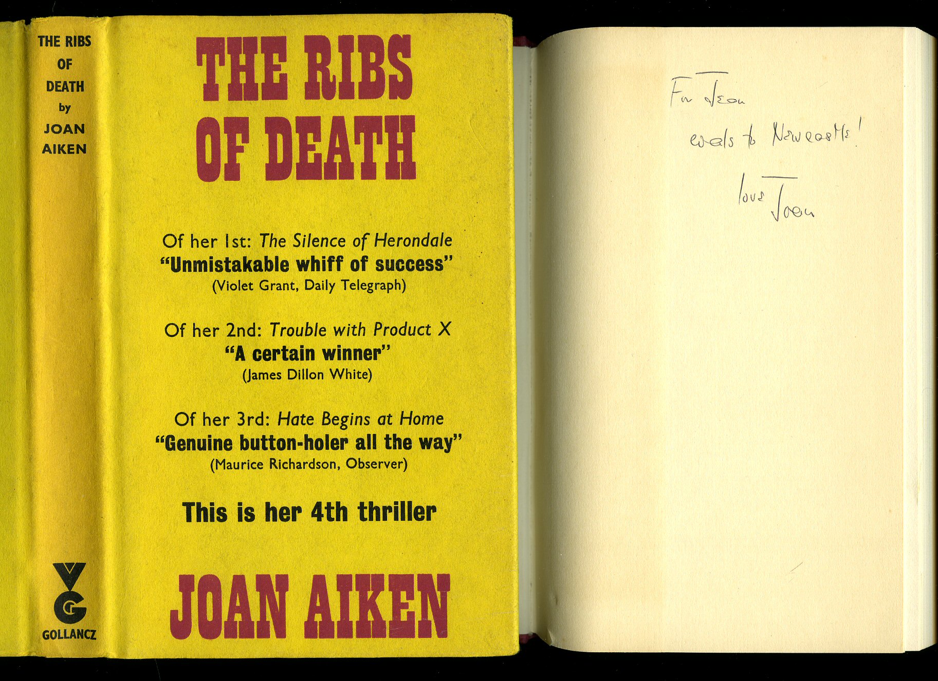 The Ribs of Death [Signed] Aiken, Joan [1924-2004] (Book #ID 16275) Published by Victor Gollancz Ltd., 14 Henrietta Street, Covent Garden, London First Edition 1967. 1967. First edition hard back binding in publisher's original cerise paper covers, gilt lettering to spine. 8vo 8" x 5¼" 224 pp. SIGNED presentation copy by the author to front end paper 'For Jean ? Love Joan.' Without inscription. Fine in Very Good dust wrapper with light dust soiling to yellow covers, spine not faded, not price clipped 21/-. Dust wrapper supplied in archival acetate film protection. Member of the P.B.F.A. Click here to select books from the DETECTIVE | CRIME FICTION Category |