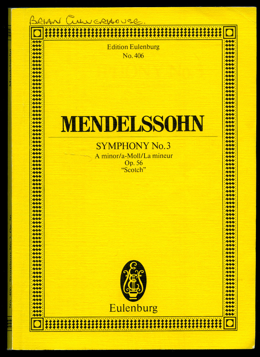 Mendelssohn Symphony No. 3 in A minor (A-Moll), Op. 56 "Scotch" | Full Miniature Score | Eulenburg Study Score Edition No. 406 Mendelssohn Bartholdy, Felix (1809-1847) Foreword by Roger Fiske (Book #ID 114320) Published by Ernst Eulenburg & Co. Ltd., 48 Great Marlborough Street, London | Zürich GmbH | Mainz GmbH | New York 1976. 1976. Publisher's original classic banana yellow and black livery stiff card wrap covers [soft back]. 8vo. 7½'' x 5¼''. Contains 168 pp score. In Very Good condition, no dust wrapper as issued. From the private library of Brian Culverhouse (22nd October 1927 - 23rd August 2021) who was a leading and much admired classical music producer throughout the second half of the 20th century, initially associated with EMI, with his name to the front cover 'Brian Culverhouse'. Member of the P.B.F.A. Click here to select books from the MUSIC [Classical] Category |