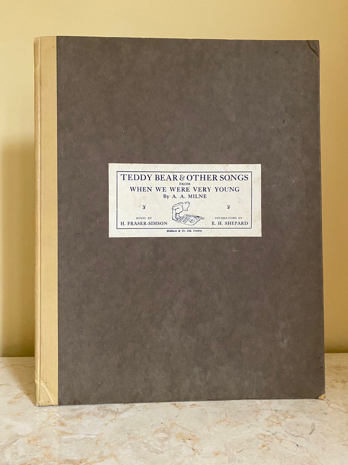 Teddy Bear and Other Songs from 'When We Were Very Young' Milne, A. A. (Words) H. Fraser-Simson (Music) E. H. Shepard (Decorations) (Book #ID 114771) Published by Methuen & Co. Ltd., 36 Essex Street, Strand, London | Ascherberg, Hopwood & Crew, Ltd., 16 Mortimer Street, London First Edition 1926. 1926. First edition hard back binding in publisher's original chocolate brown paper covered boards, linen cloth spine, blue and white paper title label to the front cover. 4to. 12¼'' x 9½''. Contains 43 pp score with lovely monochrome margin illustrations by E. H. Shepard throughout. Crossed out name dated Xmas 1927 inside the front cover, corners bumped, else in Very Good condition, no dust wrapper. Member of the P.B.F.A. Click here to select books from the MUSIC [Classical] Category |