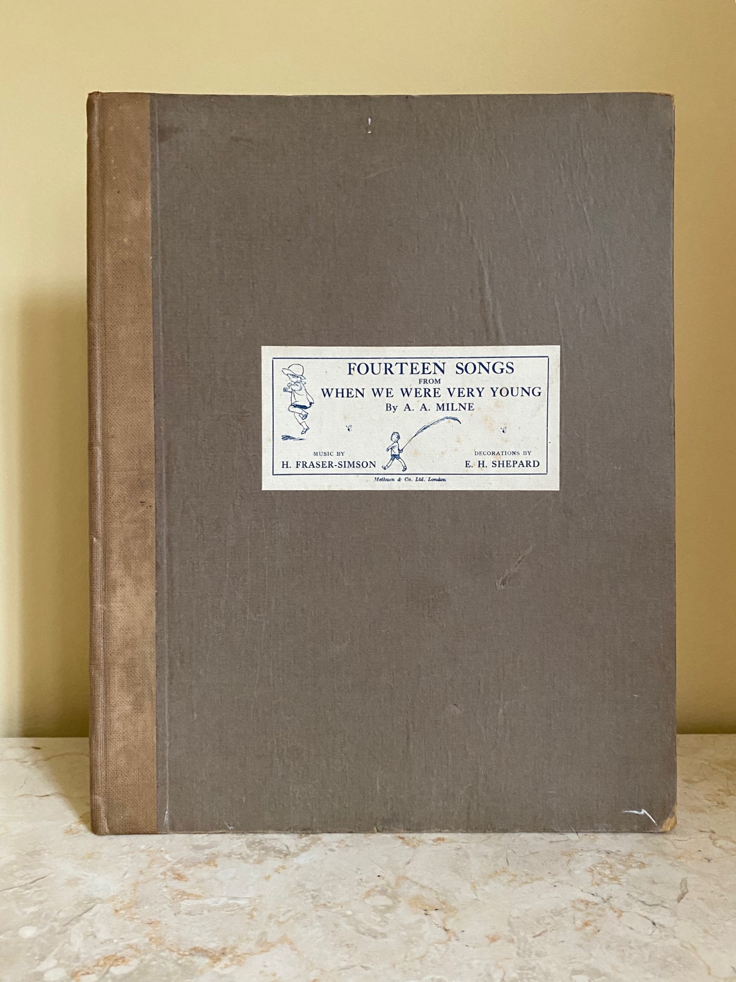 Fourteen Songs from 'When We Were Very Young' Milne, A. A. (Words) H. Fraser-Simson (Music) E. H. Shepard (Decorations) (Book #ID 114772) Published by Methuen & Co. Ltd., 36 Essex Street, Strand, London | Ascherberg, Hopwood & Crew, Ltd., 16 Mortimer Street, London Fifth Edition 1925. 1925. Hard back binding in publisher's original chocolate brown paper covered boards, linen cloth spine, blue and white paper title label to the front cover. 4to. 12¼'' x 9½''. Contains 34 pp score with lovely monochrome margin illustrations by E. H. Shepard throughout. Corners bumped, else in Very Good condition, no dust wrapper. Member of the P.B.F.A. Click here to select books from the MUSIC [Classical] Category |