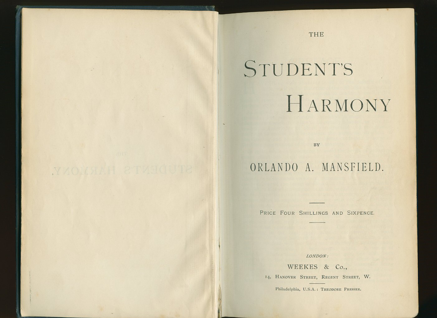 The Student's Harmony Mansfield Orlando A. [1863-1936] (Book #ID 70896) Published by Weekes & Co. 14 Hanover Street, London First Edition 1896. London 1896. First edition hard back binding in publisher's original navy blue cloth covers, gilt title and author lettering to the spine and to the upper panel. 8vo. 8½'' x 5½''. Contains [ii] 309 printed pages of text. A little rubbing to the spine ends and corners, ink name inside and in near Very Good condition, no dust wrapper. Member of the P.B.F.A. Click here to select books from the MUSIC [Classical] Category |