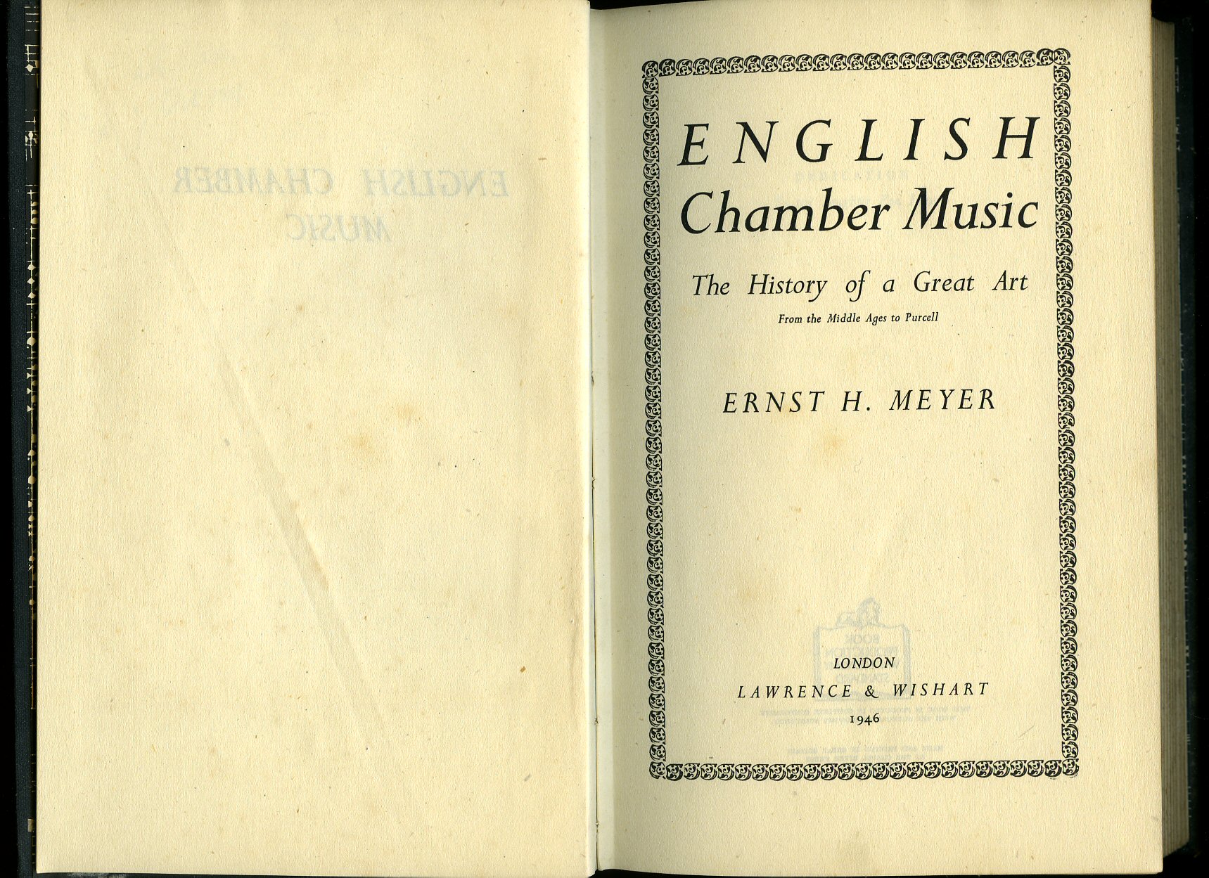 English Chamber Music; The History of a Great Art from the Middle Ages to Purcell Meyer, Ernst H. (Book #ID 87172) Published by Lawrence & Wishart, London First Edition 1946. 1946. First edition hard back binding in publisher's original black cloth covers, gilt title and author lettering to the spine, illustrated end papers. 8vo. 9'' x 6''. Contains [xiv] 318 printed pages of text with monochrome musical scores throughout. War economy standard paper, spine ends soft and scuffed, age darkening to the closed page edges and in near Very Good condition, no dust wrapper. Member of the P.B.F.A. Click here to select books from the MUSIC [Classical] Category |