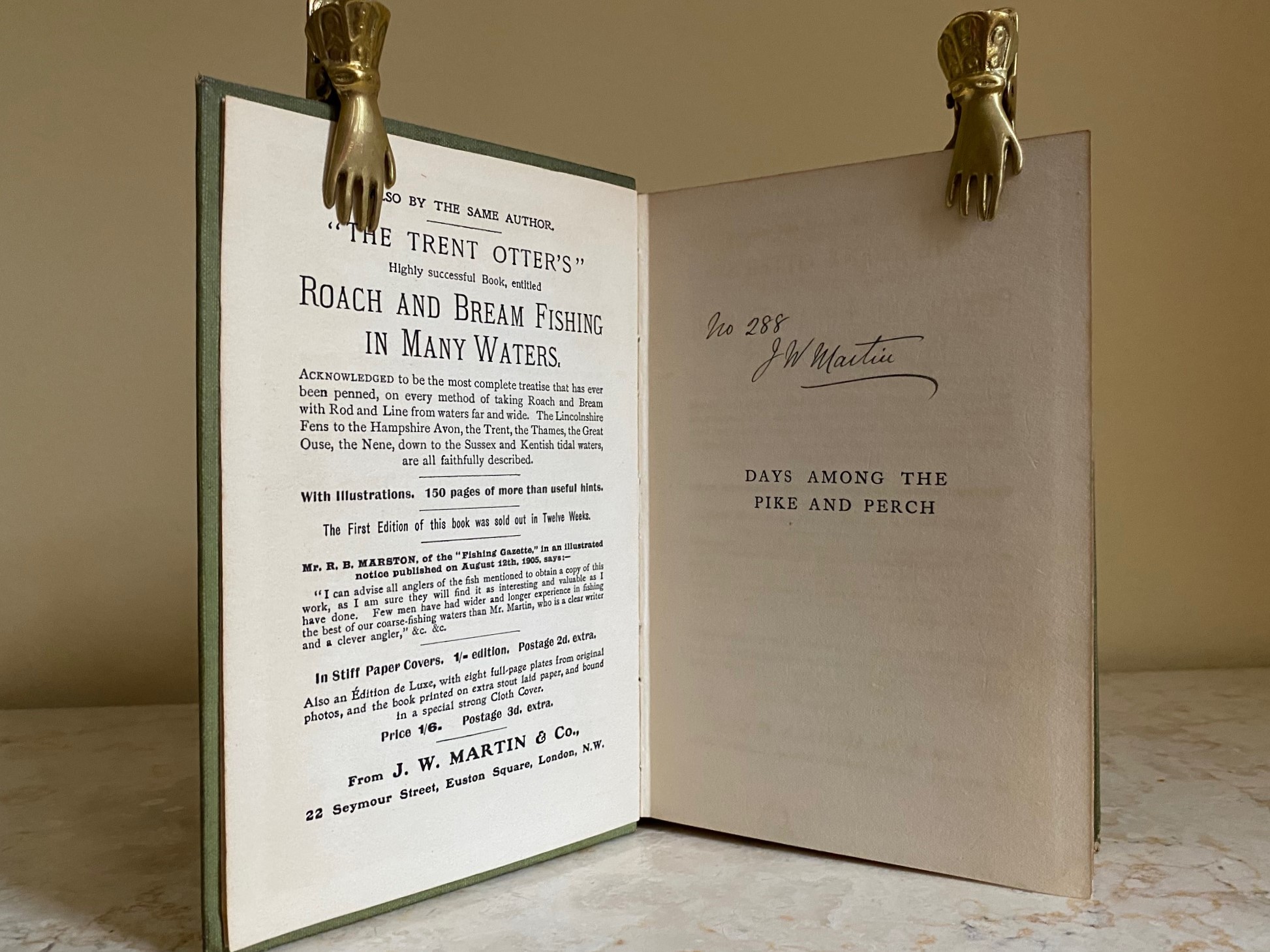 New edition entirely rewritten and enlarged hard back binding in publisher's original olive cloth covered boards, blocked and lettered gilt back, deep navy lettering and pike vignette to the front board. 8vo. 7½'' x 5¼''. Contains advertisements to the front paste down and both sides of the front free end paper, frontispiece, (xvi), 151 pp with 3 full-page single-sided plates from photographs and full-page text drawings of tackle throughout. SIGNED and numbered by the author to the half title page 'J. W. Martin No. 288'. Light rubbing to the spine ends and corners. Acetate protection. Member of the P.B.F.A.