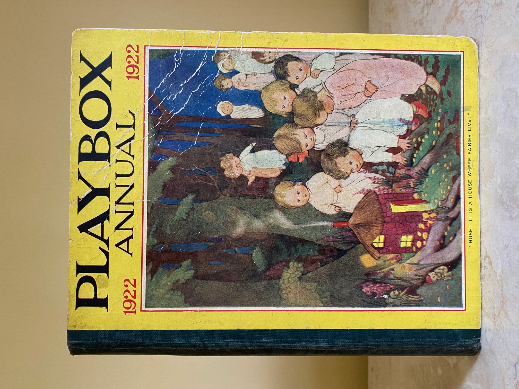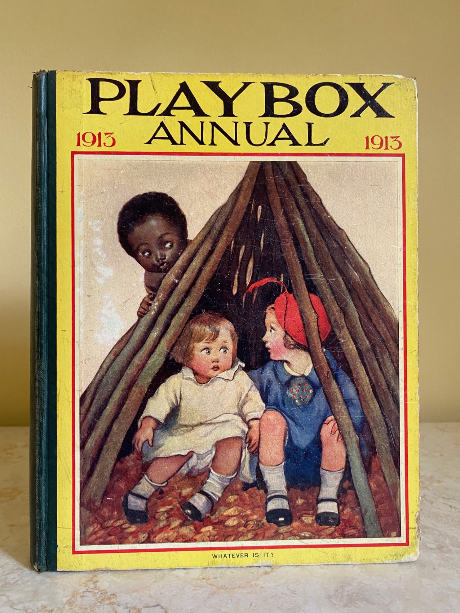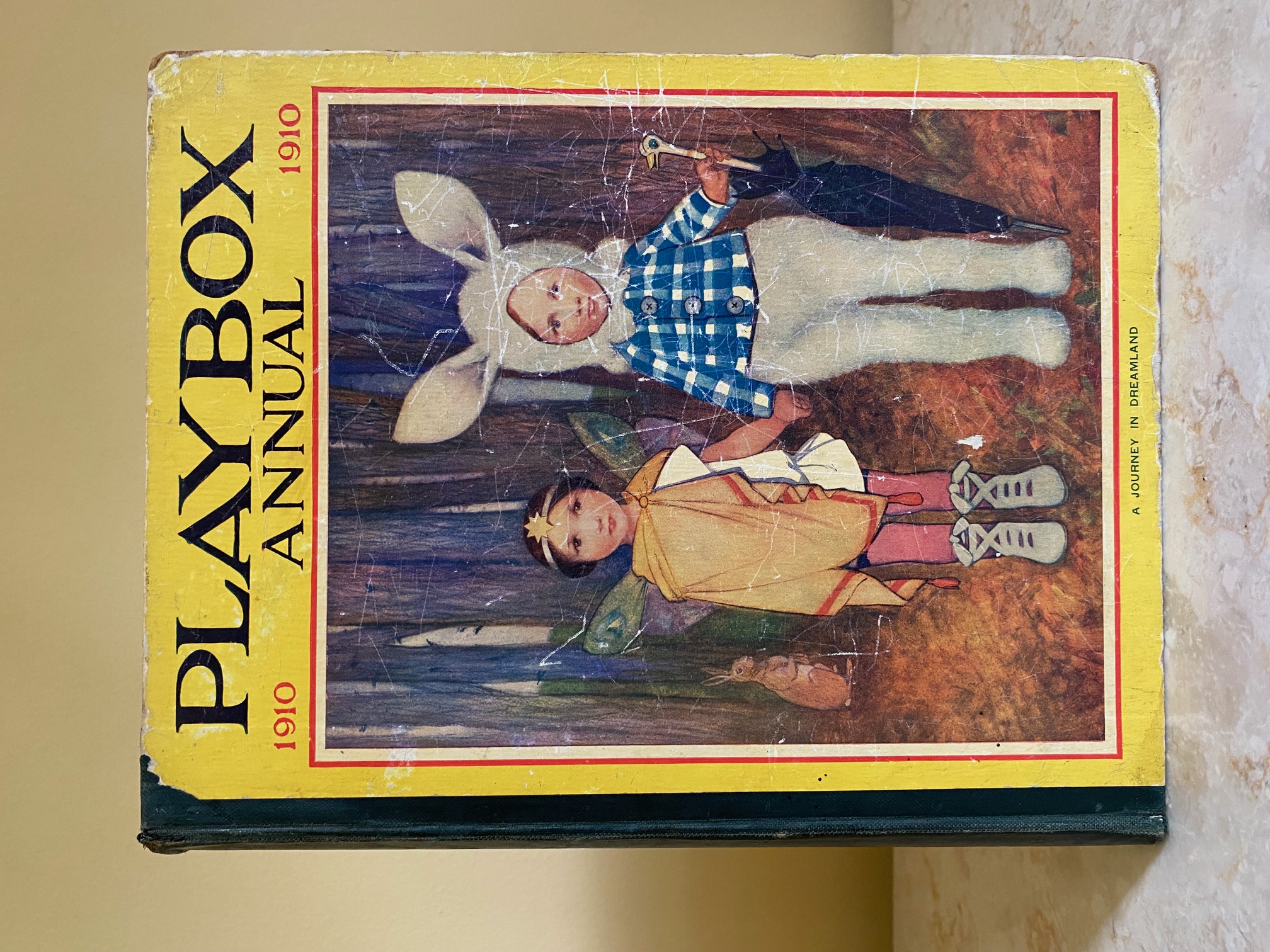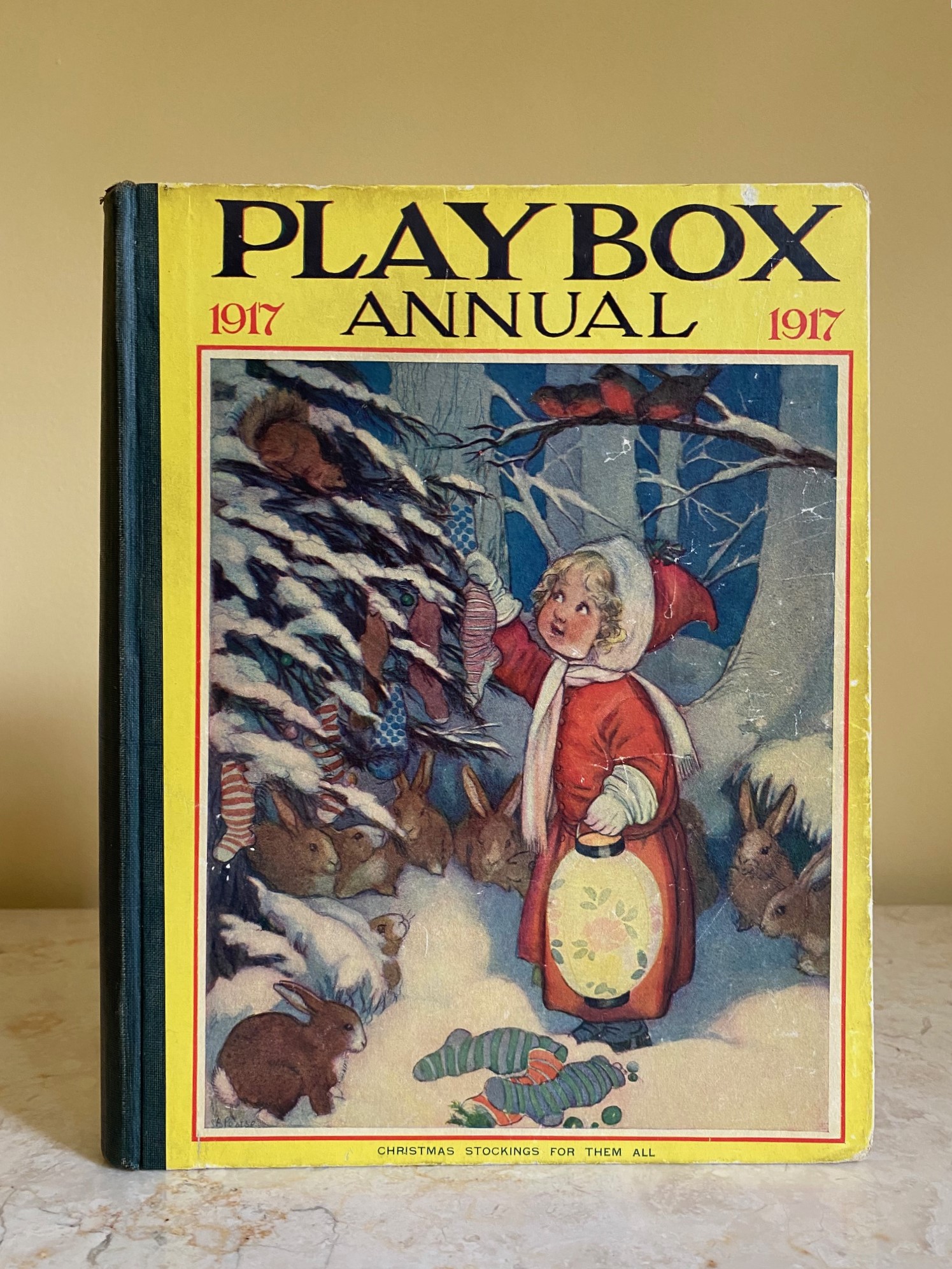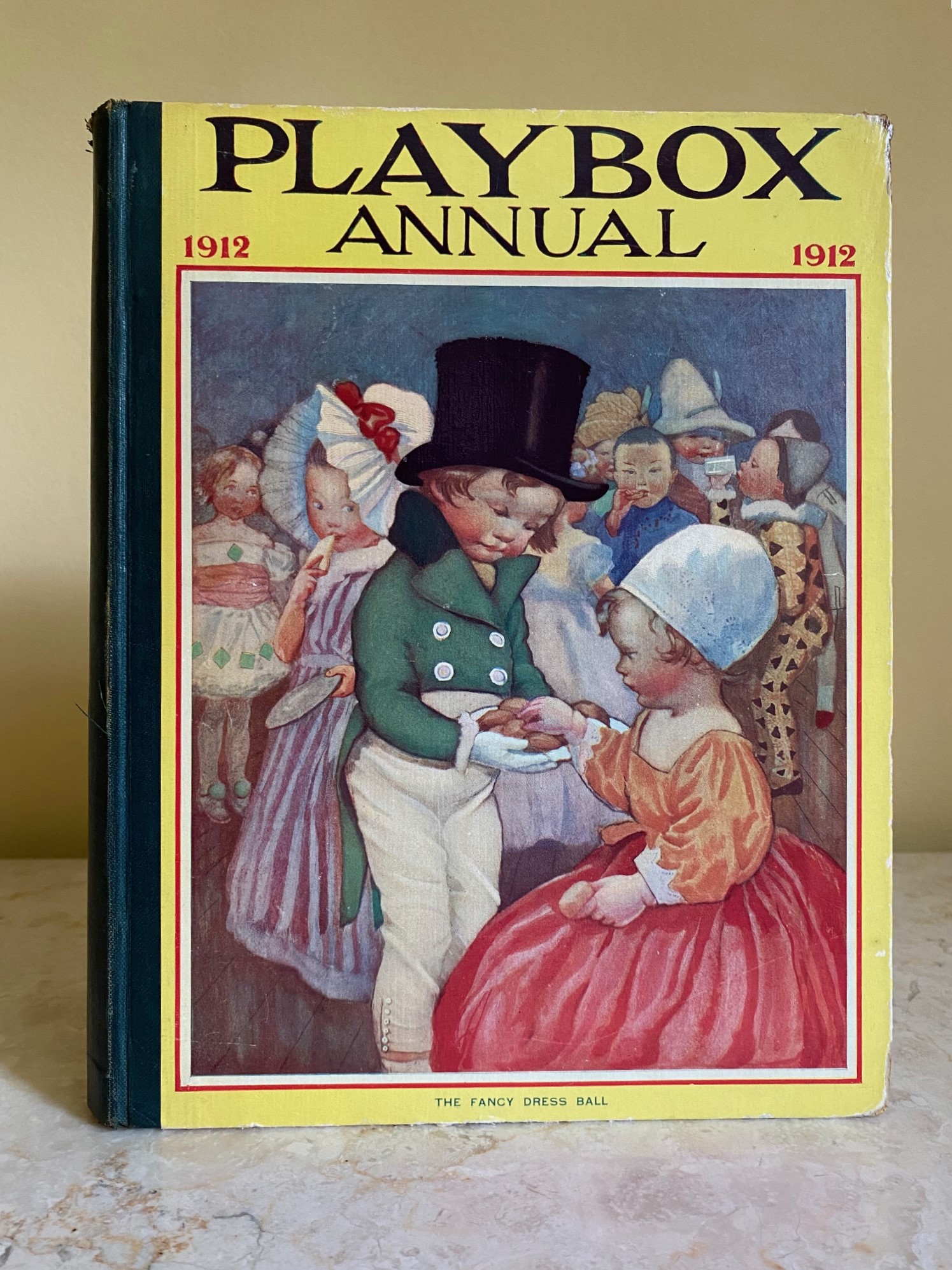 First edition hard back binding in publisher's original colour illustrated paper covered boards, emerald green thin linen cloth spine, Pears Soap advertisement to the rear cover. Quarto. 9½'' x 7¾''. Contains 208 pp with monochrome, single and twin colour illustrations and 4 full-page colour plates throughout, one of which is frayed. Ink message to the front free end paper, corners rubbed, hinges cracked and repaired. Playbox 1st series had 2 issues in 1898. Playbox 2nd series ran from 1905-1913. Playbox 3rd series (merged with Jack and Jill) ran from 1925-1955. The 2nd and 3rd series realised 48 annuals from 1909 to 1956. Member of the P.B.F.A.