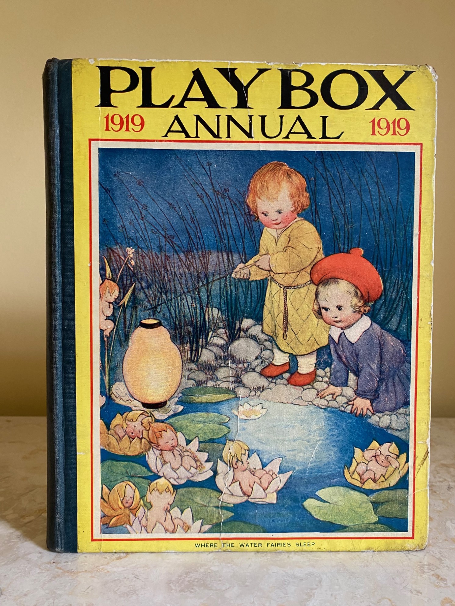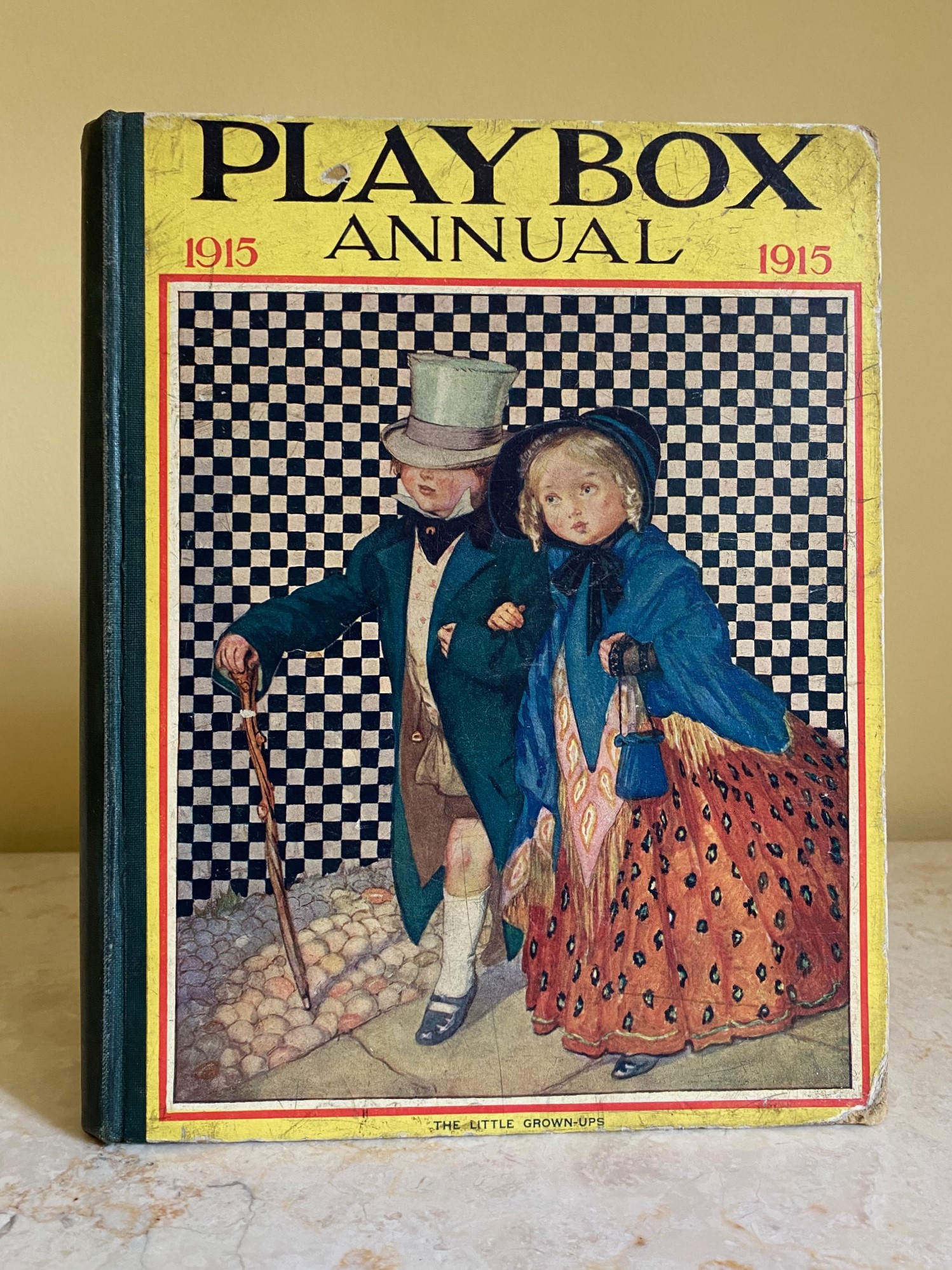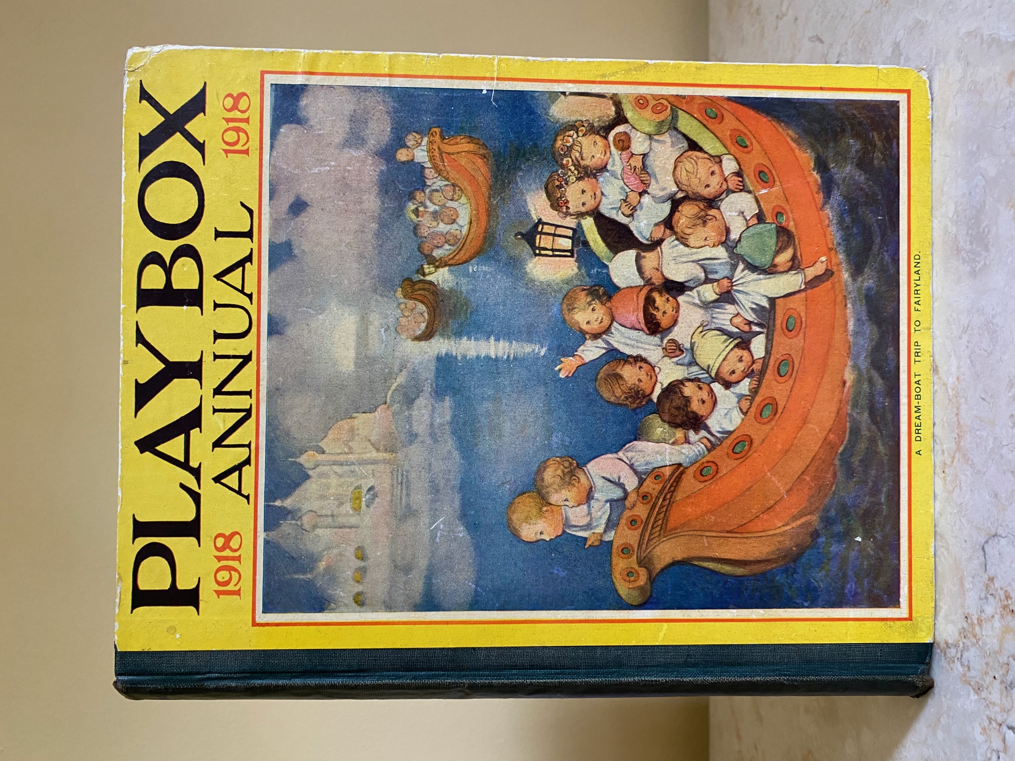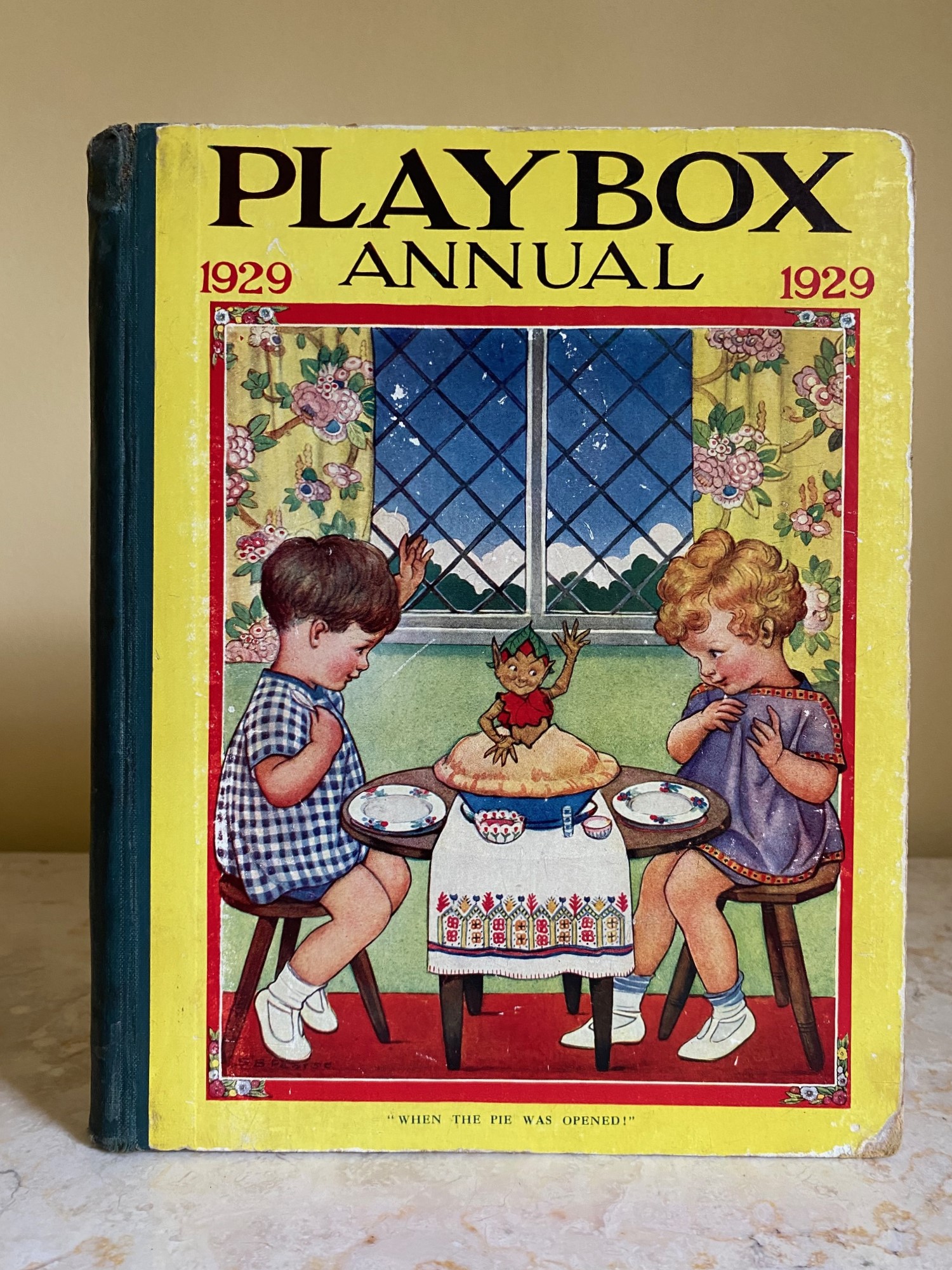First edition hard back binding in publisher's original colour illustrated paper covered boards, emerald green thin linen cloth spine, Pears Soap advertisement to the rear cover. Quarto. 9½'' x 7¾''. Contains 208 pp with monochrome, single and twin colour illustrations and 4 full-page colour plates throughout, one of which is frayed. Ink message to the front free end paper, corners rubbed, hinges cracked and repaired. Playbox 1st series had 2 issues in 1898. Playbox 2nd series ran from 1905-1913. Playbox 3rd series (merged with Jack and Jill) ran from 1925-1955. The 2nd and 3rd series realised 48 annuals from 1909 to 1956. Member of the P.B.F.A.