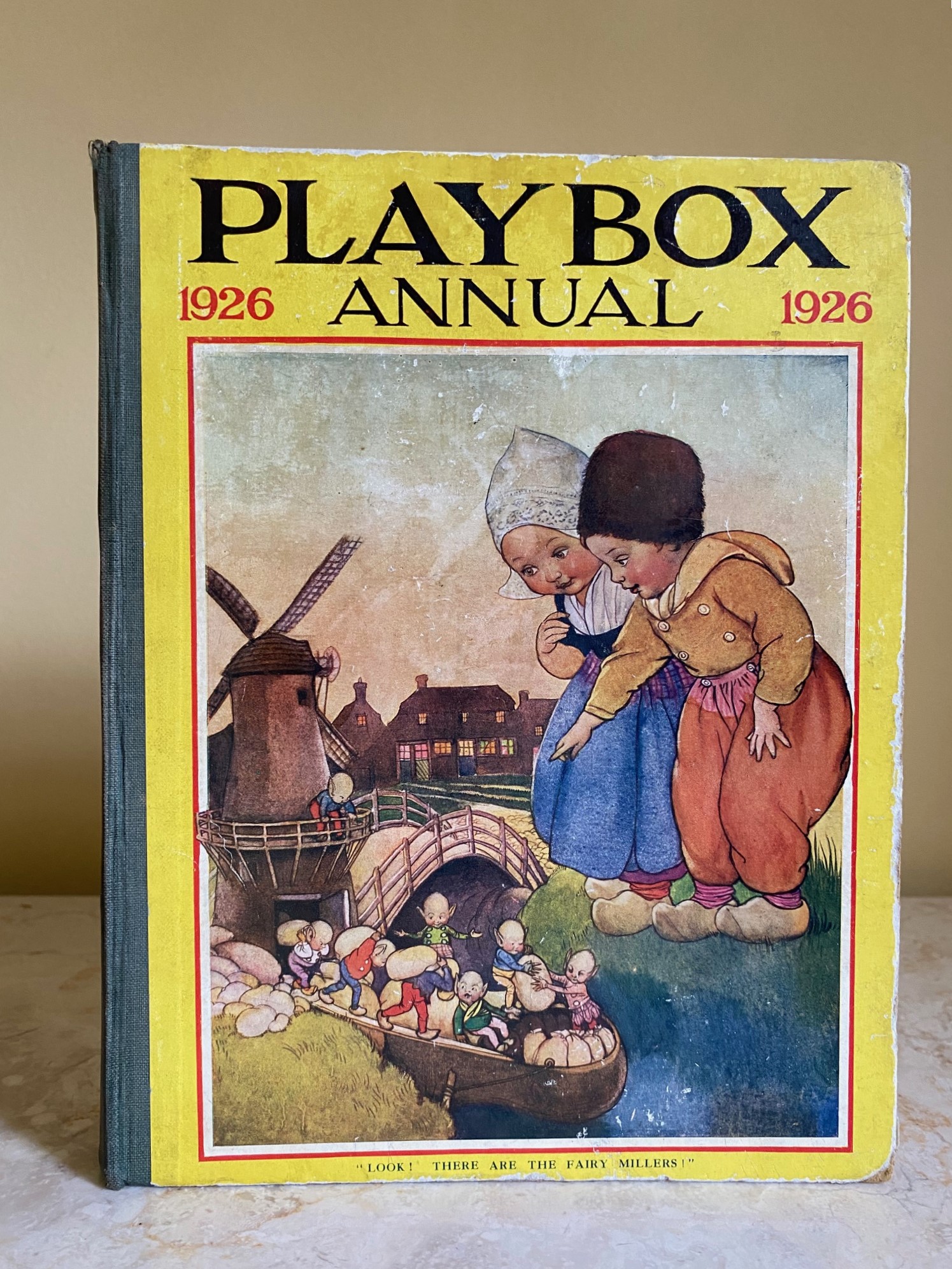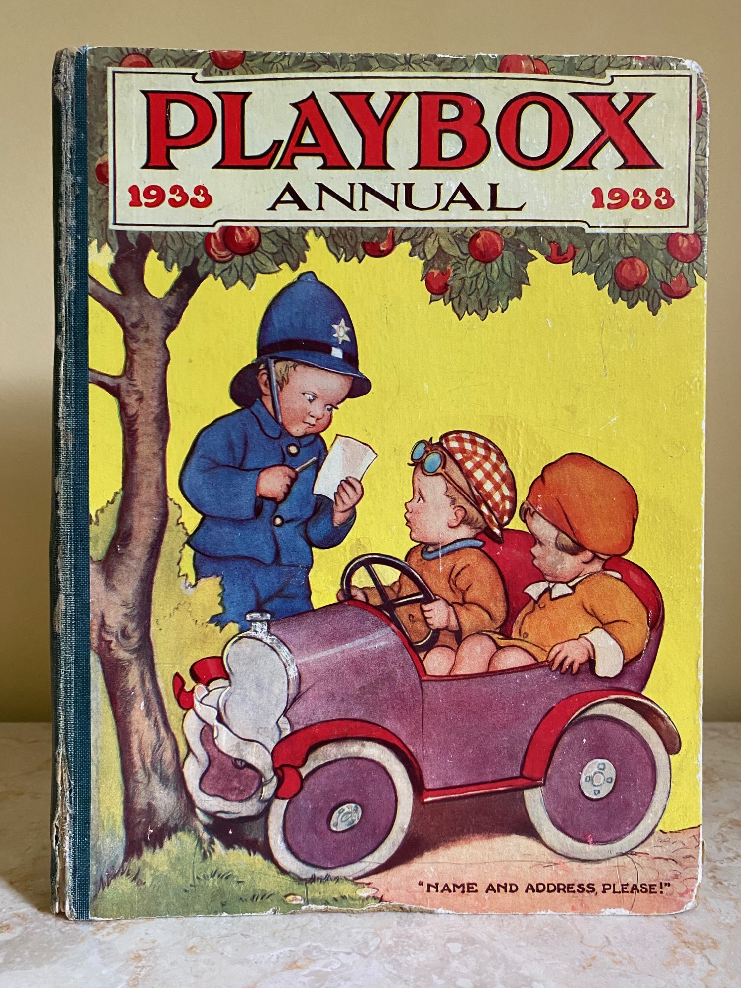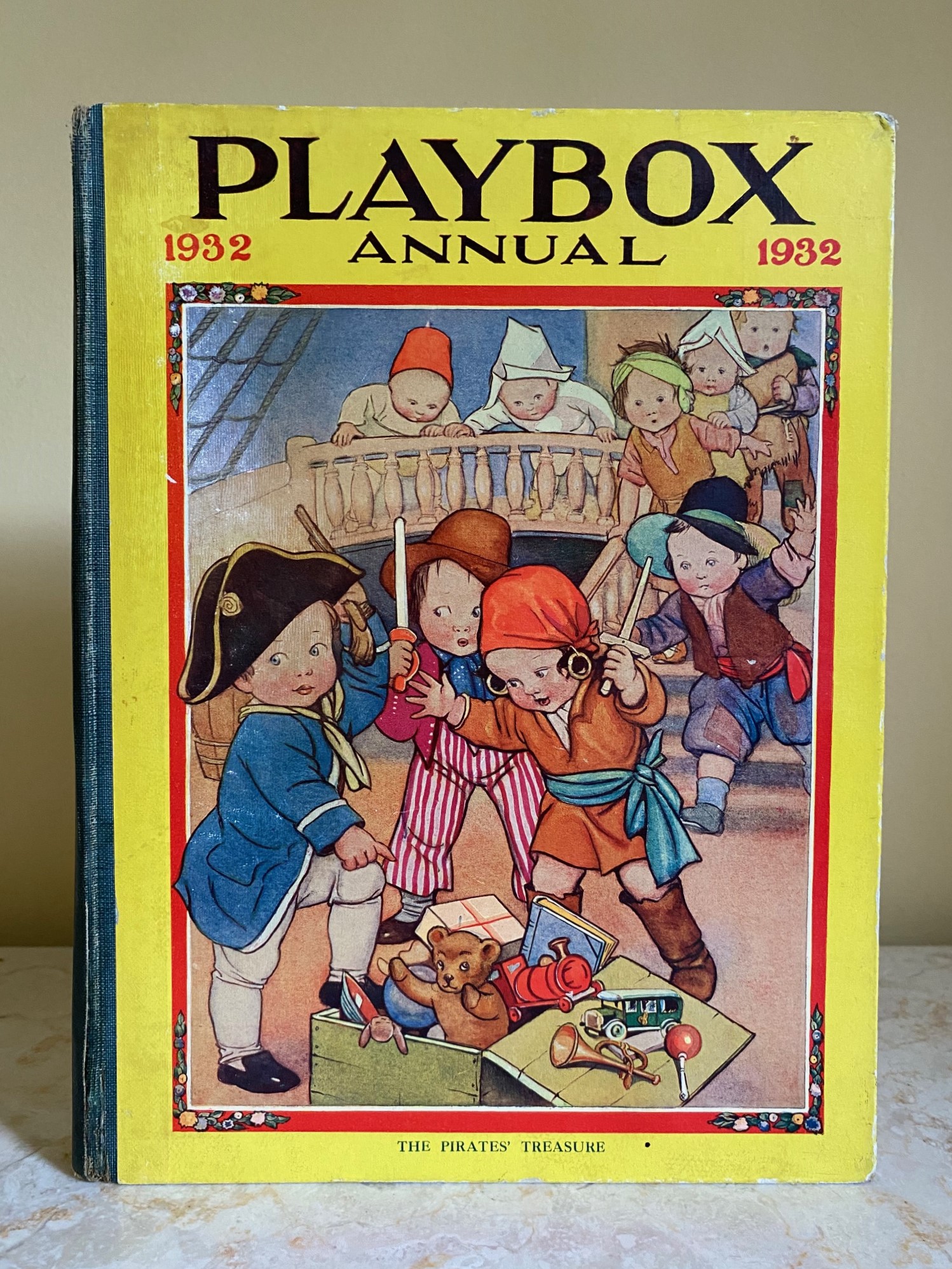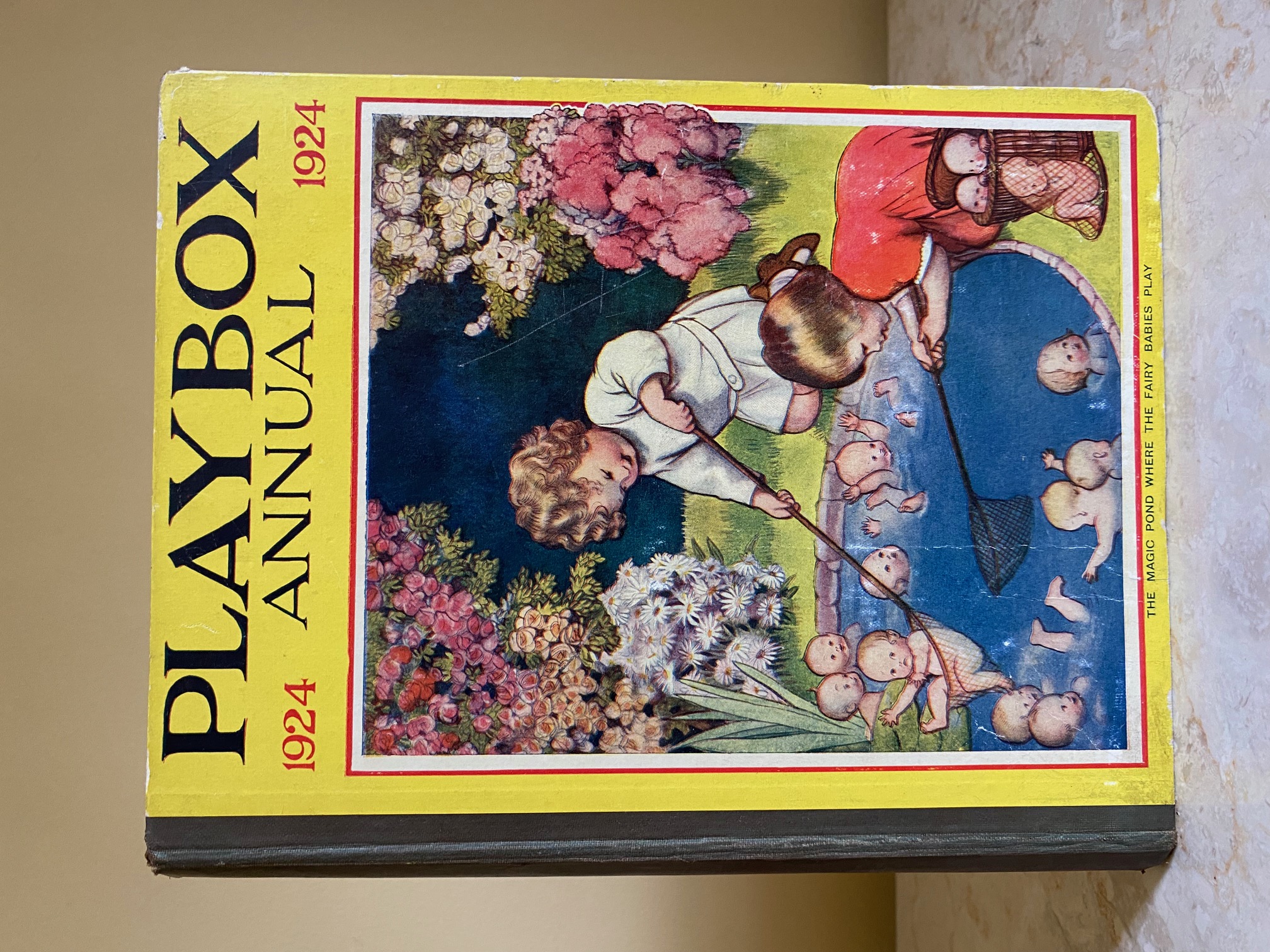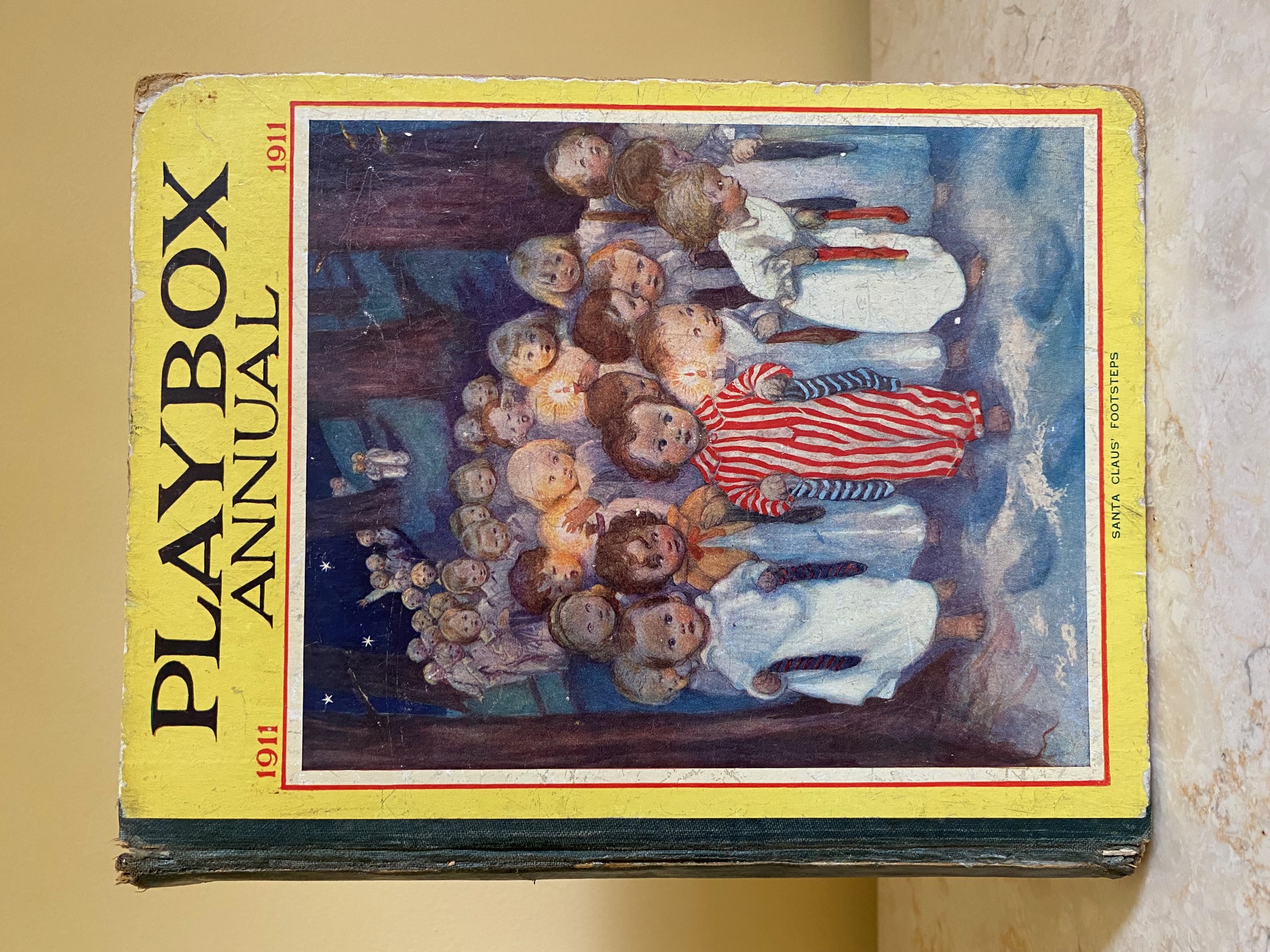 First edition hard back binding in publisher's original colour illustrated paper covered boards, emerald green thin linen cloth spine, Pears Soap advertisement to the rear cover. Quarto. 9½'' x 7¾''. Contains 208 pp with monochrome, single and twin colour illustrations and 4 full-page colour plates throughout, one of which is frayed. Ink message to the front free end paper, corners rubbed, hinges cracked and repaired. Playbox 1st series had 2 issues in 1898. Playbox 2nd series ran from 1905-1913. Playbox 3rd series (merged with Jack and Jill) ran from 1925-1955. The 2nd and 3rd series realised 48 annuals from 1909 to 1956. Member of the P.B.F.A.
