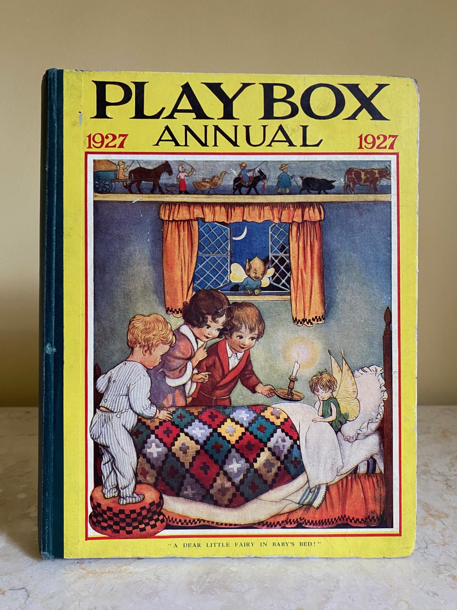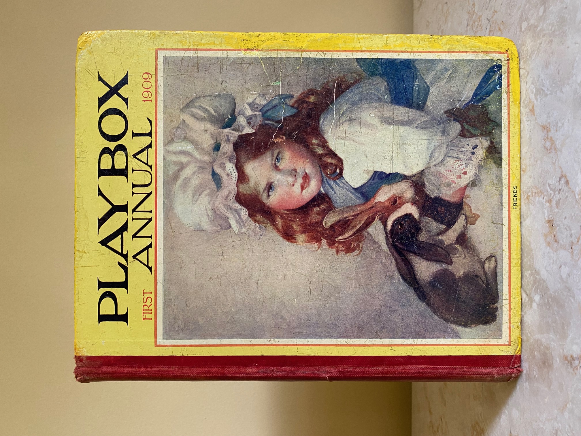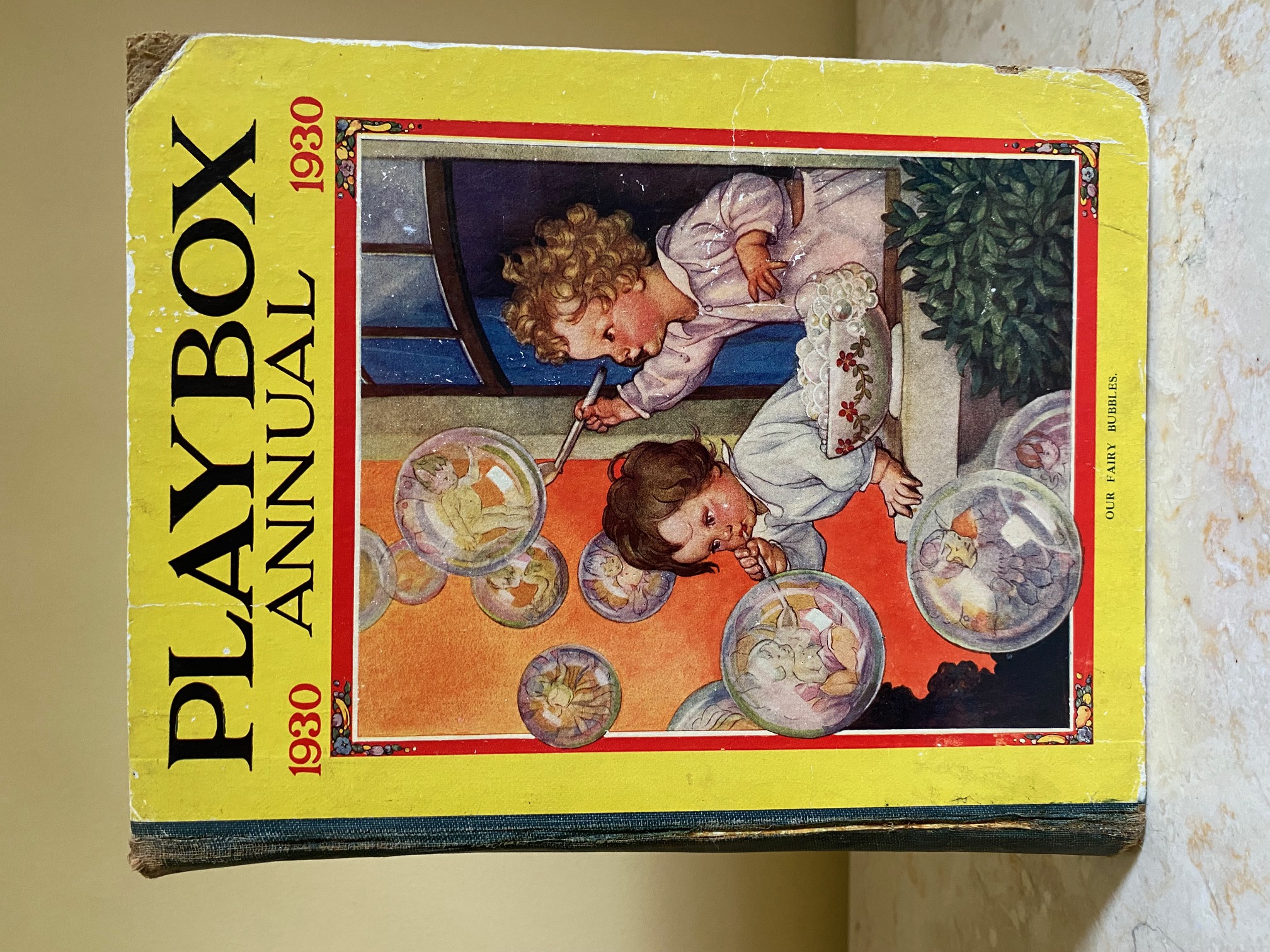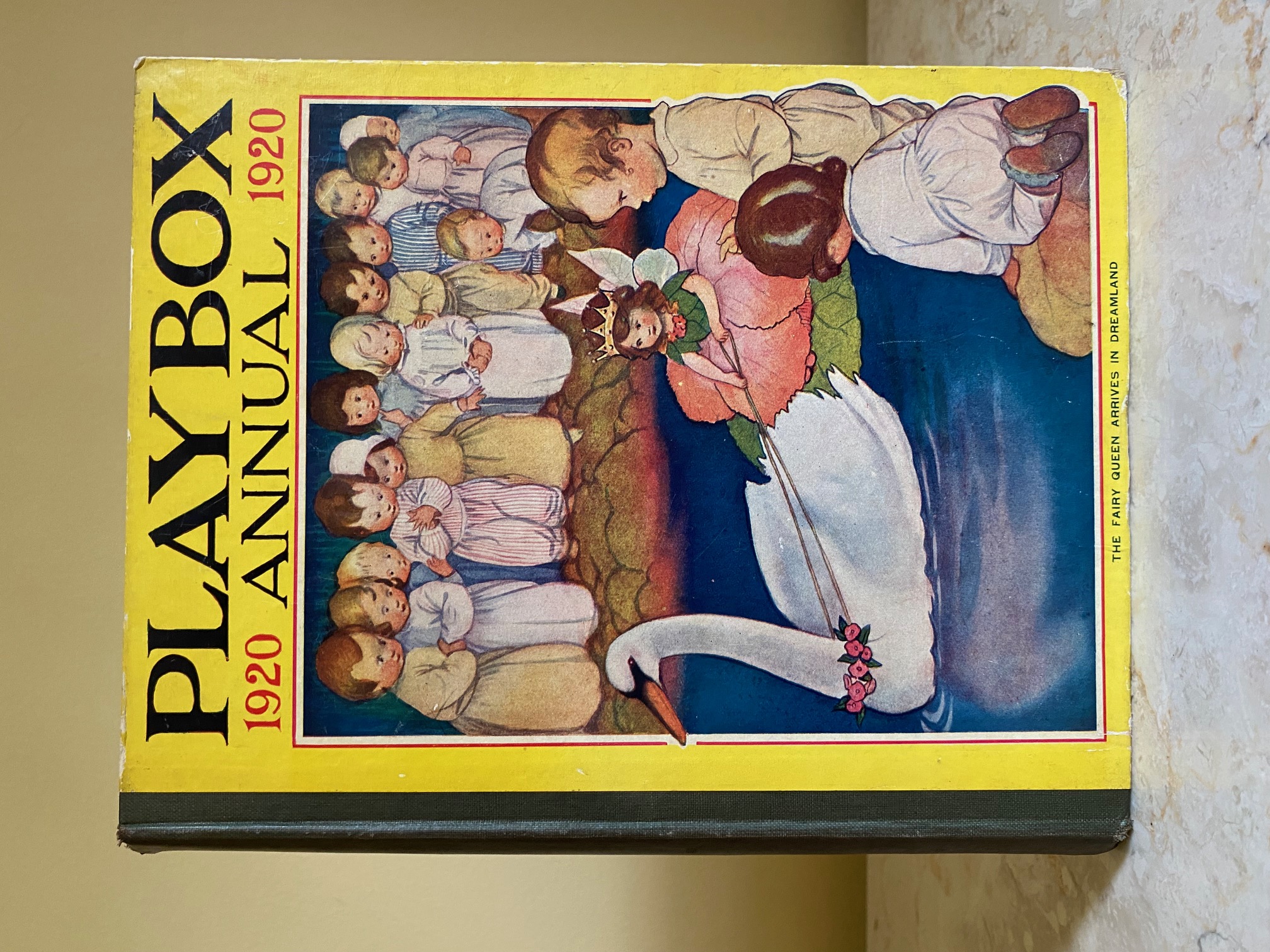First edition hard back binding in publisher's original colour illustrated paper covered boards, emerald green thin linen cloth spine, Pears Soap advertisement to the rear cover. Quarto. 9½'' x 7¾''. Contains 208 pp with monochrome, single and twin colour illustrations and 4 full-page colour plates throughout, one of which is frayed. Ink message to the front free end paper, corners rubbed, hinges cracked and repaired. Playbox 1st series had 2 issues in 1898. Playbox 2nd series ran from 1905-1913. Playbox 3rd series (merged with Jack and Jill) ran from 1925-1955. The 2nd and 3rd series realised 48 annuals from 1909 to 1956. Member of the P.B.F.A.