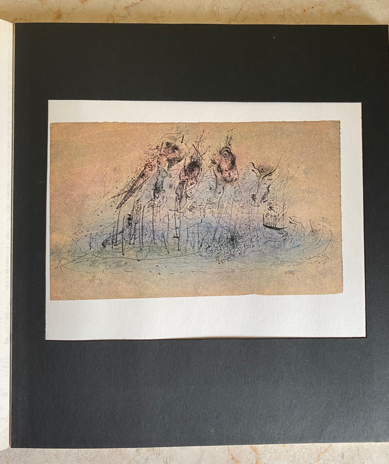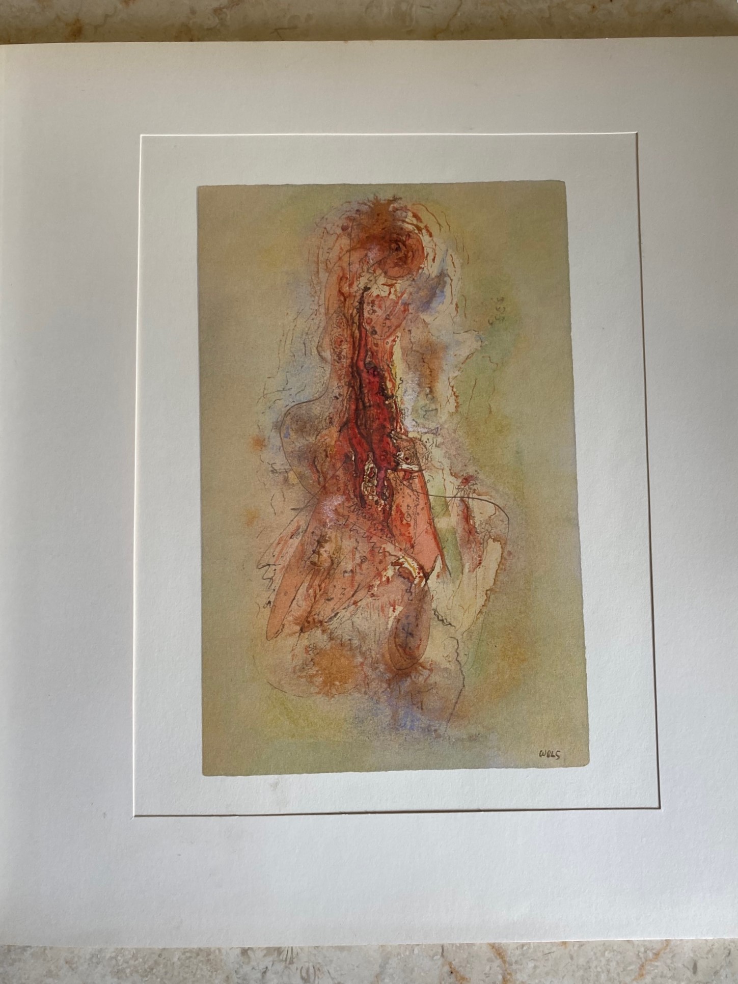 First edition hard back binding in publisher's original quarter black cloth, colour illustrated glazed white paper covered boards, blocked and lettered white back. Folio. 13'' x 12''. Wol's artistic work was created exclusively in France, where he had emigrated in 1932. Inspired by Surrealism and the Bauhaus masters and without professional training, after a short period as a photographer, he first created surrealist and later informal drawings and paintings. In particular, the oil works of his later phase influenced French and German painters of the Art Informel. Jean-Paul Sartre and other French writers appreciated him as a book illustrator. Contains 79 pp French text with among other things, 12 black framed and mounted watercolours reproduced on removable pages, 15 monochrome drawings between each removable colour plate, 3 photographs to the text section, two extra white framed mounted cards stored within a triangular canvas pocket inside the rear cover. Lightly repaired fraying of the cloth to the spine edges, contents in Fine condition, no slip case. Heavy volume weighing 2 kg, extra postage will be requested over and above our default setting for destinations outside of the UK. Member of the P.B.F.A.