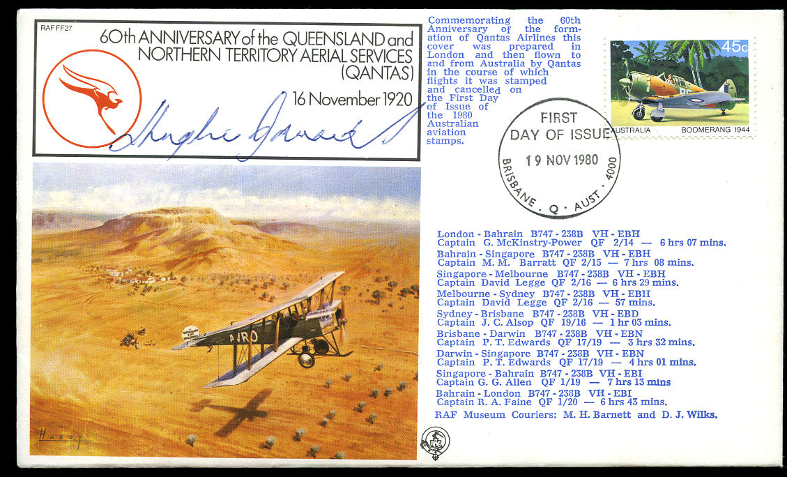 60th Anniversary of the Queensland and Northern Territory Aerial Services (Qantas) 16th November 1920 | First Day Souvenir Flown Cover | Signed Hughie Edwards