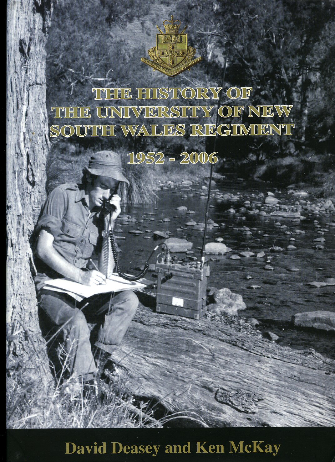 First thus edition hard back binding in publisher's original black cloth covers, gilt title and author lettering to the spine and to the front cover. 4to 12'' x 8¼''. Part one previously published by Haldane Press, 1978 contents Part one (1952-1977) by D. J. Deasey; (with editing by K. J. McKay); Part two (1978-2006). Contains 377 printed pages of text with archive monochrome and colour photographs throughout. Small bumps to the lower corners. Near Fine condition book in Fine condition dust wrapper. Colour coat of arms presentation label to the front free end paper 'This copy of the History of The University of New South Wales Regiment is for Major General John Badcock, MBE, A good friend of the Regiment. Signed by one of the authors above the label 'To John, With every best wish and hope you enjoy reading it, Bill 30th January 2015'. Small paste note to the fore edge of page 31 indicating where to locate a photograph of the recipient of the book saying 'Dear John - Here you are! Bill'. Dust wrapper supplied in archive acetate film protection, it does not adhere to the book or to the dust wrapper. Member of the P.B.F.A. ISBN 9780646515212
