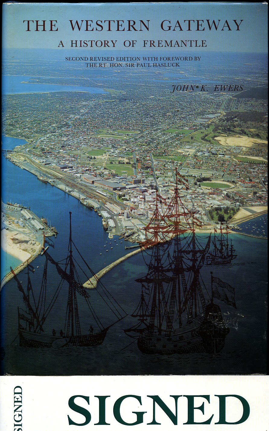Second revised edition hard back binding in publisher's original quarter blue leather with 5 raised bands, dark blue cloth covered boards, gilt title and author lettering, gilt lines and gilt motif between the bands to the spine, silver Coat of Arms on the blue front and rear end papers. Quarto 10'' x 7''. De-luxe edition hand written number 390 of 500 Limited Edition copies which were reserved for presentation by the Mayor and Councillors of the City of Fremantle. This copy was presented to Major-General John Badock M.B.E and SIGNED by the Mayor of Fremantle 'W. A. McKenzie'. Contains [xxiii] 262 printed pages of text with single page colour coat of arms, double-page colour engraving, archive monochrome illustrations, maps and photographs throughout. Fine condition book in Fine condition dust wrapper, not price clipped, unused new book. Dust wrapper supplied in archive acetate film protection, it does not adhere to the book or to the dust wrapper. Member of the P.B.F.A. ISBN 855640502
