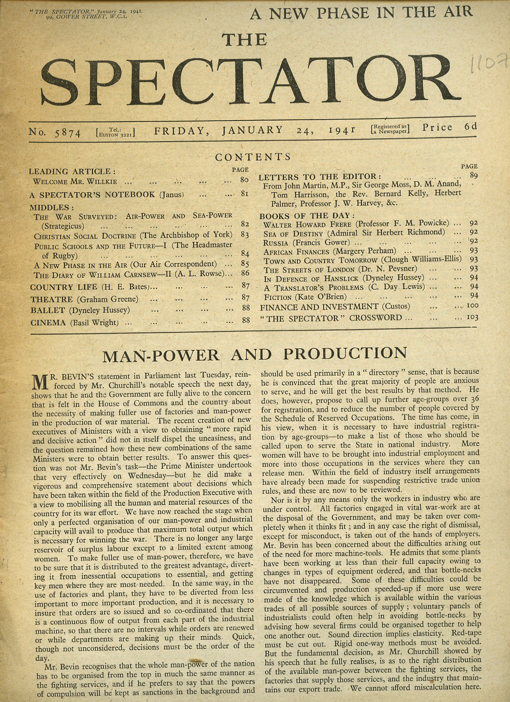 Published by The Spectator Ltd., 99 Gower Street, London No. 5874. January 24th 1941. 1941.