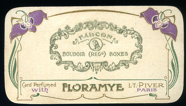 Very rare and original 3½'' x 2'' double-sided compliments card which was originally perfumed. Floramye by L. T. Piver is a fragrance for women and was launched in 1905. The nose behind this fragrance is Pierre Armigeant. Calendar to the reverse is dated 1913-1914. Member of the P.B.F.A.