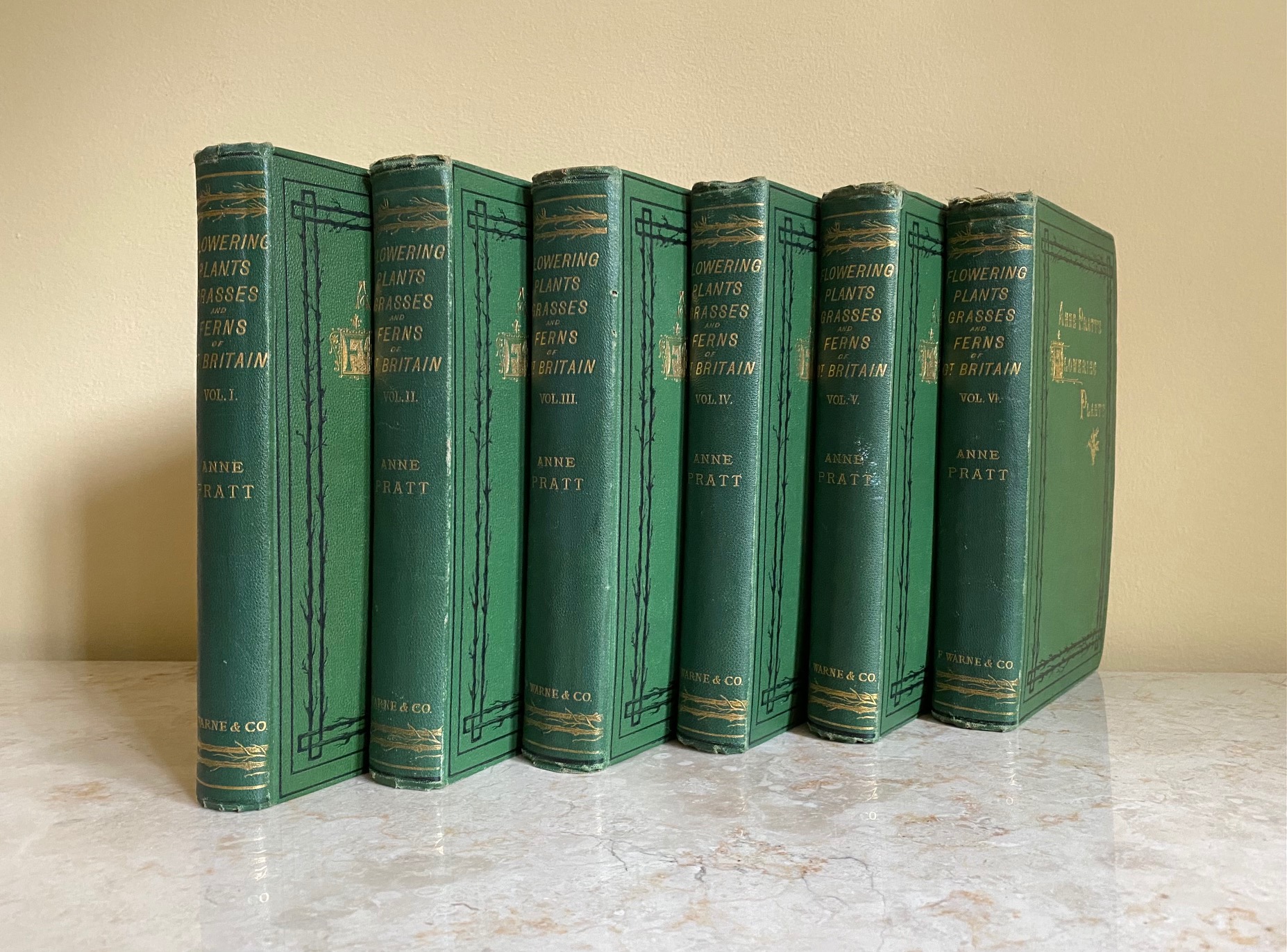 Uniform matching hard back binding in publisher's original bottle green cloth covered boards, blocked and lettered in gilt and black, gilt backs, all page edges gilt, auburn end sheets. 8vo. 9'' x 6''. Originally only 5 volumes published between 1855-1866, the 6th volume, on grasses, sedges, and ferns, was added in 1873. Contains 313 colour plates, all numbered as called for, including frontispiece plates with tissue guards. Rubbing across the spine ends and corners, hinges not strained, text block clean and fresh. Heavy volume set weighing 5 kg, extra postage and insurance will be requested over and above our default setting for destinations outside of the UK. Member of the P.B.F.A.