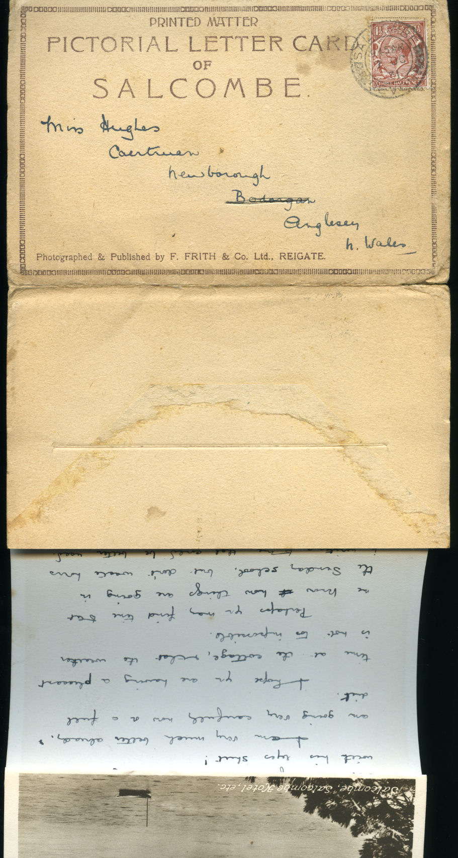 Publisher's original pictorial folding letter card [soft back]. 6'' x 4''. Contains 6 concertina folding archive collotype photographs relating to the area which are attached to the envelope, the reverse has a lengthy letter addressed from The Salcombe Hotel, South Devon. In Very Good condition. Member of the P.B.F.A.