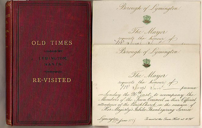 First edition hard back binding in publisher's original burgundy cloth covers, gilt title and author lettering to the spine and to the upper panel, brown paper end papers. 8vo. 7'' x 5''. Contains [xiv] 301 [ii] printed pages of text with photogravure portrait frontispiece of Sir Harry Burrard, 1 map, 1 fold-out plate, 2 double-page letter and signatures pages, 1 single-page letter, 2 fold-out illustrations, 8 monochrome illustrations, 1 town seal, all present and correct as listings, albeit plate J has been omitted and replaced with code letter A which is duplicated. Loosely enclosed are two invitation cards from the author, The Mayor of Lymington, inviting Edward Trigs? to accompany Members of the Town Council in their Official attendance at the Parish Church on the occasion of Her Majesty's Jubilee Thanksgiving Service, dated Lymington 22nd June 1881. The hand which has written the two invitation cards [Edward King one would assume as he is the Mayor] has also written in the book 'Edward Trigs, 93 High Street, Lymington, Hants, 1879.' One small splash mark to the centre of the spine, without any foxing or age tanning to the pages which are in Very Good clean condition. Member of the P.B.F.A.