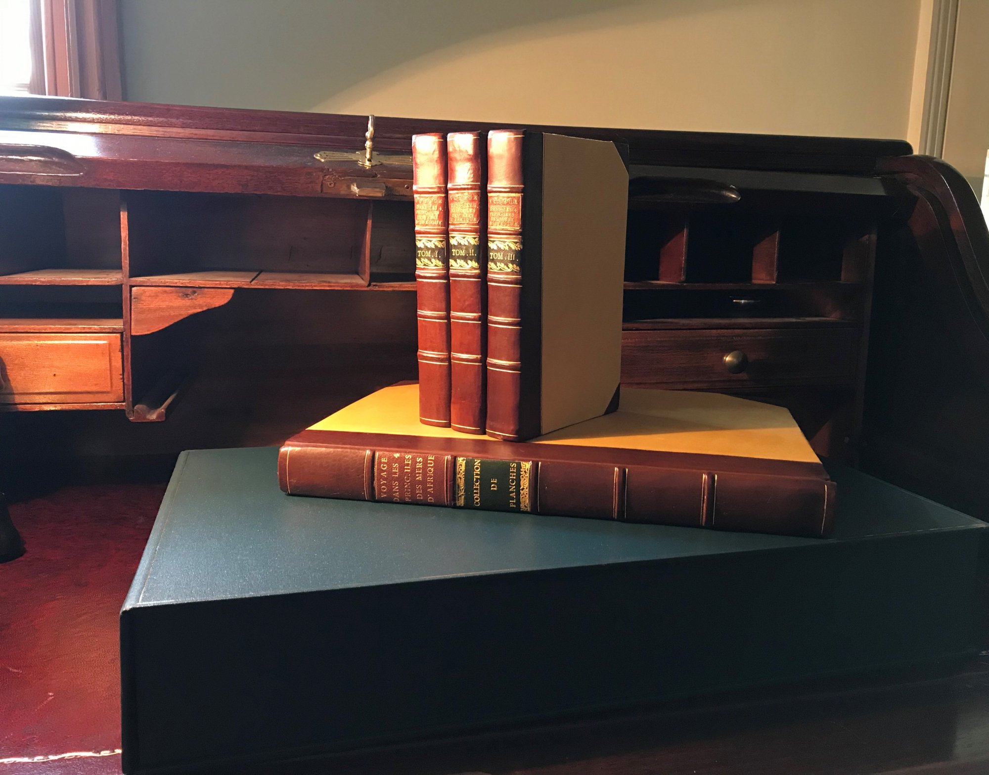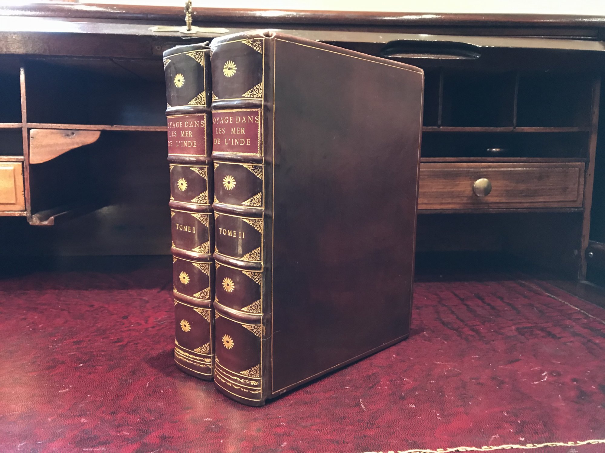 Recently rebound matching first edition hard back binding in full mahogany leather, raised bands with red morocco title labels, gilt centre tooling to the remaining panels, gilt lines, handmade Griffen Mill end papers. 4to. 10¼'' x 8''. Volume I. [xvi] (title, dedication, foreword, table of chapters and articles)., 707 pp, xiii (table of contents), (additions, faults to correct)., 13 folded engraved plates (including 4 maps). Volume II. [xvi] (title, foreword, table)., 844 pp, xvi, [4] (mistakes to be corrected, notice to the binder)., 14 folded engraved plates (including 8 maps). 27 folding plates in total. Original edition of this important scientific relationship due to the French astronomer Guillaume Joseph Hyacinthe Jean-Baptiste The Gentil of the Galaisière (1725-1792). The latter embarked on the order of the Academy of Sciences for India to observe the passage of Venus on the disk of the Sun. He left Brest on March 26, 1760 aboard the Berryer, a vessel of fifty guns of the East India Company, and arrived on July 10 at the Ile-de-France (Mauritius), hoping to find another ship that would sail for India. Unable to reach Pondicherry because of the conflict with the English, he made some observations in Mauritius and decided to wait for the next passage of Venus eight years later. Thus his scientific journey will last in the end eleven and a half years. He then makes the most of his long stay and travels through India and the Indian Ocean from Madagascar to Manila, collecting specimens of natural sciences, geographical positions or ethnological evidence to study the tides, monsoons, natural history, astronomy and Indian religion. His work contains many valuable information on Madagascar, Mauritius, Reunion and the Philippines, details on the mornings of the Indians on the Coromandel coast, on the astronomy of the Brahms, astronomical observations made in Pondicherry, remarks on navigation through the Strait of Malacca. He managed to reach Pondicherry where the governor had him build an observatory to which Le Gentil will devote himself more than a year. The rich iconography of the book consists of 27 engraved plates and maps dedicated to the collected information and its astronomical observations. Minimal age tanning to the closed text block edges and a Very Good clean and sound condition set. Member of the P.B.F.A.
