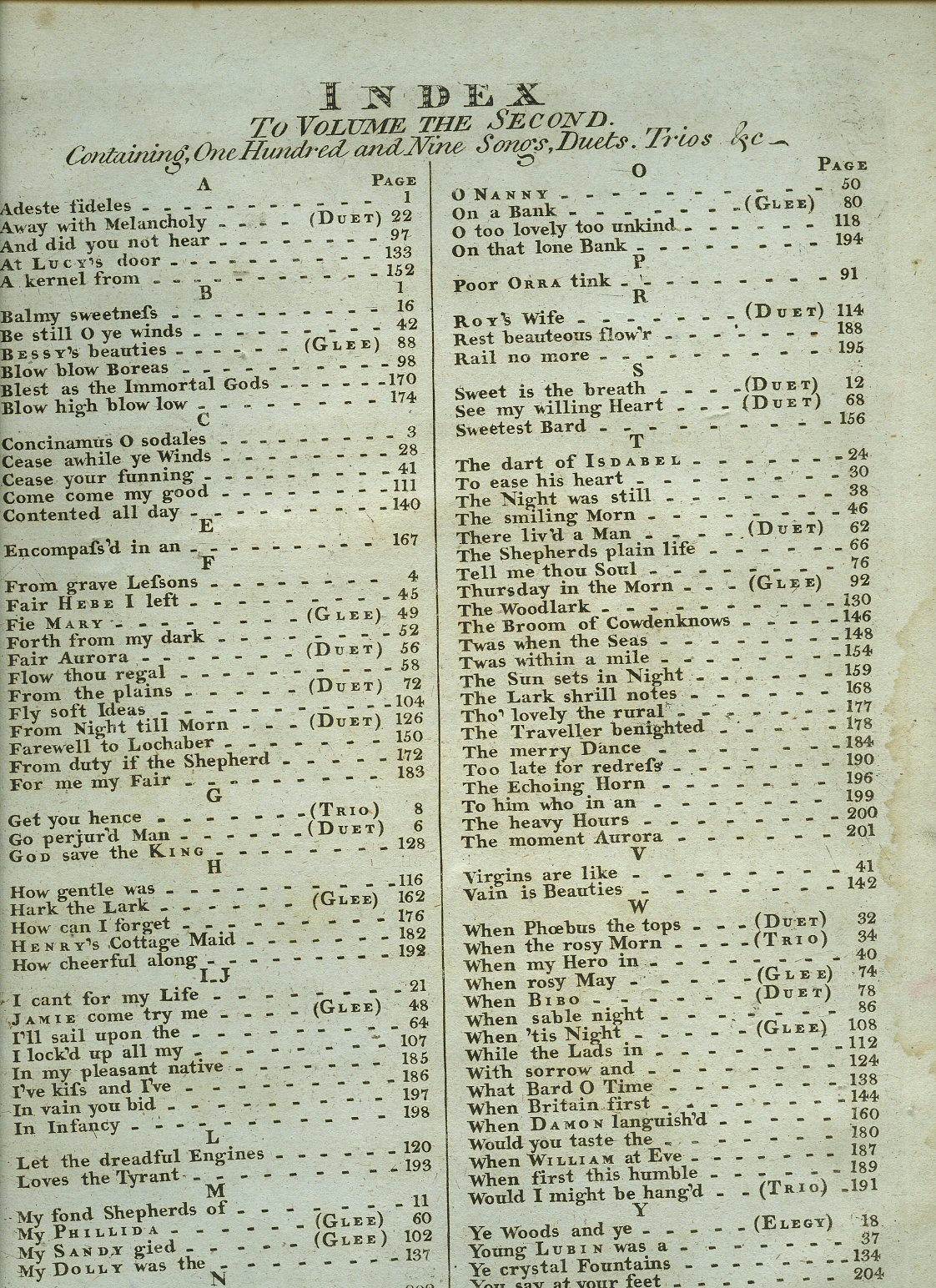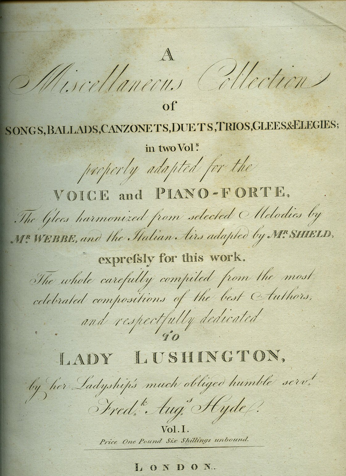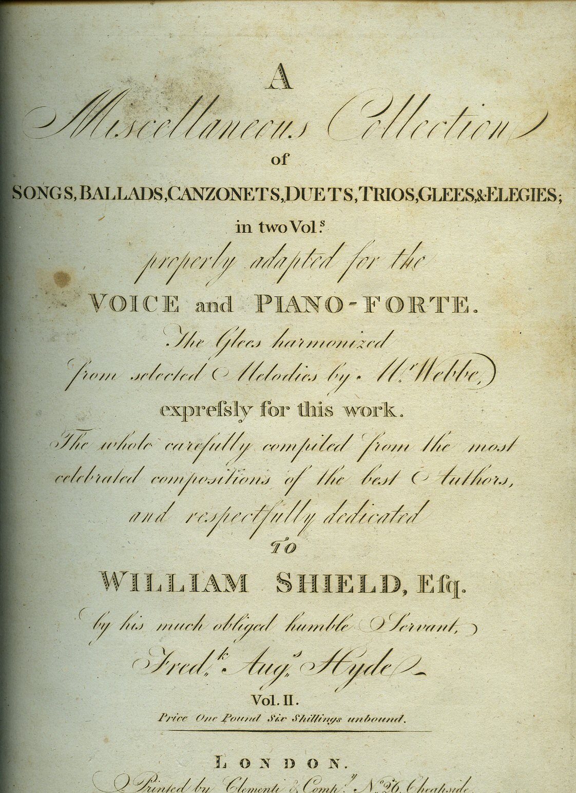A Miscellaneous Collection of Songs, Ballads, Canzonets, Duets, Trios, Glees, & Elegies; in two Volumes. Properly adapted for the Voice and Piano-forte. The Glees harmonized from selected Melodies by Mr Webbe, and the Italian Airs adapted by Mr Shield. Expressly for this work. The whole carefully compiled from the most celebrated compositions of the best Author's, and respectfully dedicated to Lady Lushington, by her Ladyship's much obliged humble servant, Frederick August Hyde [Volume I], and respectfully dedicated to William Shield, Esq. by his much obliged humble servant, Frederick August Hyde [Volume II] Two Volumes Complete.