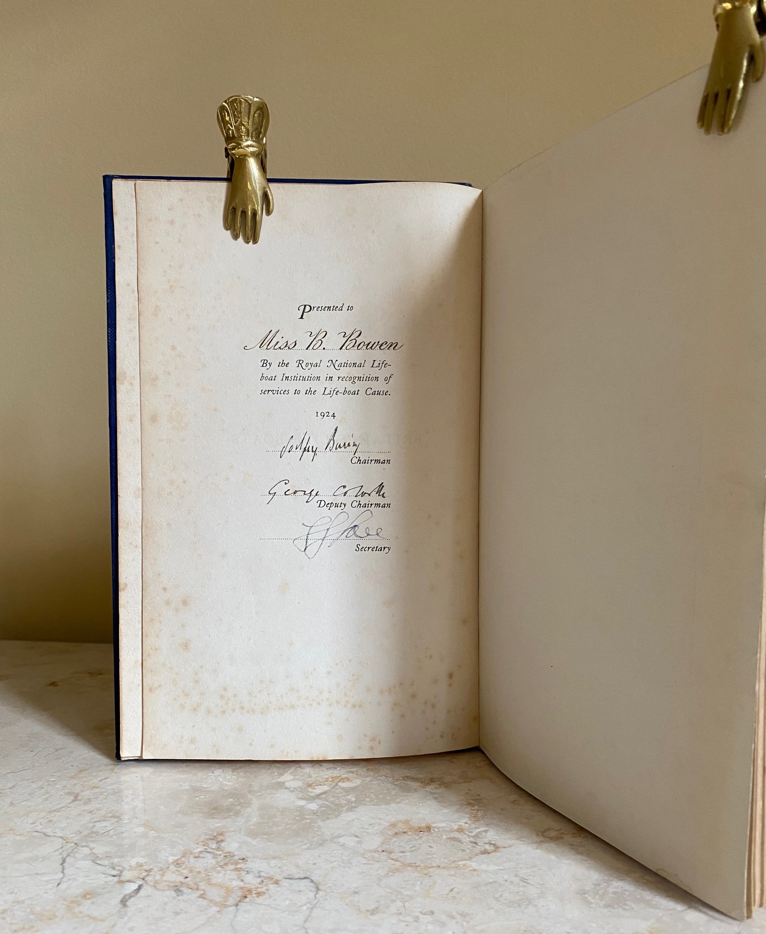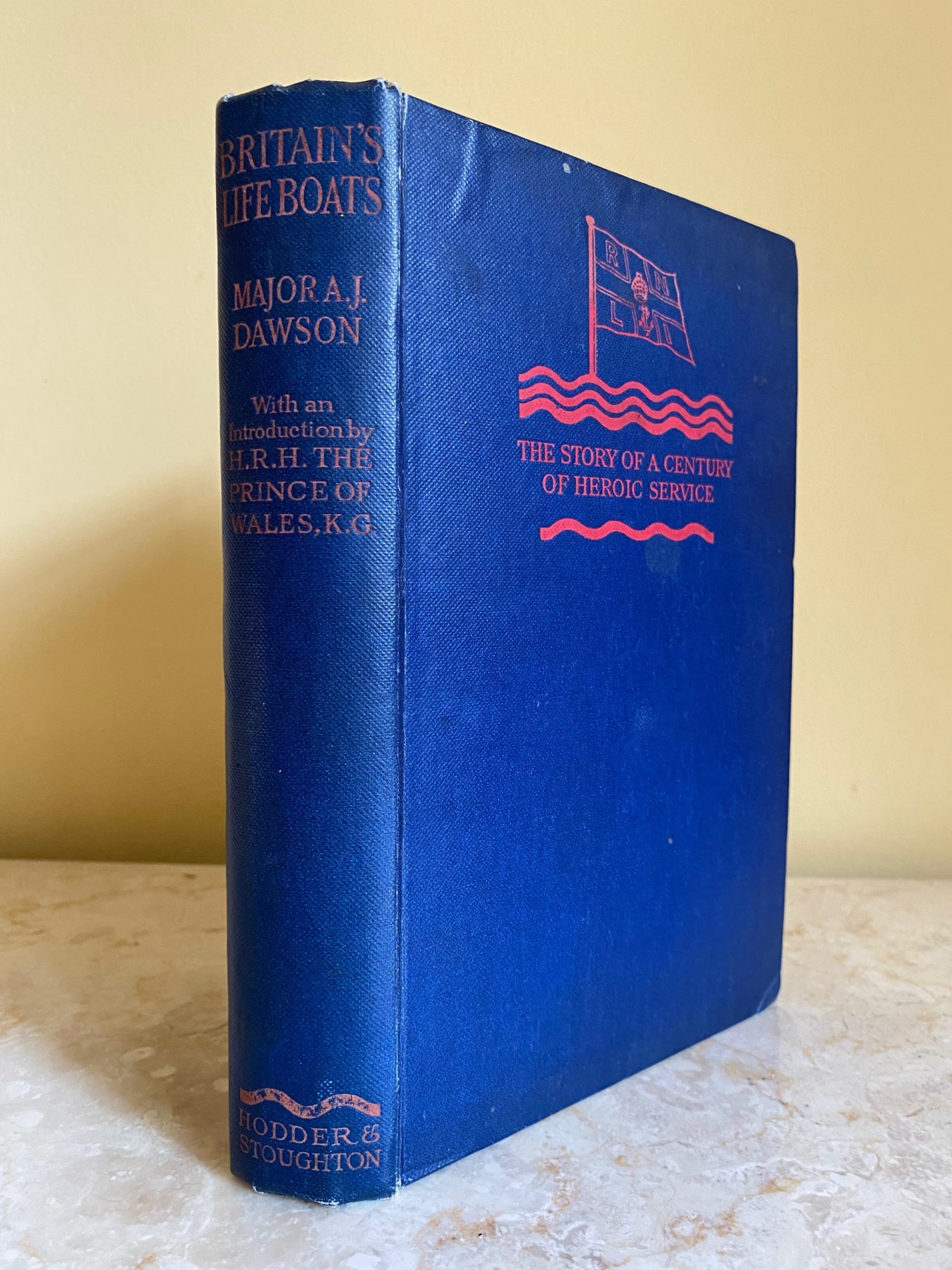 First edition hard back binding in publisher's original navy cloth covered boards, blocked and lettered red back and front. 8vo. 9'' x 6''. Contains (xvi), 279 pp with monochrome and colour illustrations and photographs throughout, folding colour map 'Life-Boat Chart of The British Isles for 1924'. This is a special presentation copy presented to Miss B. Bowen in recognition of services to the Life-Boat Cause 1924 and has been SIGNED by The Chairman, Deputy Chairman and Secretary of Royal National Life-Boat Institution. Ink name and foxing to the front free end papers, corners and spine ends rubbed and in Good condition, no dust wrapper. Member of the P.B.F.A.