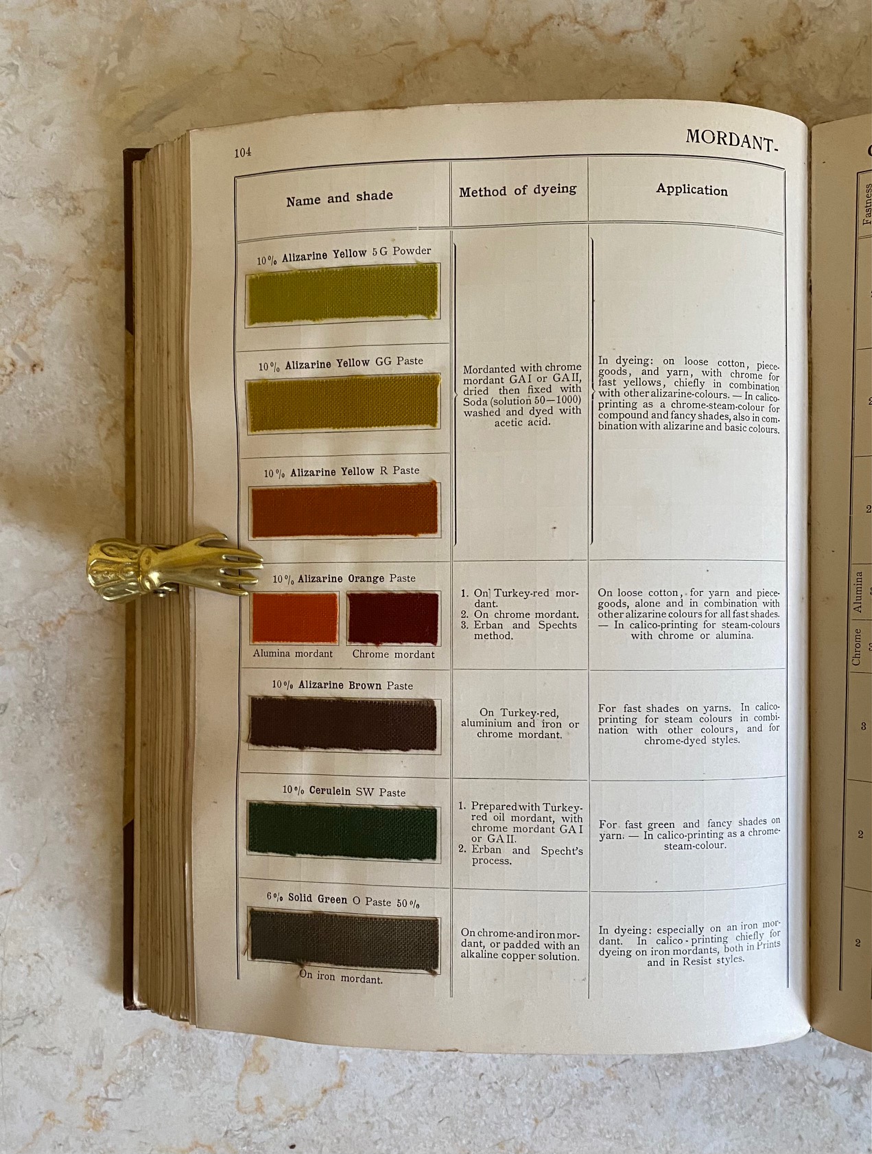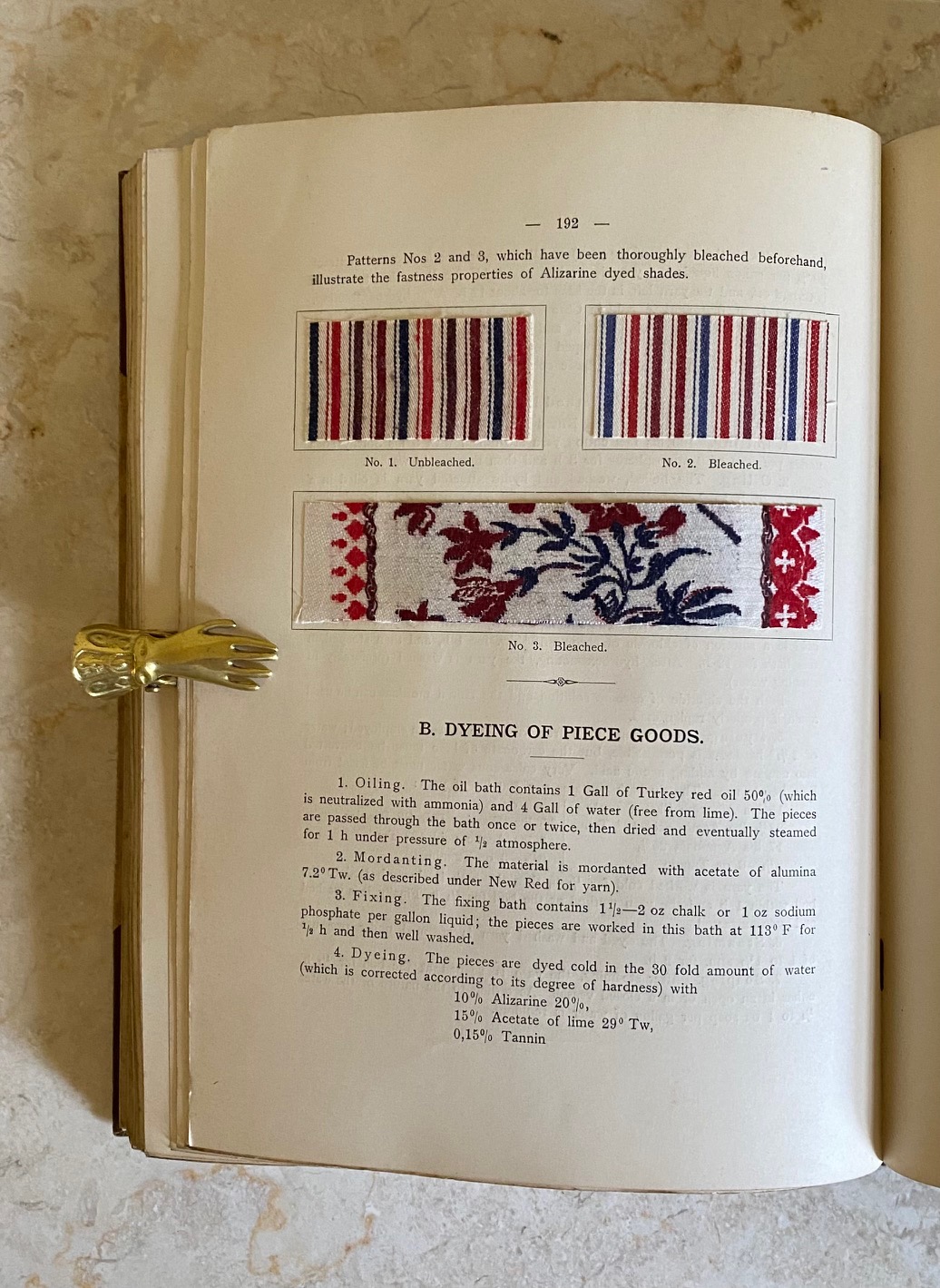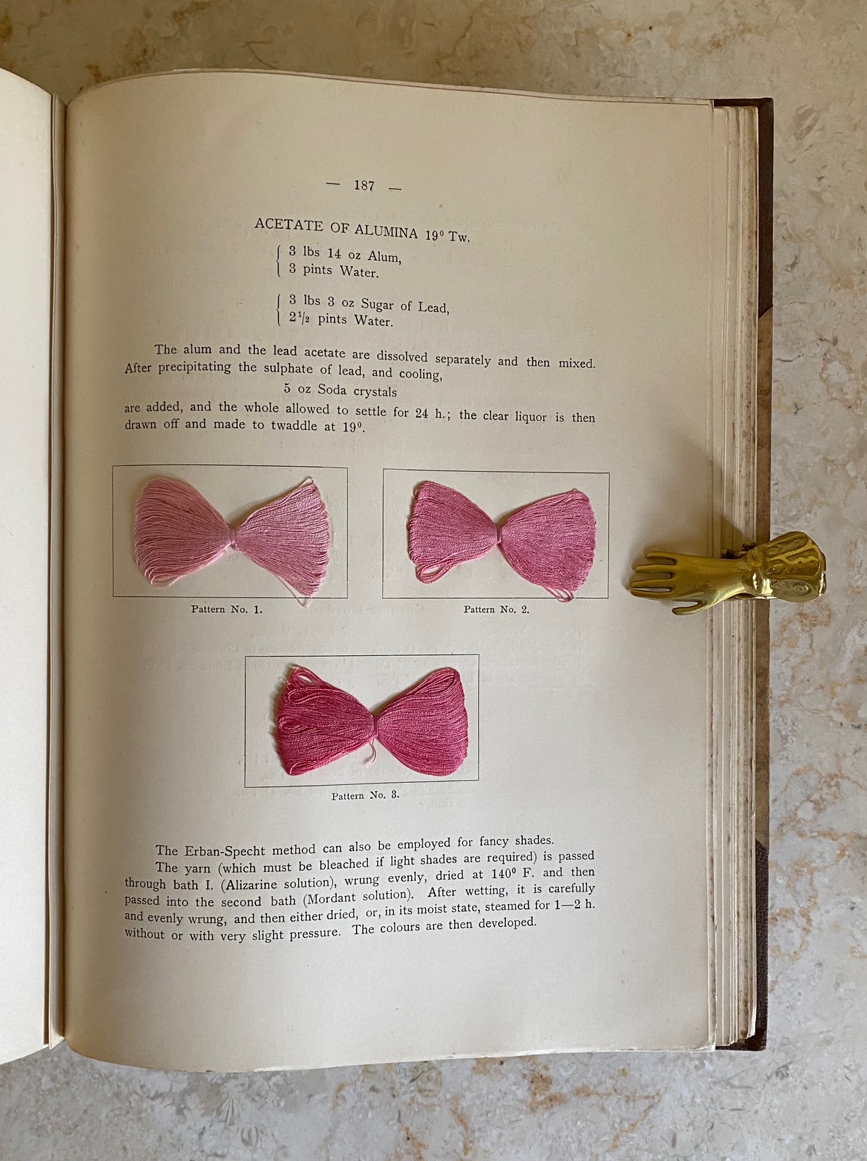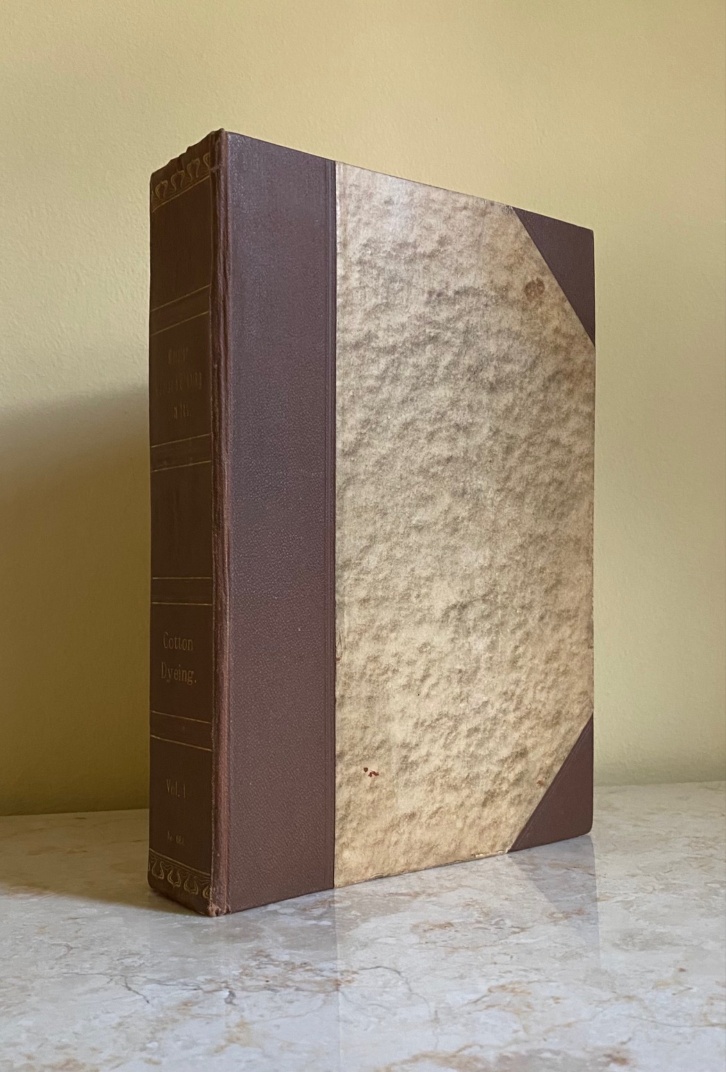 First edition hard back binding in publisher's original half camel brown leather, marble paper sides, gilt title to the spine, olive and cream ML&B logo and Lion trademark end papers. Quarto. 11'' x 8''. Contains frontispiece showing the factory in Germany, 236 pp English text with printed samples of dyeing instructions and recipes, monochrome text illustrations. Light rubbing to the covers and in Very Good bright condition. Heavy volume weighing 2 kg, extra postage will be requested over and above our default setting for destinations outside the UK. Member of the P.B.F.A.