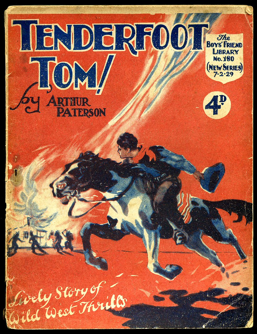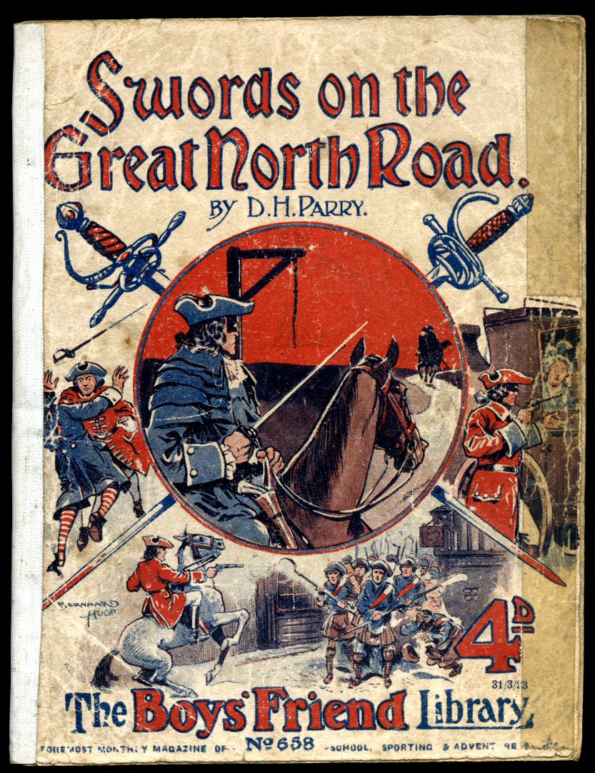Publisher's original stapled paper covers with wonderful period graphic colour art work to the front cover. 8vo. 7'' x 5½''. Contains 96 printed pages of text. The staple has completely rusted to the early and latter leaves leaving them with small holes and brown stains to the paper, half of the spine covering is missing, priced 4d. We currently hold in stock over 70 other titles from The Boys' Friend Library. Member of the P.B.F.A.