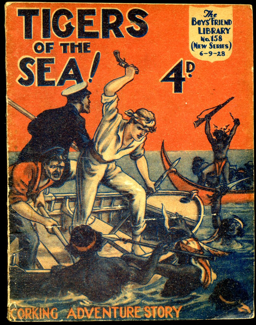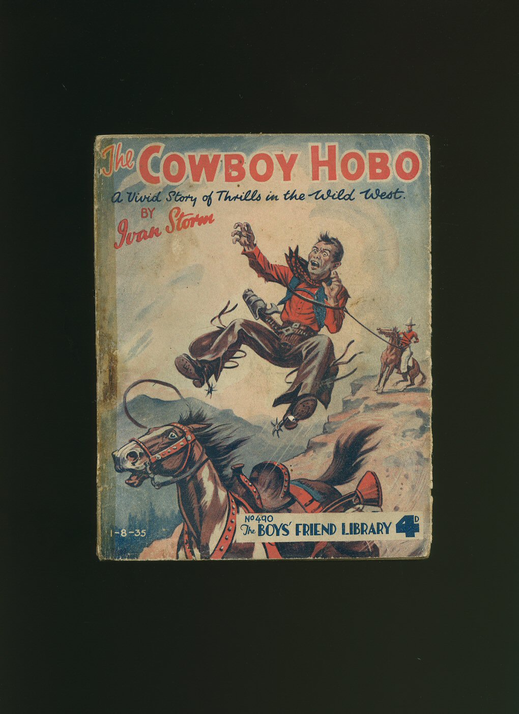 Publisher's original stapled paper covers with wonderful period graphic colour art work to the front cover. 8vo. 7'' x 5½''. Contains 96 printed pages of text. Weeping of the staple which has bleed onto the front and rear covers, crinkling of the paper to the spine and in Very Good condition, small Booksellers label inside the front cover, priced 4d. We currently hold in stock over 70 other titles from The Boys' Friend Library. Member of the P.B.F.A.