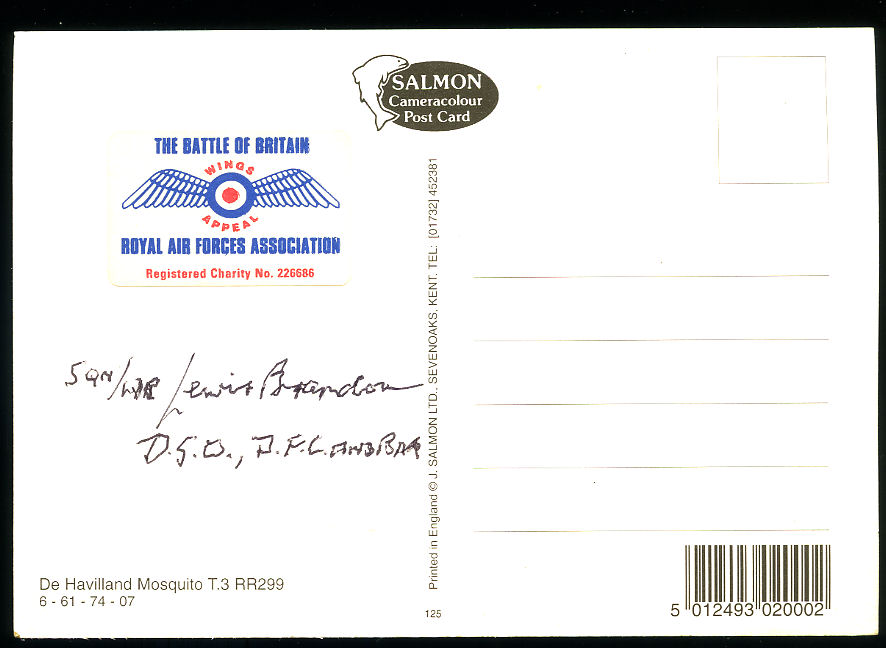 5½'' x 3½''. Divided back. Colour post card of De Havilland Mosquito T.3 RR299. SIGNED to the rear 'Sqn. Ldr. Lewis Brandon DSO DFC and Bar'. Red and blue label above his signature 'The Battle of Britain Royal Air Forces Association.' Member of the P.B.F.A.