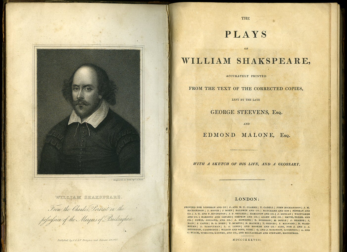 The Plays of William Shakspeare (Shakspere, Shakespere, Shakespeare) With Notes of Various Commentators, Accurately Printed From the Text of George Steevens's Last Edition in Ten Volumes | Volume I: Some Account of the Life of William Shakspeare, Shakspeare's Will, The Tempest, Two Gentlemen of Verona, Merry Wives of Windsor, Twelfth Night, Measure for Measure. Volume II: Much Ado About Nothing, A Midsummer Night's Dream, Love's Labour's Lost, The Merchant of Venice, and As You Like It. Volume III: All's Well That Ends Well, Taming of the Shrew, Winter's Tale, Comedy of Errors, Macbeth. Volume IV: King John, King Richard II, King Henry IV. Part I, King Henry IV. Part II, and King Henry V. Volume V: King Henry VI. Part I, King Henry VI. Part II, King Henry VI. Part III, and King Richard III. Volume VI: King Henry VIII, Troilus and Cresida, Timon of Athens, and Coriolanus. Volume VII: Julius Caesar, Antony and Cleopatra, Cymbeline, Titus Andronicus, Pericles. Volume VIII: King Lear, Romeo and Juliet, Hamlet, Othello. Volume IX: Prefaces and Annotations of the Various Commentators. Volume X: Prefaces and Annotations of the Various Commentators, and Glossary [10 Volumes Complete].