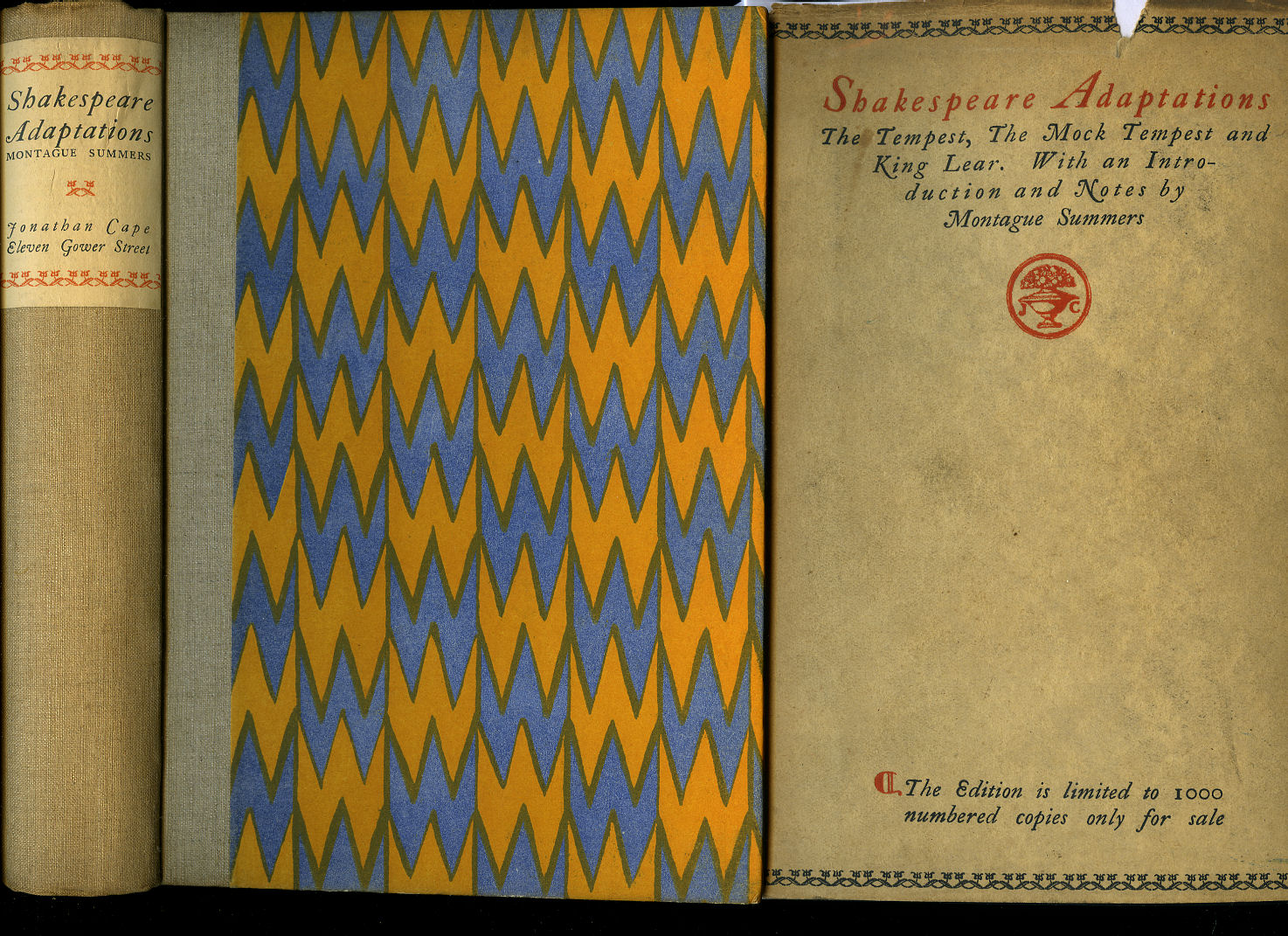 First edition hard back binding in publisher's original orange and blue chevron patterned paper covered boards, cream, red and black title and author lettering label to the light brown cloth spine, fore and lower page edges untrimmed. 8vo. 8½'' x 6''. Contains [cviii] 282 printed pages of text. Hand written number 200 of 1000 Limited Edition copies. Age tanning to the closed text block edges. Very Good condition book in scarce Good condition dust wrapper with age tanning to the spine and edges, not price clipped, 15s. Dust wrapper supplied in archive acetate film protection. From the private library of William Leigh, General Manager of The Old Vic, London, and SIGNED by him to the front free end paper 'William Leigh'. Member of the P.B.F.A.