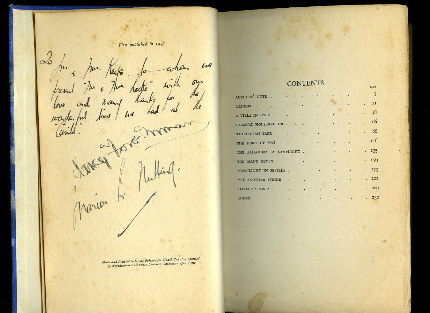 First edition hard back binding in publisher's original blue cloth covers, faded gilt title and author lettering to the spine. 8vo. 9'' x 6''. Contains 231 [i] printed pages of text with 12 monochrome photographs. Front free end paper missing, bad marks to the front cover, rubbing to the spine ends and corners, the good news is that it is SIGNED by both authors to the verso of the title page 'To Mr. & Mrs. Keys, To whom we present ''Mr. & Mrs. Locke'' with our love and many thanks for the wonderful time we had at the 'Casila', Nancy Ford-Inman, Marion L. Nutting.' Member of the P.B.F.A.