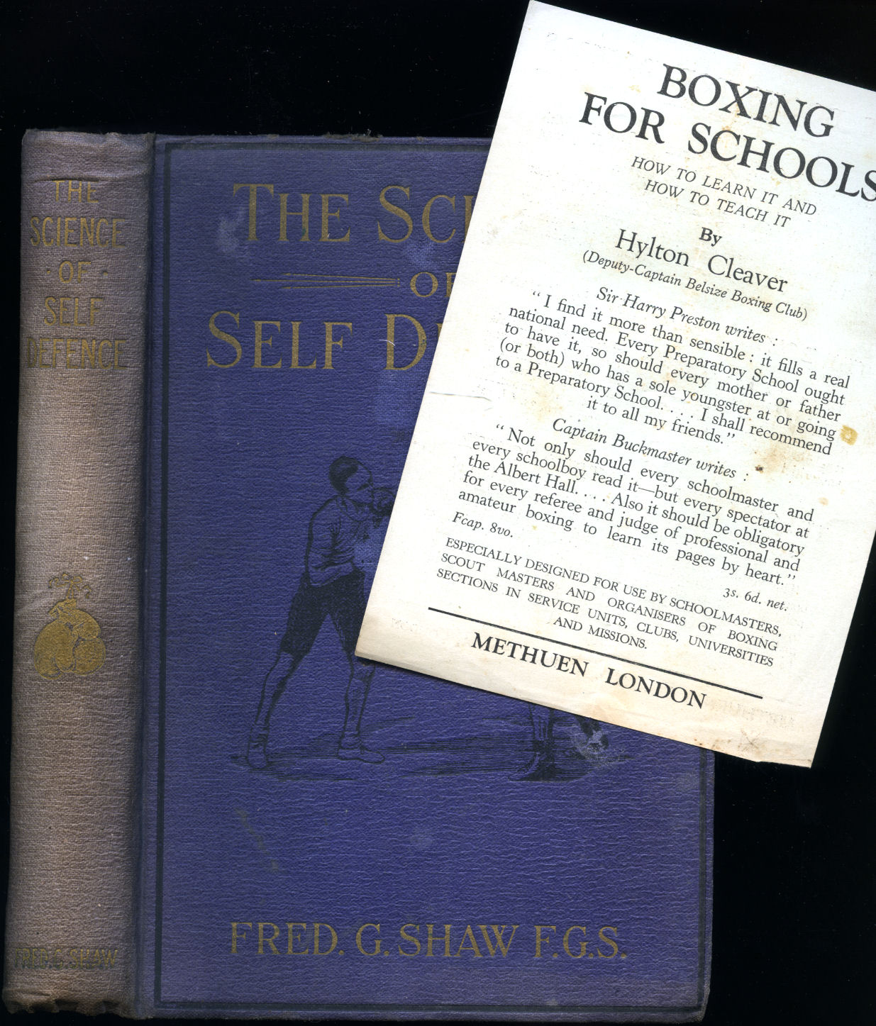 First edition hard back binding in publisher's original purple blue cloth covers, gilt title and author lettering to the spine and to the front cover. 8vo. 8½'' x 6''. Despite the title, the book is entirely devoted to boxing. Contains (xvi), 184 printed pages of text with 36 full-page single-sided monochrome archive photographs throughout, 5 simple diagrams. Old dry damp stain to the top quarter of the front cover, spine sun faded, rubbing of the cloth across the top edges, corners turned-in. Wonderful ink message to the front paste down 'Presented by Frank Bradley, esq. National Sporting Club, Mirror of Life Boxing World - To my Friend Mr. Alf Gower, Lightweight Amateur Champion 1908, Featherweight Champion 1905, Lynn Athletic Club, London.' Boxing flyer by Hylton Cleaver loosely inserted. Member of the P.B.F.A.