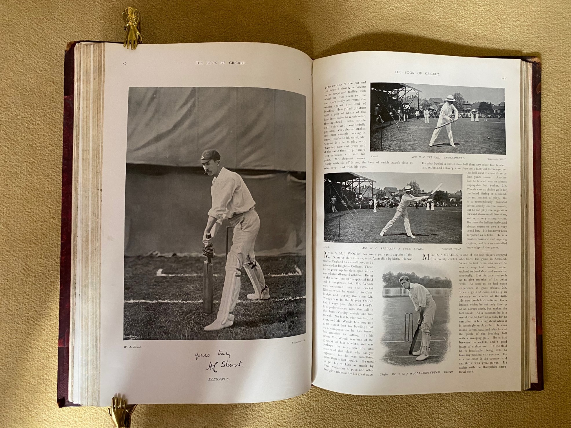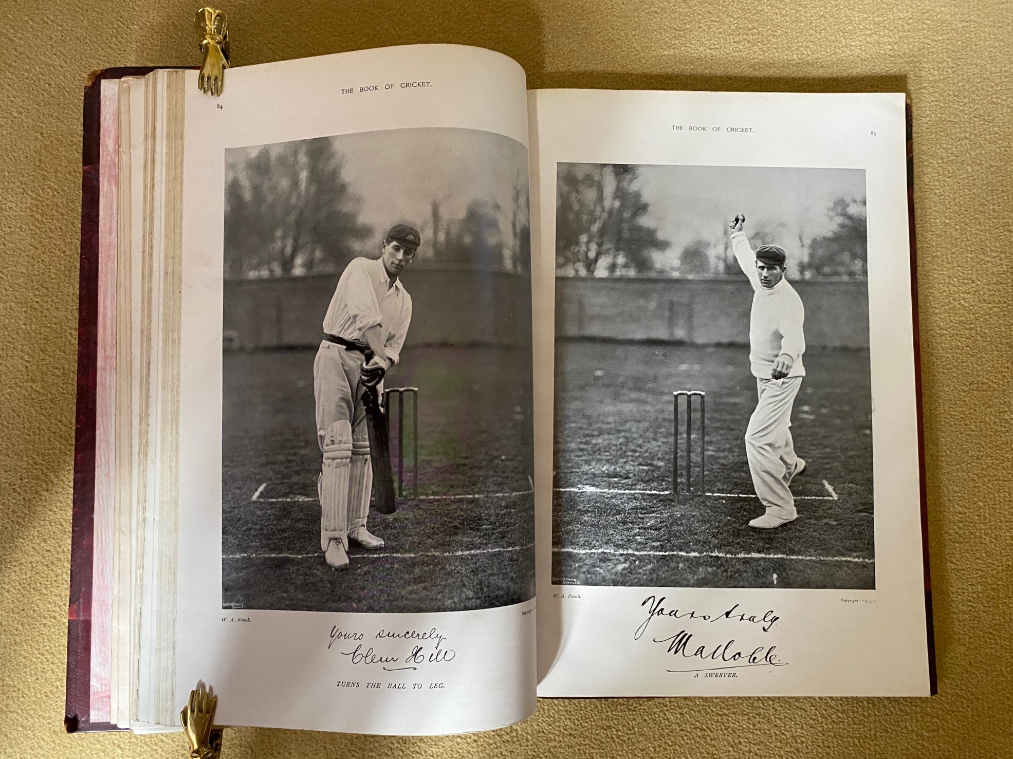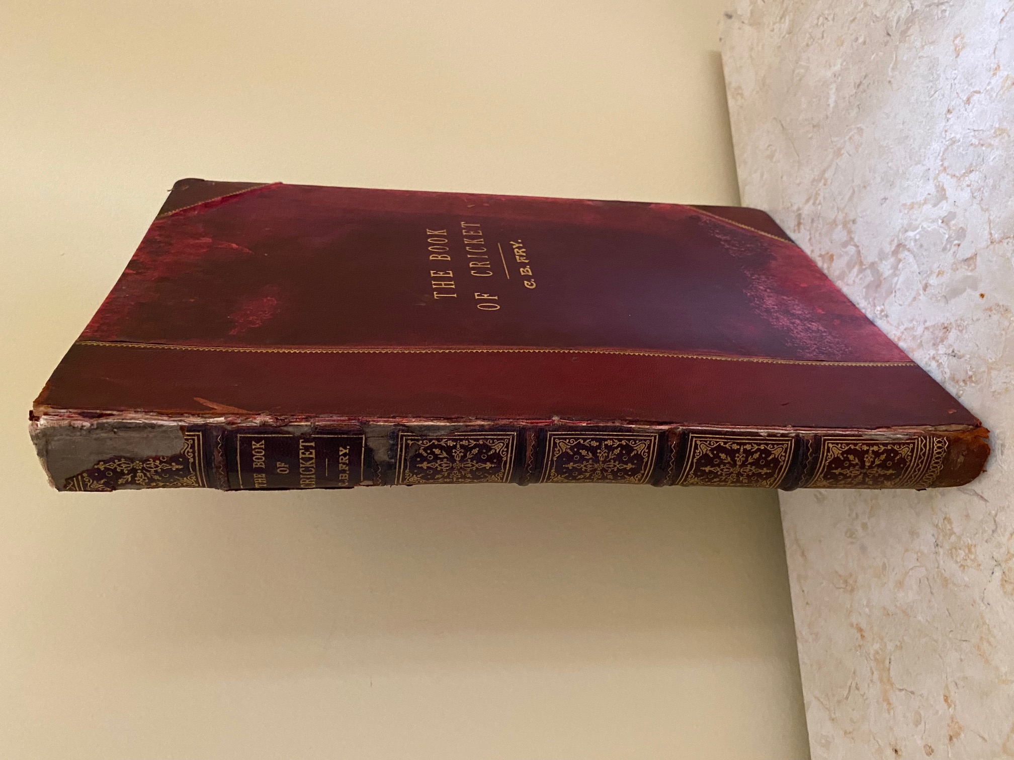 Hard back binding in contemporary half burgundy leather, the spine divided into six panels, title label to the second, gilt tools to the others, blocked gilt title to the front, burgundy silk cloth sides, olivine top edge, marble fore and lower edges, reinforced burgundy hinges, cream silk laid end papers. 4to. 13'' x 10''. Contains (iv), 256 pp with hundreds of photographs of cricketers both as single full-page plates and throughout the text including several teams. Exterior of the front hinge is cracked and repaired, the interior hinge is not cracked, pieces of leather missing to the top spine panel, damp stains to the boards, contents not affected. Heavy volume weighing 2.5 kg, extra postage will be requested over and above our default setting for destinations outside of the UK. Member of the P.B.F.A.