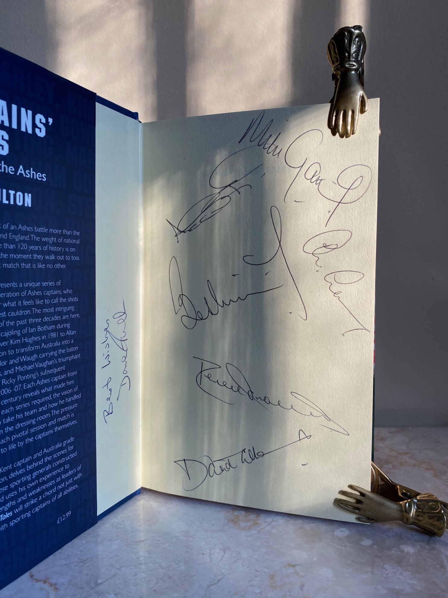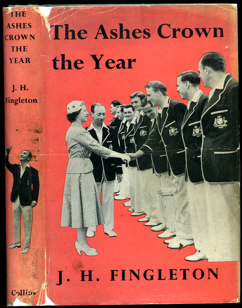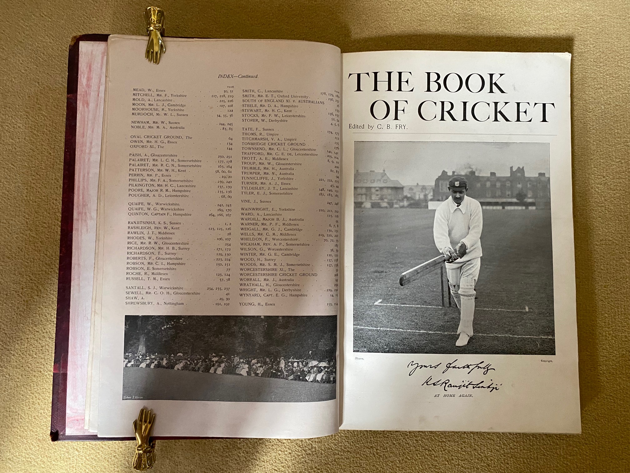Hard back binding in contemporary half burgundy leather, the spine divided into six panels, title label to the second, gilt tools to the others, blocked gilt title to the front, burgundy silk cloth sides, olivine top edge, marble fore and lower edges, reinforced burgundy hinges, cream silk laid end papers. 4to. 13'' x 10''. Contains (iv), 256 pp with hundreds of photographs of cricketers both as single full-page plates and throughout the text including several teams. Exterior of the front hinge is cracked and repaired, the interior hinge is not cracked, pieces of leather missing to the top spine panel, damp stains to the boards, contents not affected. Heavy volume weighing 2.5 kg, extra postage will be requested over and above our default setting for destinations outside of the UK. Member of the P.B.F.A.