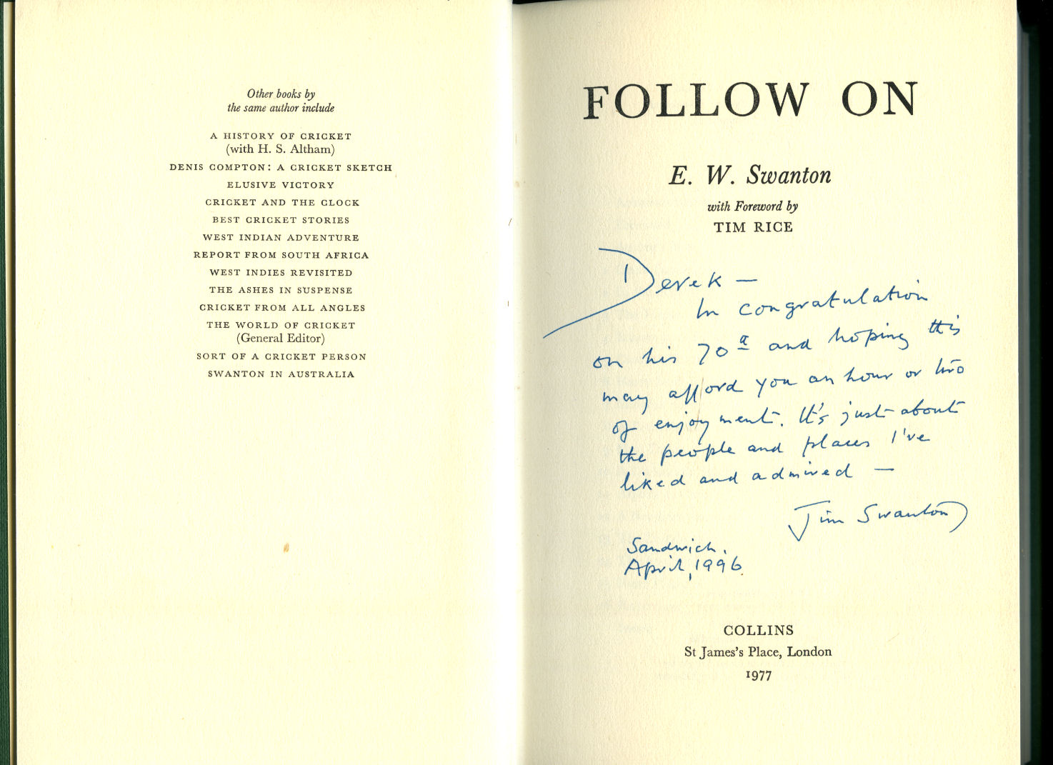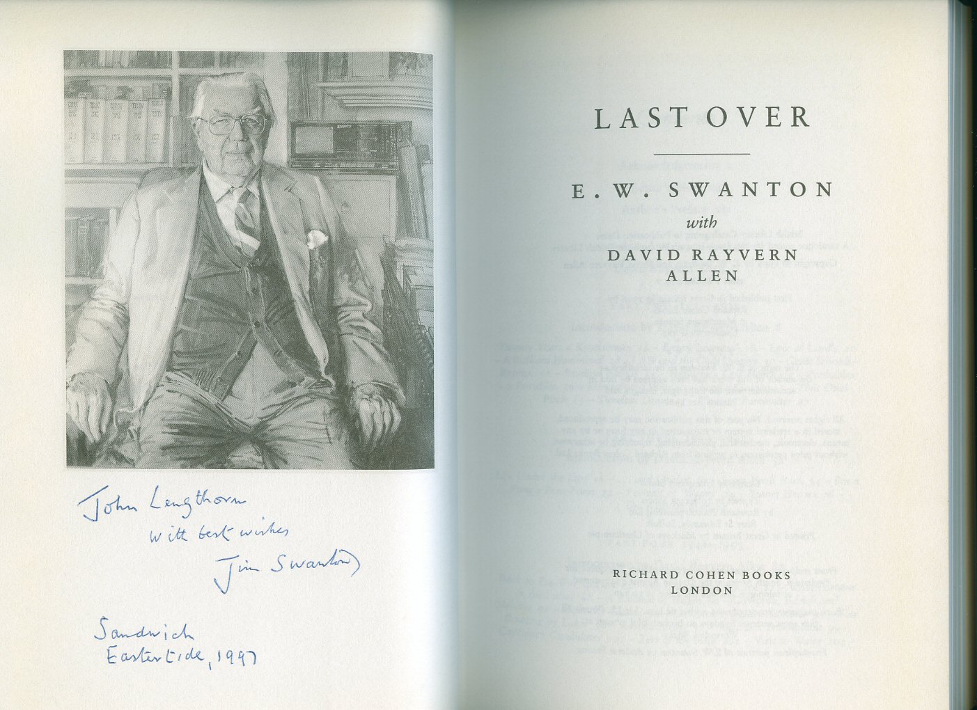 First edition hard back binding in publisher's original sage green paper covered boards, gilt title and author lettering to the spine, monochrome archive photograph end papers. 8vo. 9½'' x 6¼''. Contains 285 printed pages of text with monochrome photographs. Fine condition book in Fine condition dust wrapper, not price clipped. Loosely enclosed is letter from John Lengthorn of Stour Court in Sandwich to E. W. Swanton, asking him to sign this book. SIGNED by the author to the frontispiece 'John Lengthorn, with best wishes Jim Swanton, Sandwich, Eastertide, 1997.' Dust wrapper supplied in archive acetate film protection, this preserves and prolongs the life of the paper, it is not adhered to the book or to the dust wrapper. Member of the P.B.F.A. ISBN 1860660797