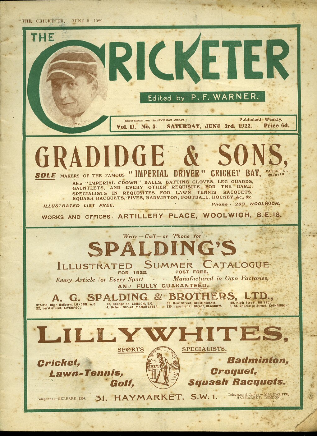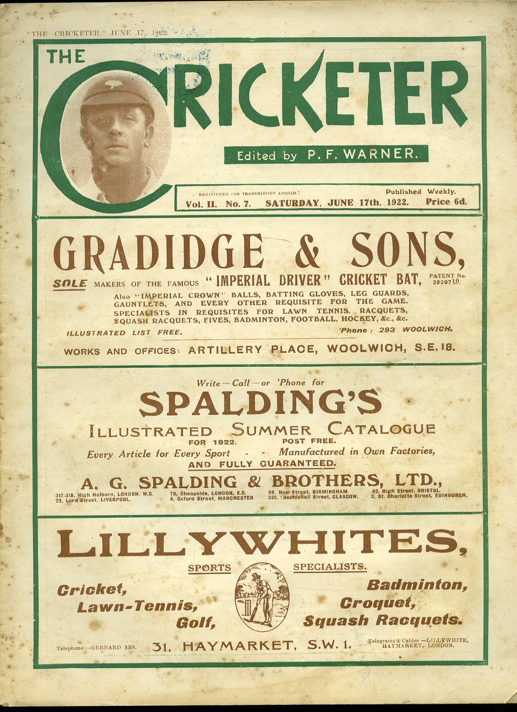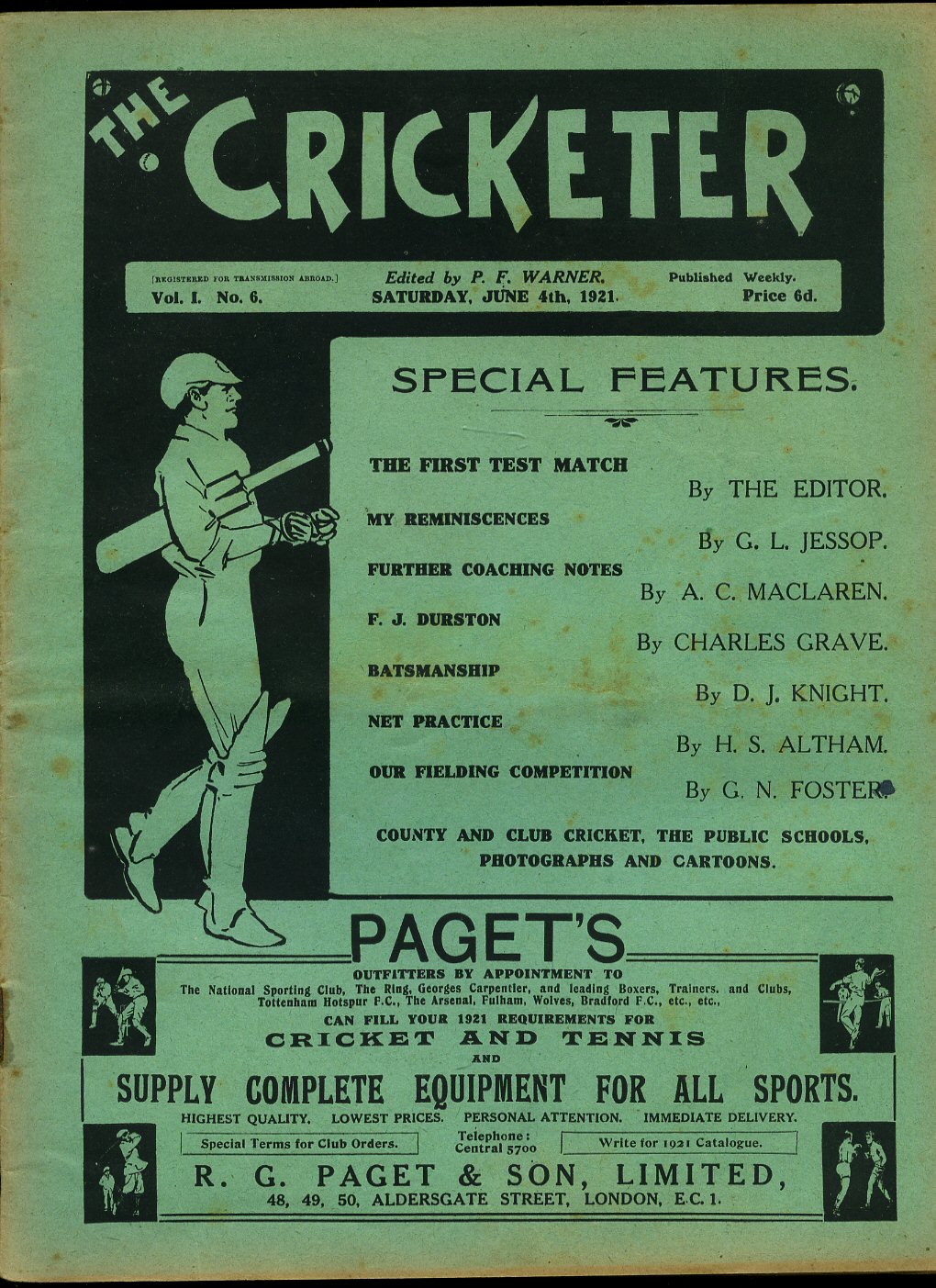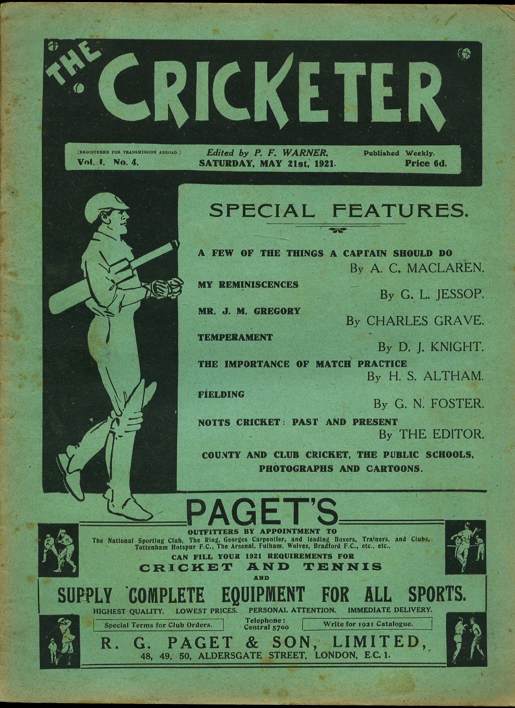 First edition in publisher's original stapled illustrated paper covers [softback]. 4to 12'' x 9''. Weekly publication with monochrome photographs depicting the cricketer's of the day, illustrated advertisements and cartoon. Warner wrote extensively on cricket. He detailed his Ashes Tests and a history of Lord's Cricket Ground. He founded The Cricketer Magazine. He was cricket correspondent of the Morning Post from 1921 to 1933, and subsequently of the Daily Telegraph. After surviving for over 80 years as an independent publication, Wisden purchased the magazine and in 2003 merged it with Wisden Cricket Monthly. Staples starting to rust but still holding, age tanning to the margins and in Good condition. We currently hold in stock 23 other Cricketer Weekly issues. Member of the P.B.F.A.