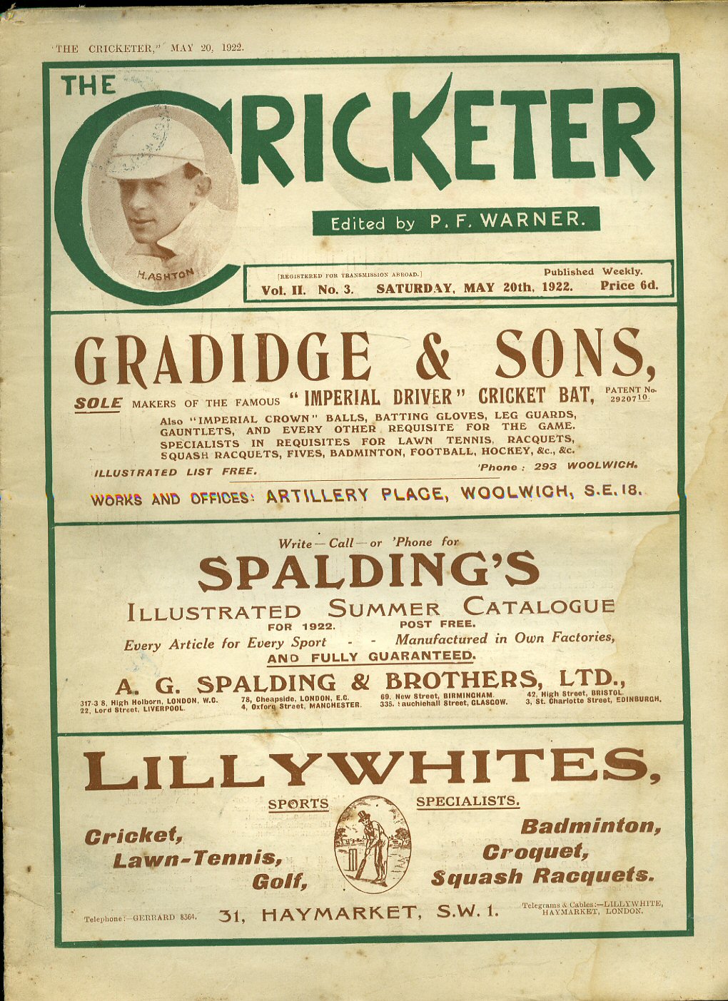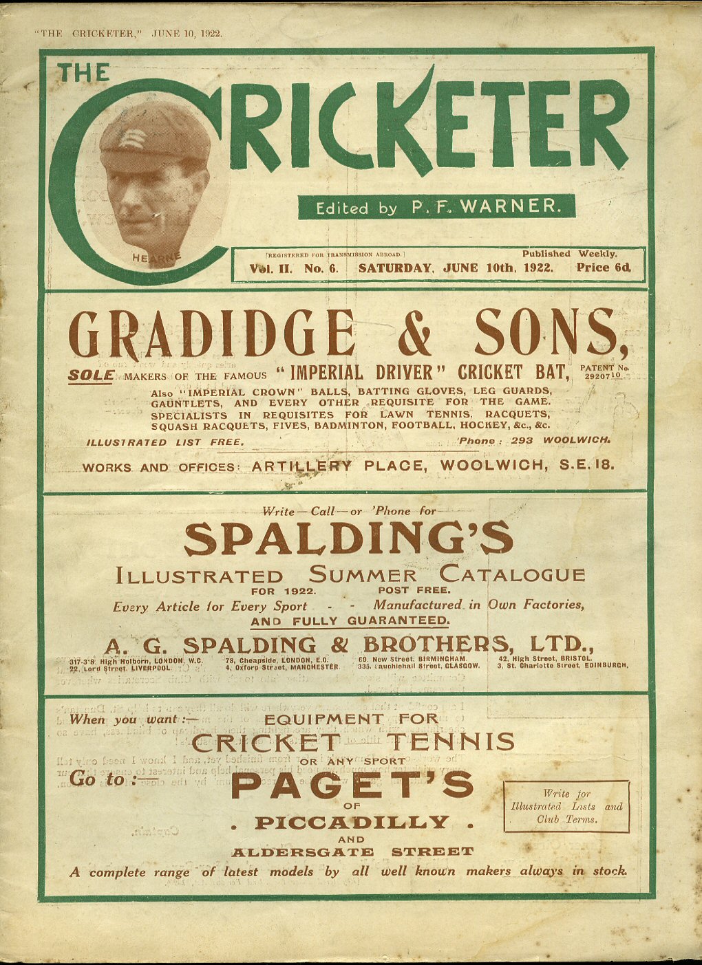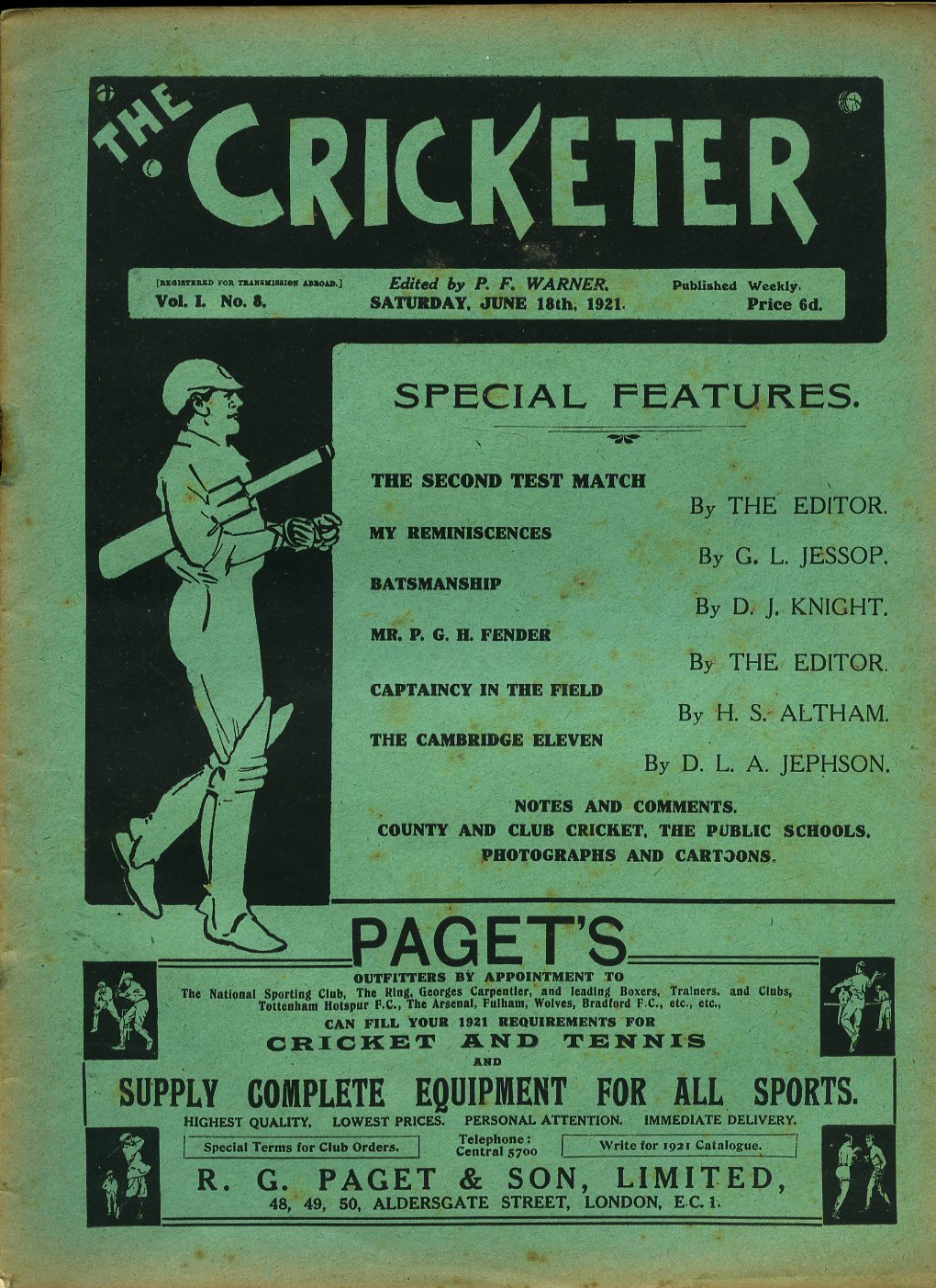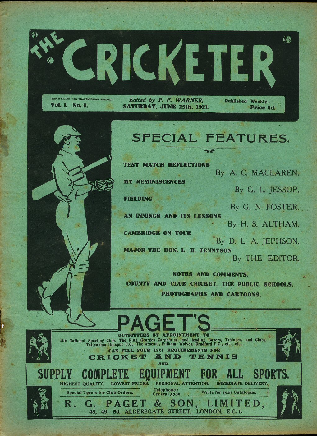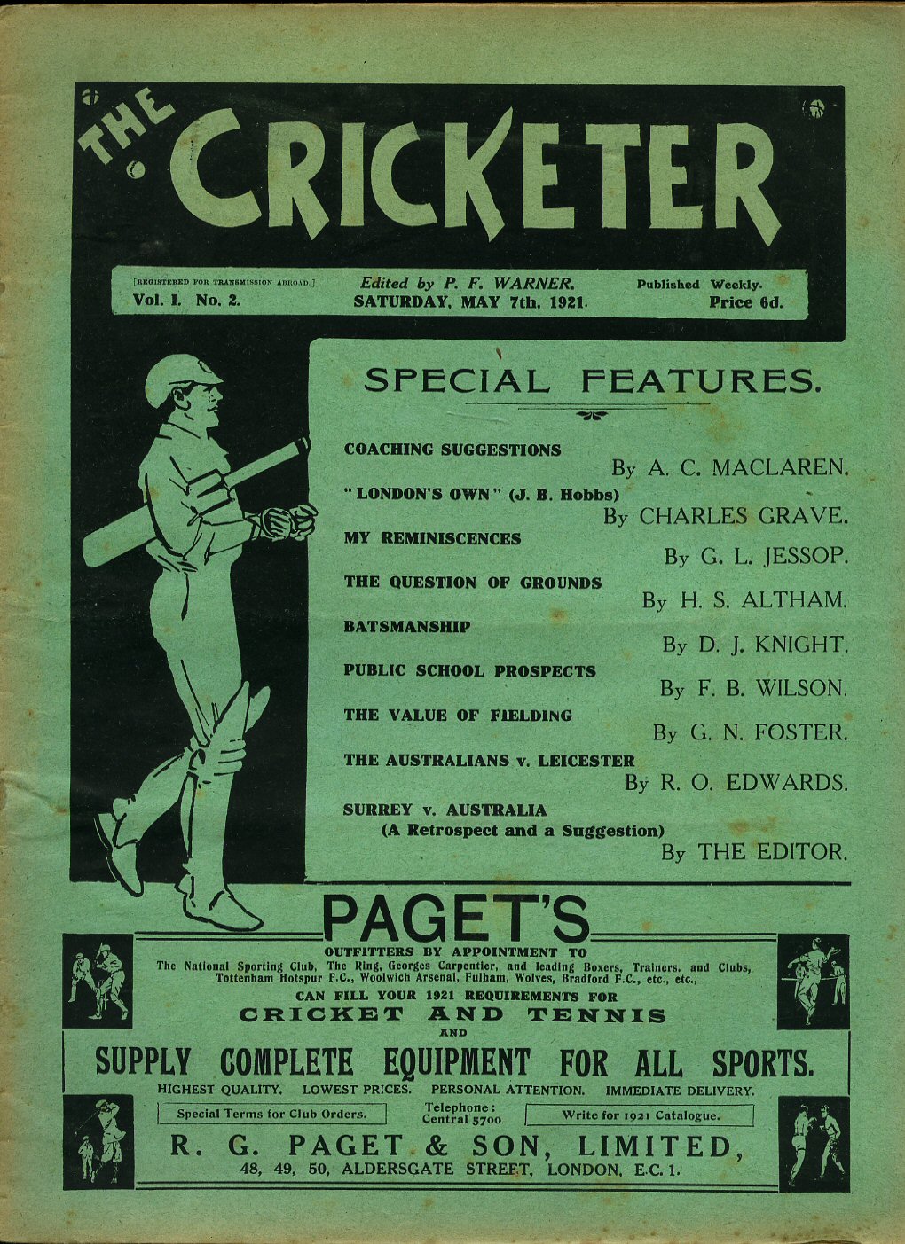 First edition in publisher's original stapled illustrated paper covers [softback]. 4to 12'' x 9''. Weekly publication with monochrome photographs depicting the cricketer's of the day, illustrated advertisements and cartoon. Warner wrote extensively on cricket. He detailed his Ashes Tests and a history of Lord's Cricket Ground. He founded The Cricketer Magazine. He was cricket correspondent of the Morning Post from 1921 to 1933, and subsequently of the Daily Telegraph. After surviving for over 80 years as an independent publication, Wisden purchased the magazine and in 2003 merged it with Wisden Cricket Monthly. Staples starting to rust but still holding, age tanning to the margins and in Good condition. We currently hold in stock 23 other Cricketer Weekly issues. Member of the P.B.F.A.