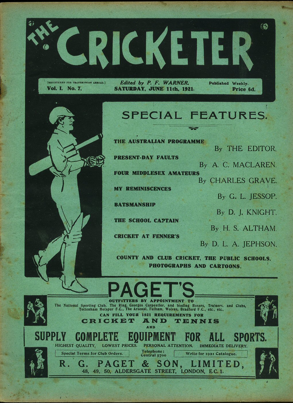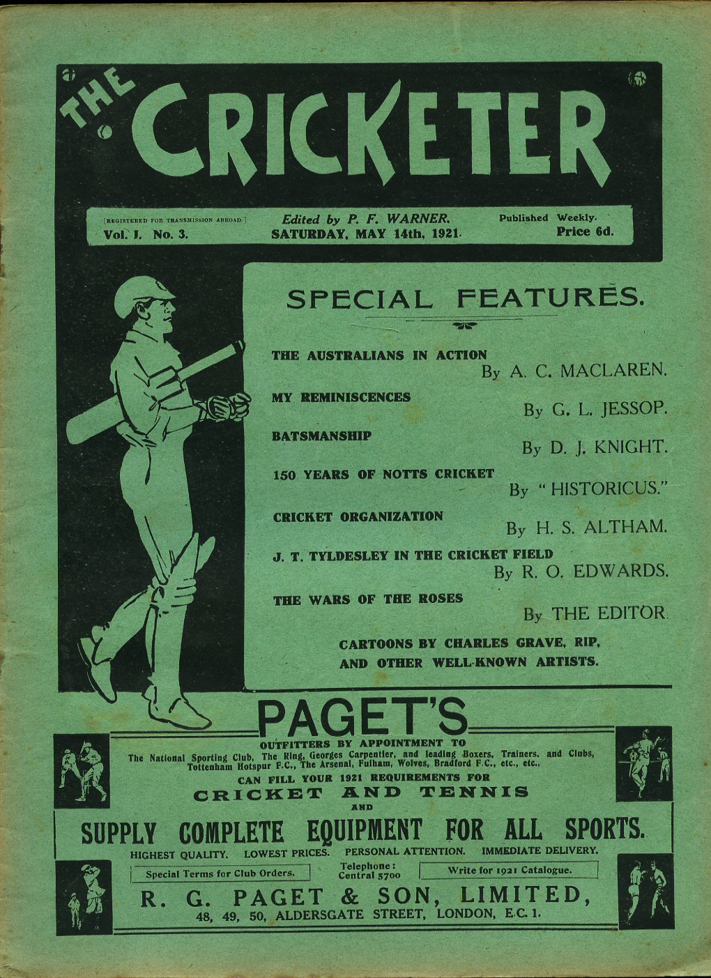 Warner, P. F. [Sir Pelham Francis Warner MBE (2 October 1873 - 30 January 1963), affectionately and better known as Plum Warner or "the Grand Old Man" of English cricket, was a Test cricketer]. He founded the magazine in 1921 and was editor until 1963. Later editors included E. W. Swanton and Christopher Martin-Jenkins. [Cartoon by Charles Shaw Baker (5 January 1883 - 16 December 1976) was an English cricketer who played first-class cricket for Warwickshire between 1905 and 1920].