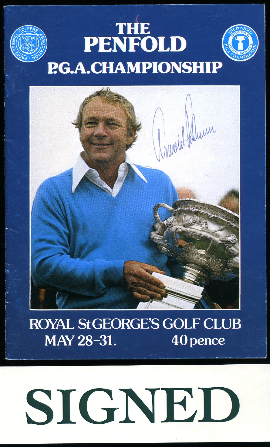 Publisher's original stapled photographic colour card wrap covers. 8vo. 8'' x 6''. Contains 24 printed pages of text with colour and monochrome photographs throughout. In Fine condition, no dust wrapper. Colour photograph of Arnold Palmer to the front cover holding the previous years trophy and SIGNED with blue ink Arnold Palmer to the white area of the sky. Member of the P.B.F.A.
