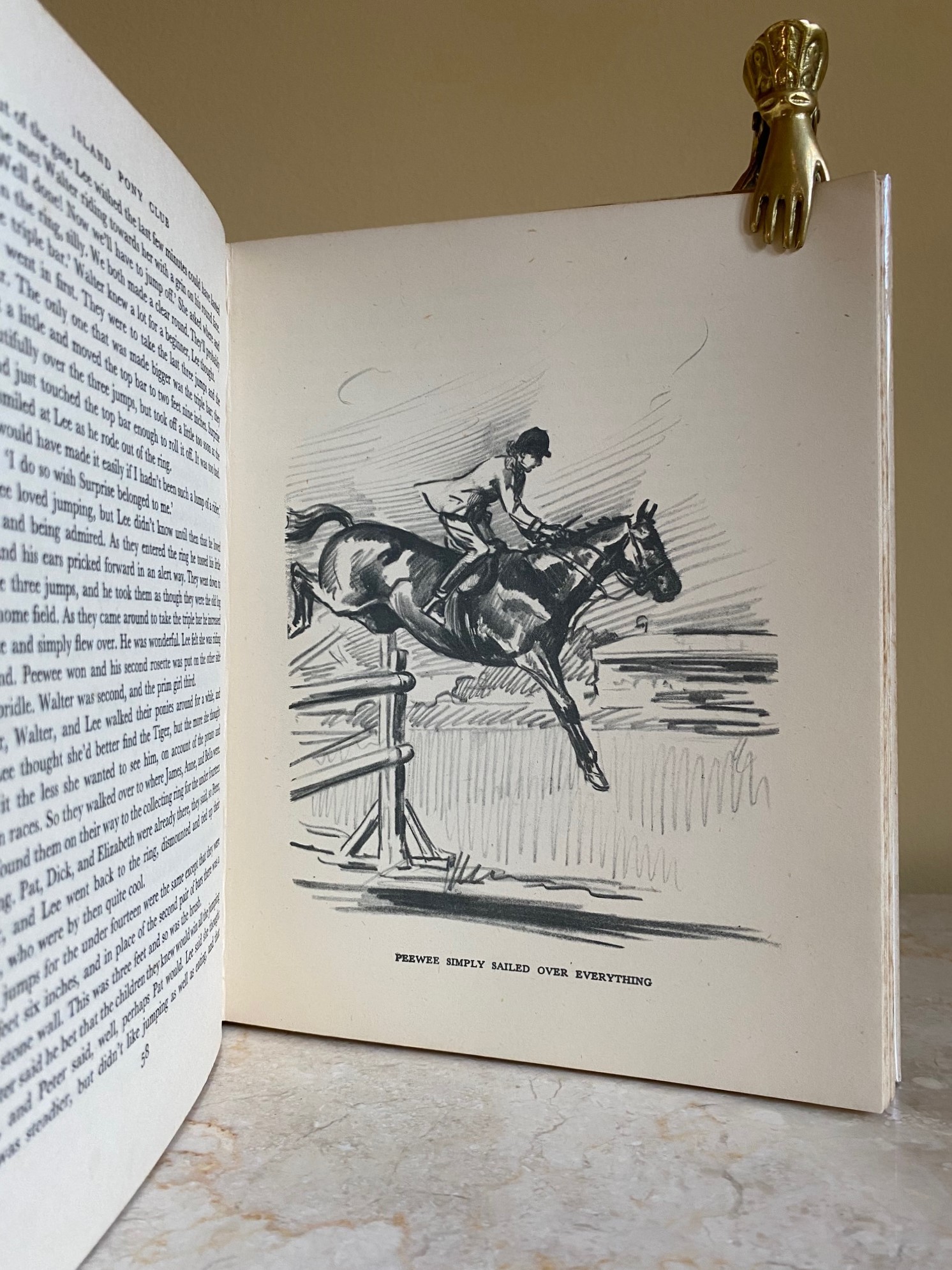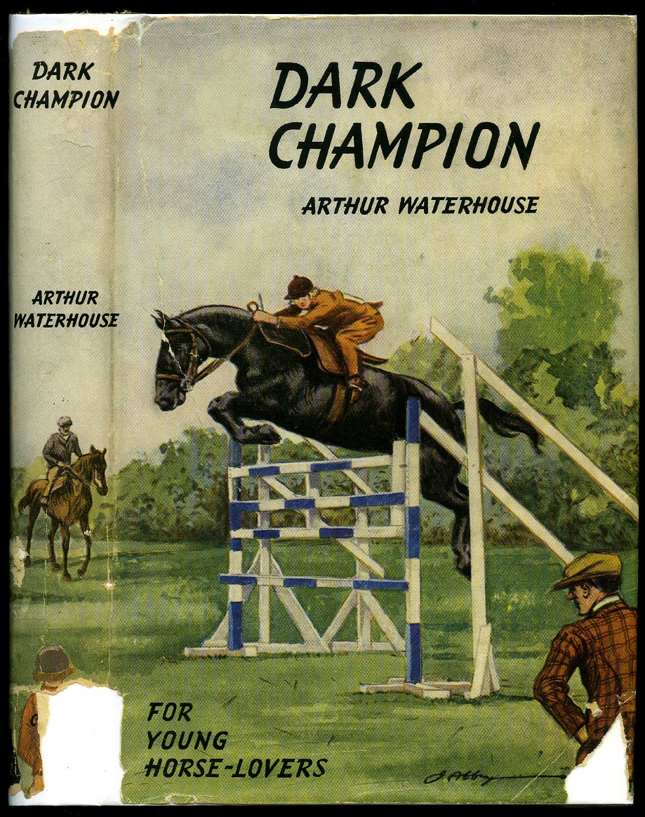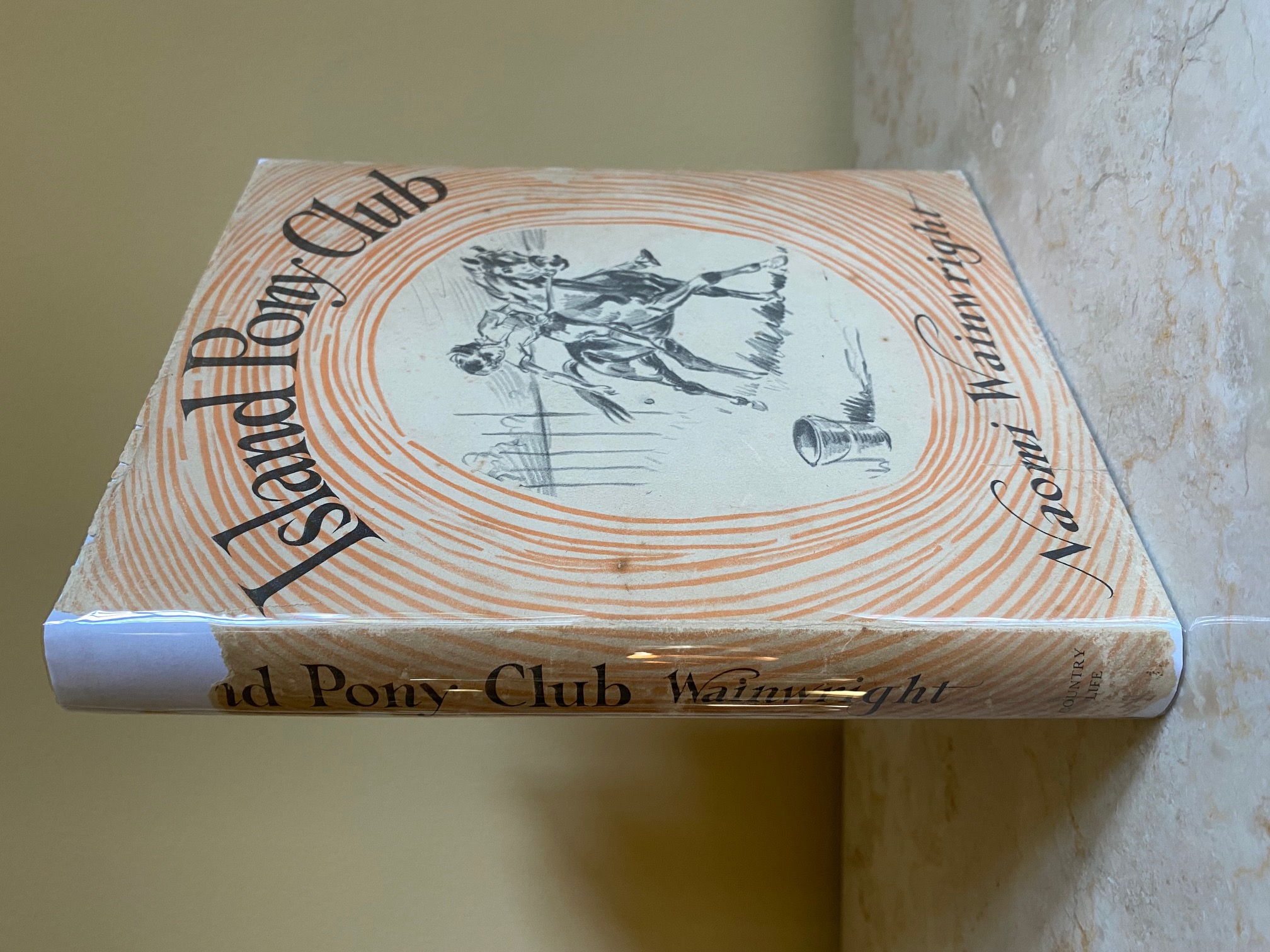 First edition hard back binding in publisher's original tan cloth covers, brown title and author lettering to the spine and to the front cover with horse-jumping illustration, illustrated end papers. 8vo. 7½'' x 5¼''. Contains 187 printed pages of text with colour frontispiece, two-tone illustrated plates and monochrome illustrations in the text. Wear to the cloth of the upper spine, lower spine end softened, tan age spots to some of the early pages and foxing to the closed edges. Very Good condition book in near Very Good condition art work dust wrapper with 40 mm piece of paper missing to the foot of the spine, chips to the corners and upper spine end, not price clipped 6/-. Dust wrapper supplied in archive acetate film protection, it does not adhere to the book or to the dust wrapper. Member of the P.B.F.A.