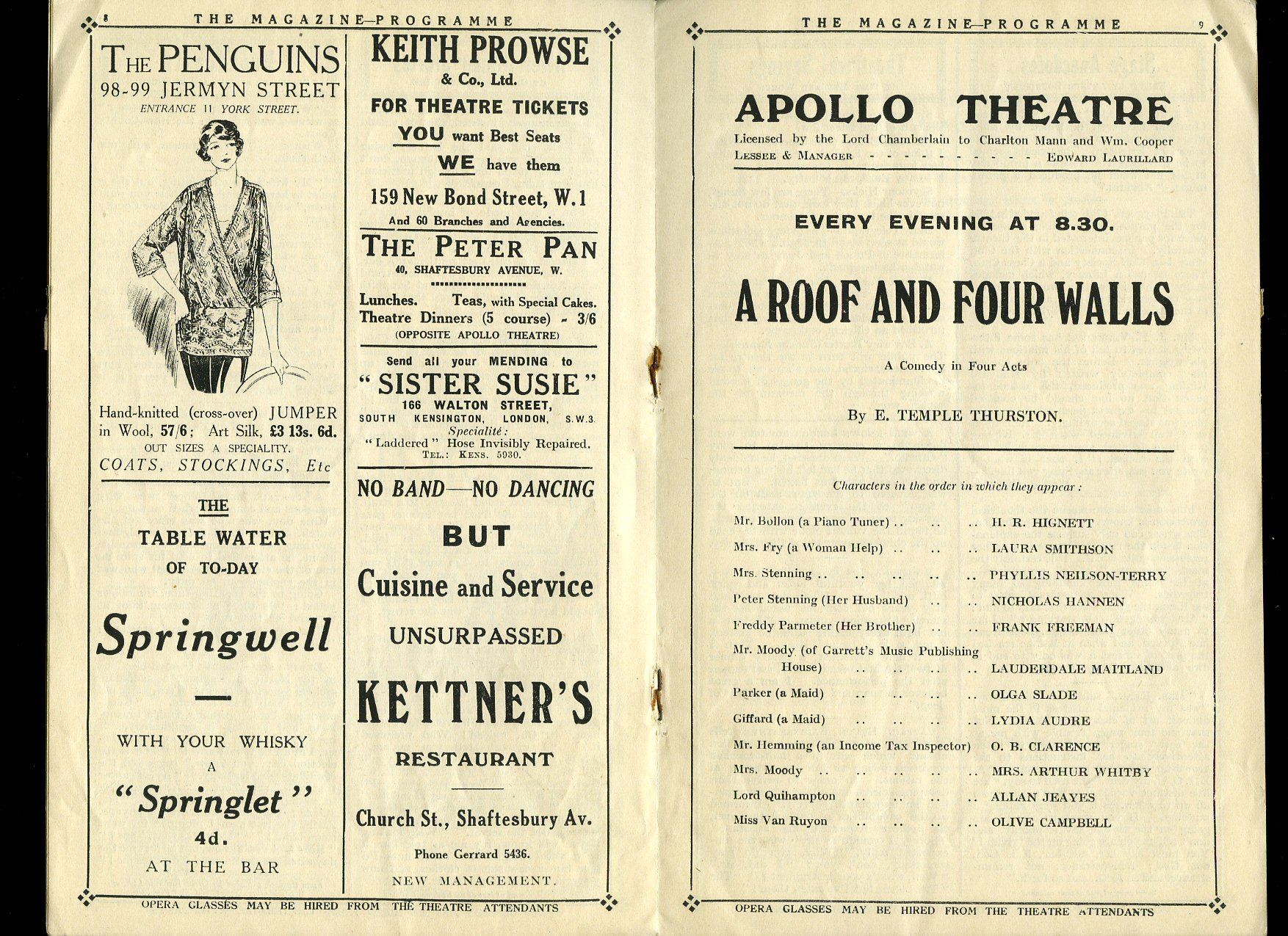 A Roof and Four Walls: Souvenir Theatre Programme Performed at Apollo Theatre, Shaftesbury Avenue, London