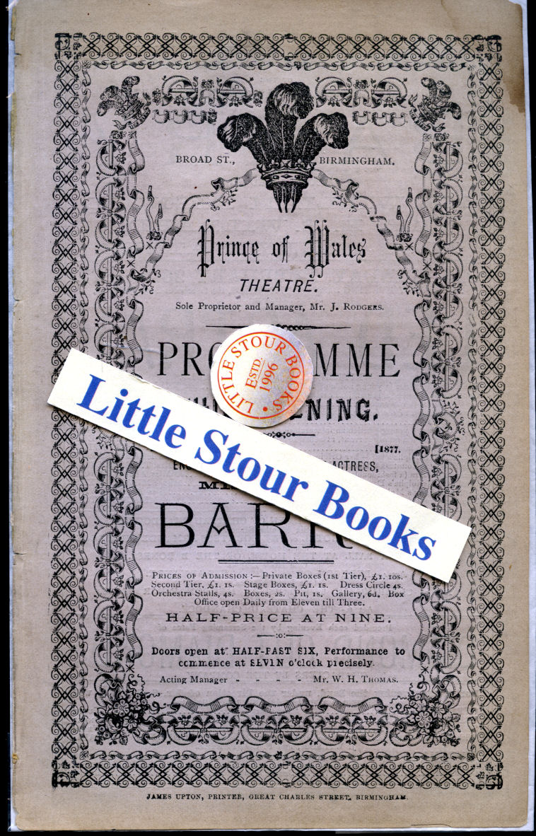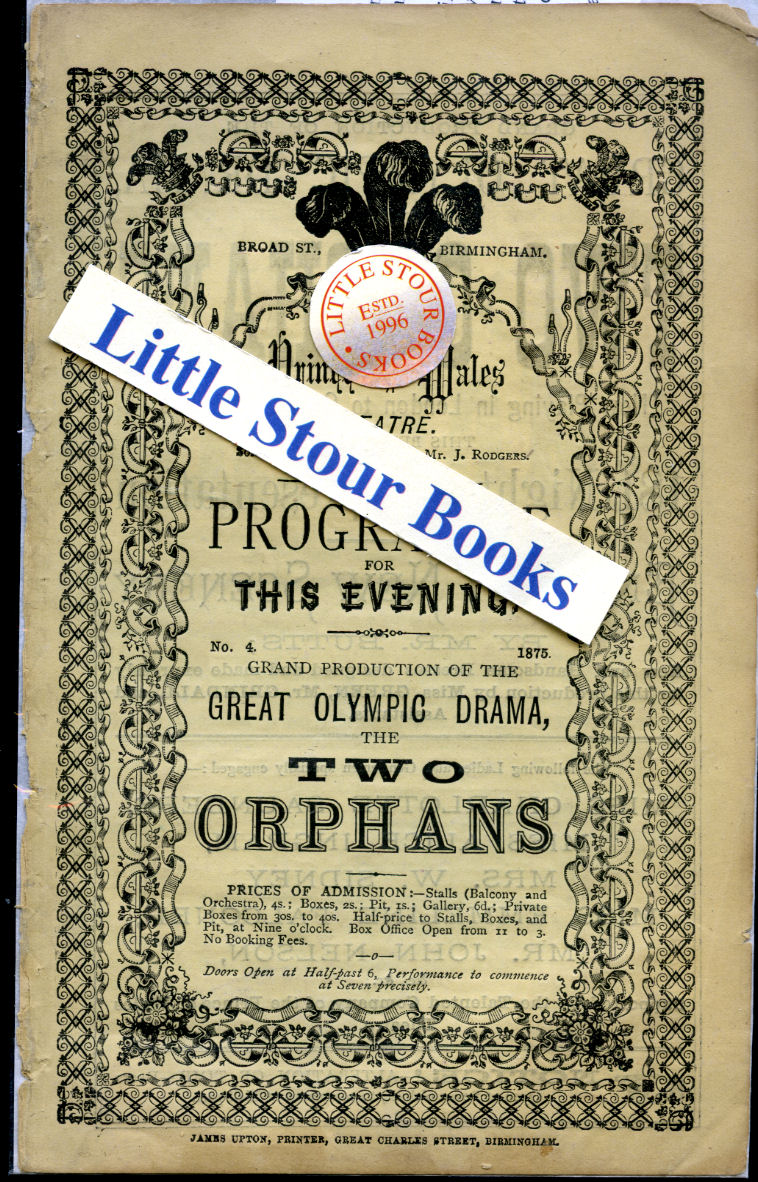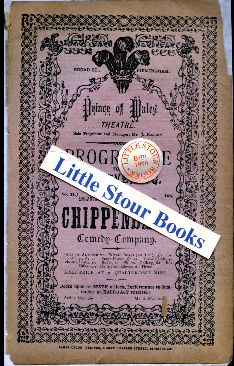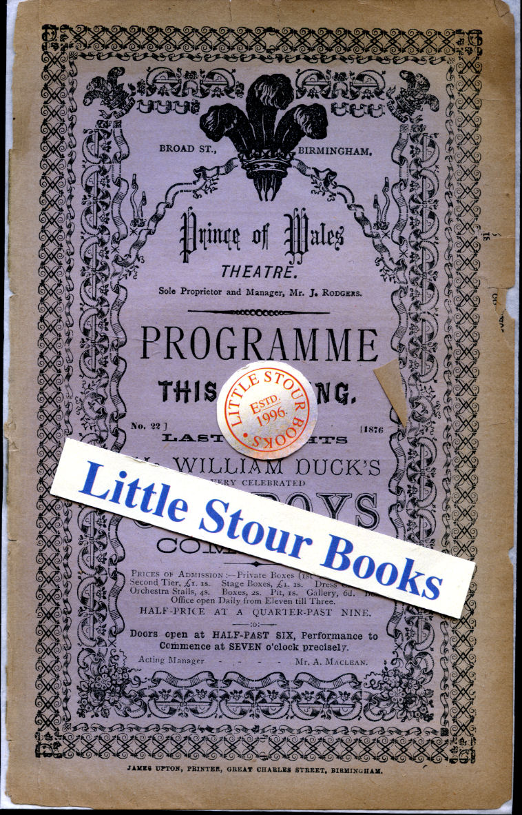 Original fragile folded theatre programme. 8vo. 8'' x 5''. The Prince of Wales Theatre was built on Broad Street, Birmingham at a cost of £12,000, and opened on the 3rd of September 1856 as the Royal Music Hall with a production of 'The Messiah.' When W. H. Swanborough bought the Theatre from its original owner, James Scott, in 1862 he renamed the building the Prince of Wales Operetta House. It was named Prince of Wales Operetta House after the marriage of the then Prince of Wales, Edward the VII. However, the Operetta House part of the name was dropped some years later in 1865 when the name became the simpler Prince of Wales Theatre (Arthur Lloyd). Extremely delicate four sided folded programme with text to all four sides. Looks as if it was disbound with small stitched holes to the left margin. Member of the P.B.F.A.